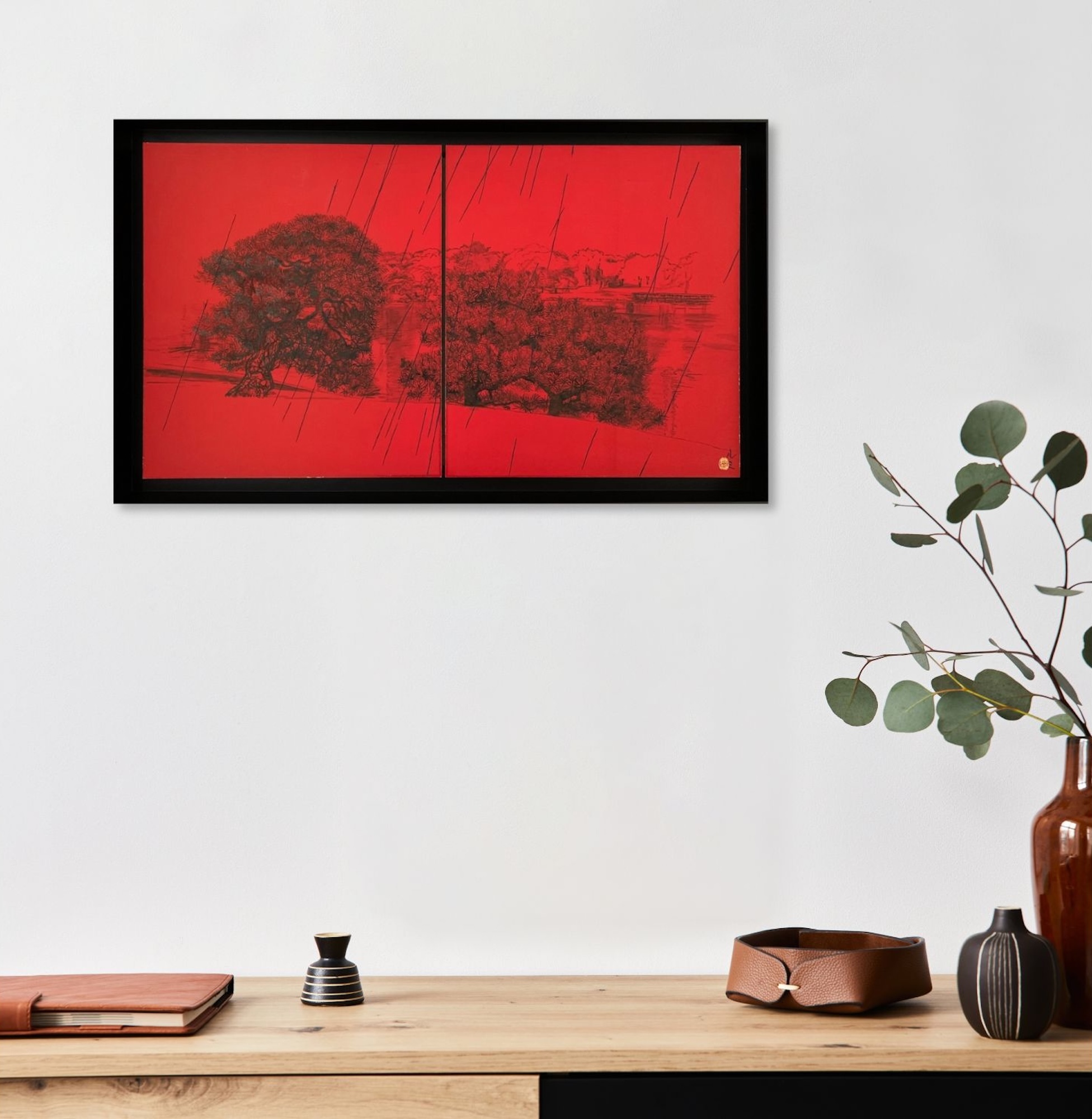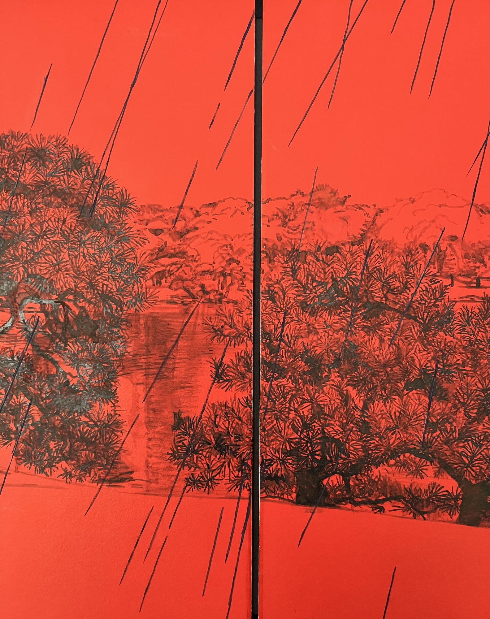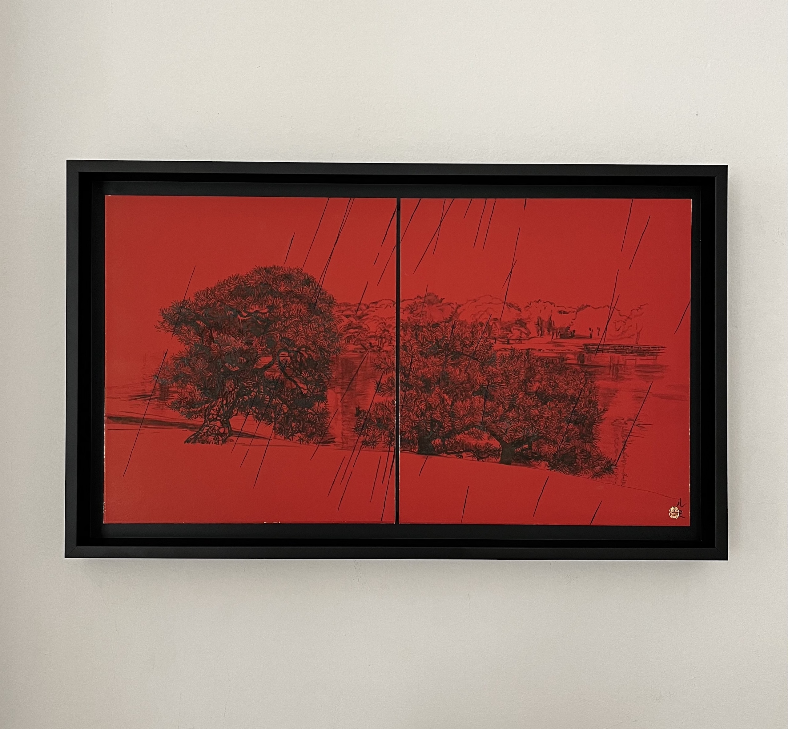 La composition s’articule autour d’un paysage pittoresque, probablement un parc, mettant en scène deux pins majestueux rendus avec un détail sombre et minutieux. On distingue également de l’eau, un feuillage lointain et un petit pont, esquissés subtilement derrière les sujets principaux. L’ensemble de cette vue panoramique contraste vivement avec le fond rouge vibrant et omniprésent. Ce rouge intense crée une atmosphère à la fois dramatique et intemporelle. L’œuvre est divisée en deux, une caractéristique fréquente de la peinture japonaise, bien que le sujet relie harmonieusement les deux panneaux. L’élément déterminant de cette pièce réside dans le thème éponyme : la pluie. De longues lignes diagonales noires traversent toute la composition, représentant une averse dense qui unit le ciel rouge profond au paysage détaillé en dessous. Ce motif de pluie battante introduit une sensation de mélancolie, d’introspection silencieuse et de mouvement.
