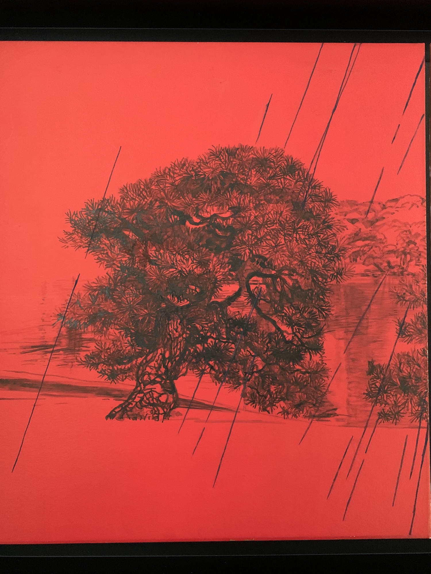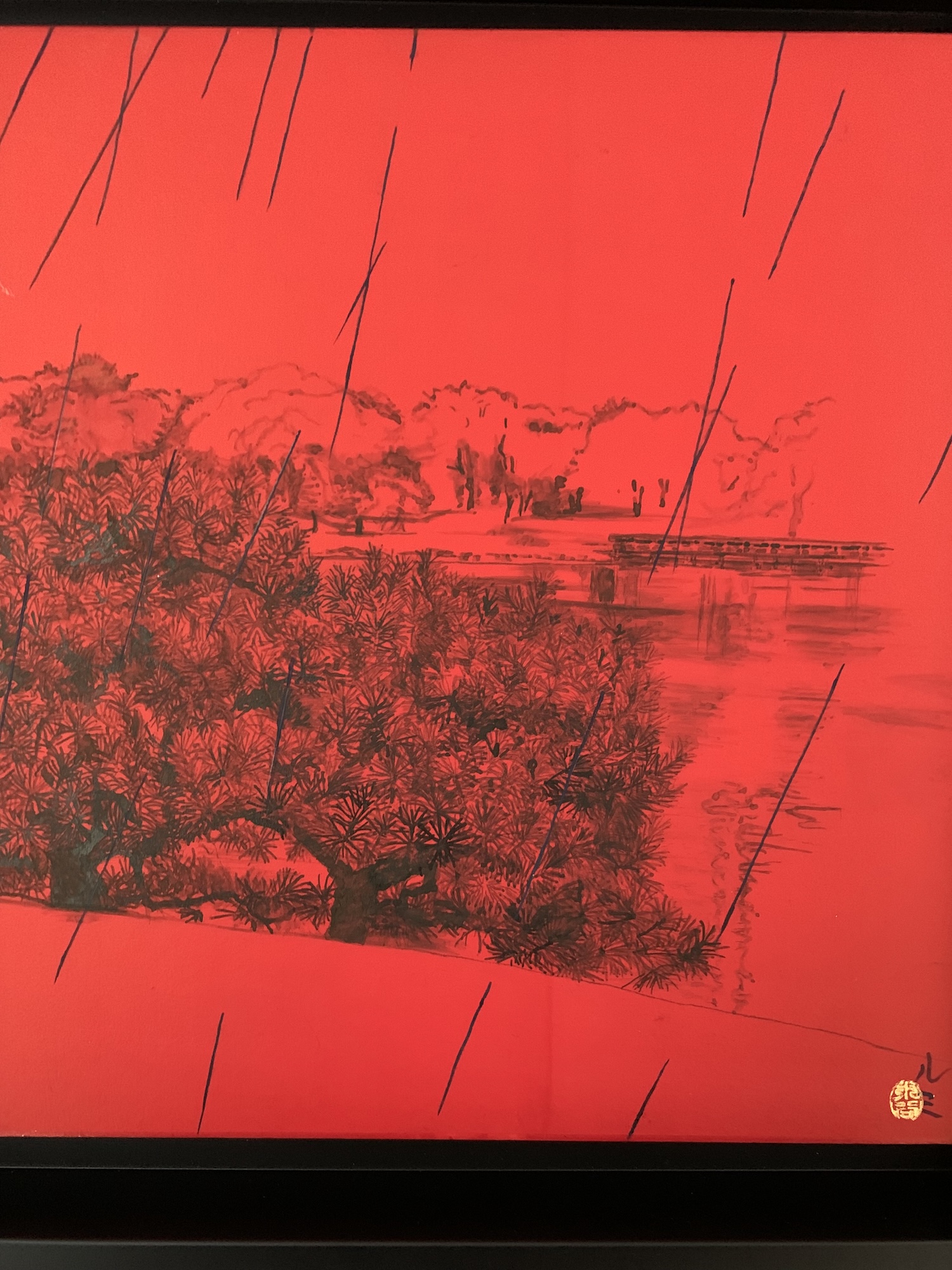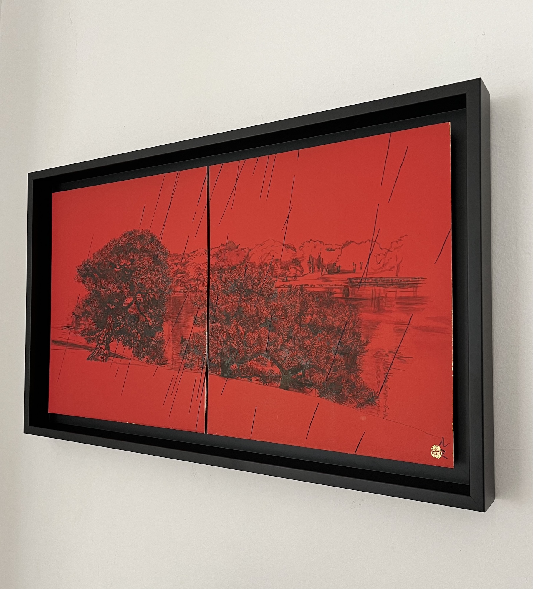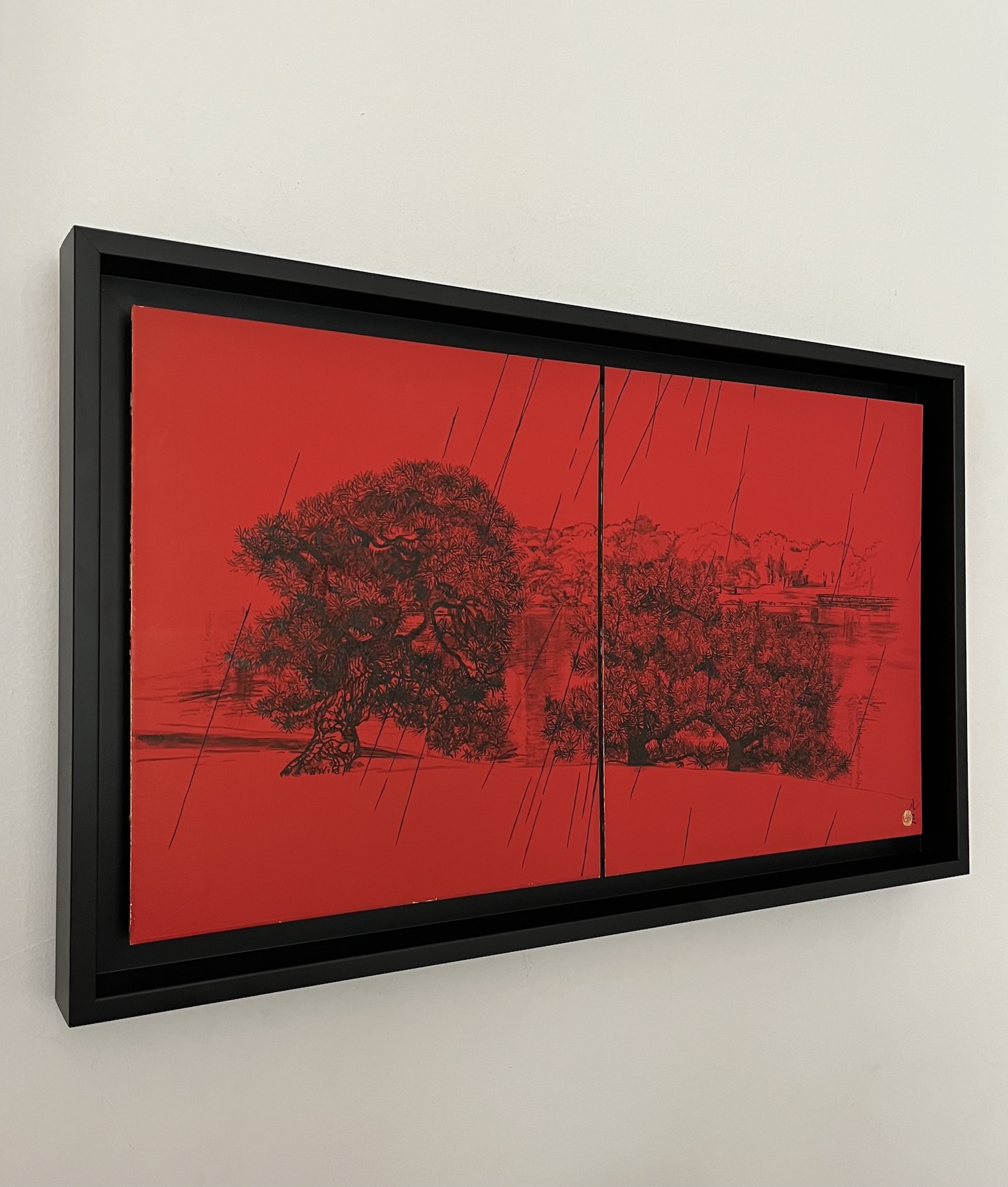 La composition s’articule autour d’un paysage pittoresque, probablement un parc, mettant en scène deux pins majestueux rendus avec un détail sombre et minutieux. On distingue également de l’eau, un feuillage lointain et un petit pont, esquissés subtilement derrière les sujets principaux. L’ensemble de cette vue panoramique contraste vivement avec le fond rouge vibrant et omniprésent. Ce rouge intense crée une atmosphère à la fois dramatique et intemporelle. L’œuvre est divisée en deux, une caractéristique fréquente de la peinture japonaise, bien que le sujet relie harmonieusement les deux panneaux. L’élément déterminant de cette pièce réside dans le thème éponyme : la pluie. De longues lignes diagonales noires traversent toute la composition, représentant une averse dense qui unit le ciel rouge profond au paysage détaillé en dessous. Ce motif de pluie battante introduit une sensation de mélancolie, d’introspection silencieuse et de mouvement.