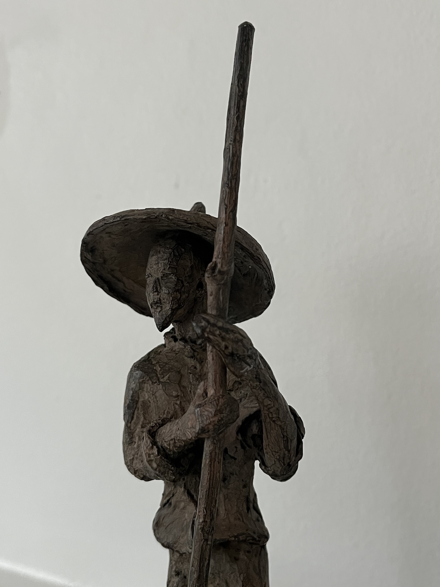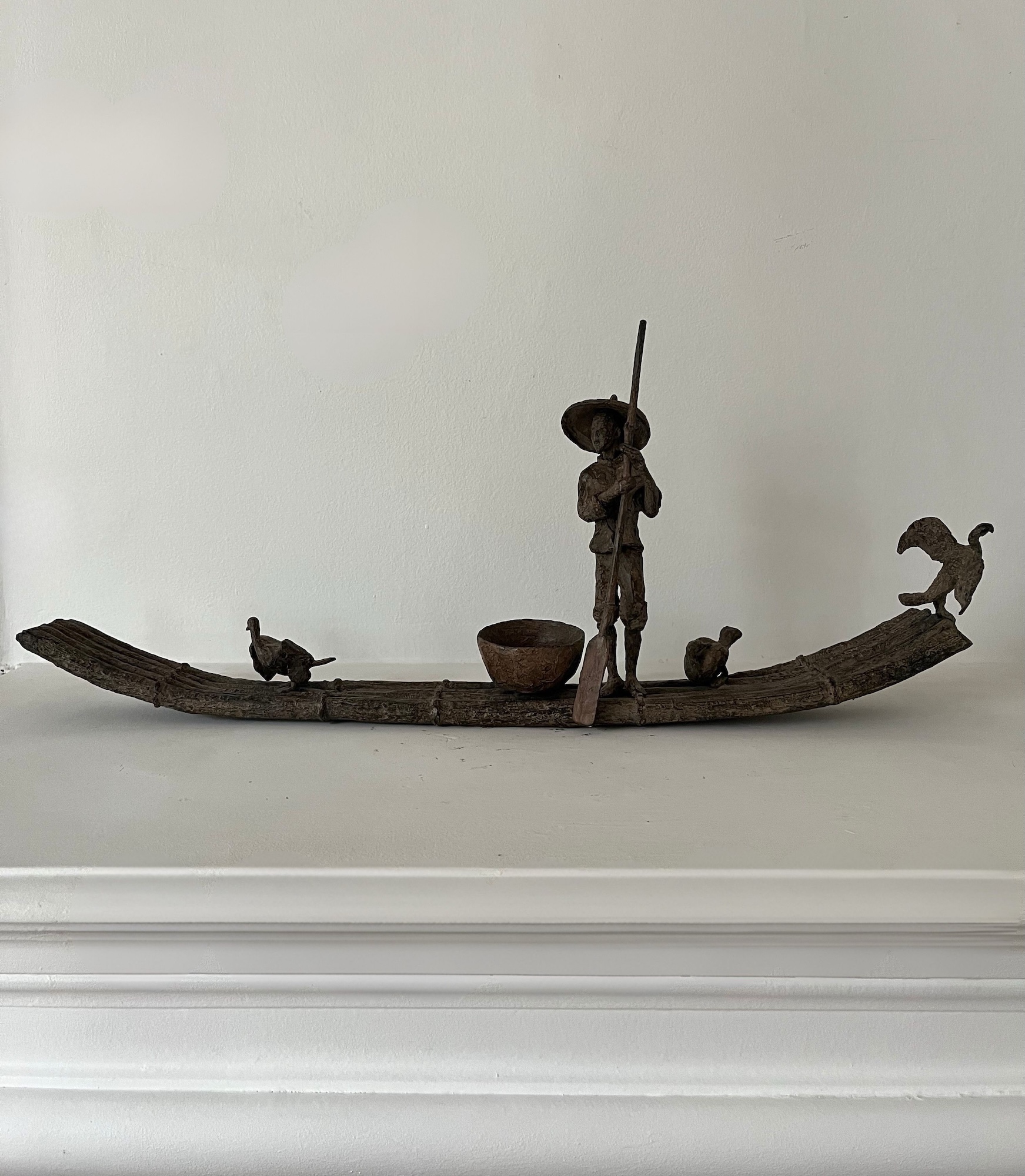 Pêche aux cormorans est une sculpture en bronze de l’artiste contemporaine française Marine de Soos. Cette œuvre d’art figuratif montre un pêcheur, simplement habillé et portant un gros chapeau, en train de conduire une pirogue à l’aide d’une pagaie. L’homme pratique la pêche au cormoran, caractéristique de la Chine et du Japon. Inspirée d’une scène de vie imaginaire ou vécue par l’artiste, cette figure en bronze, de taille moyenne, peut être installée à l’extérieur.