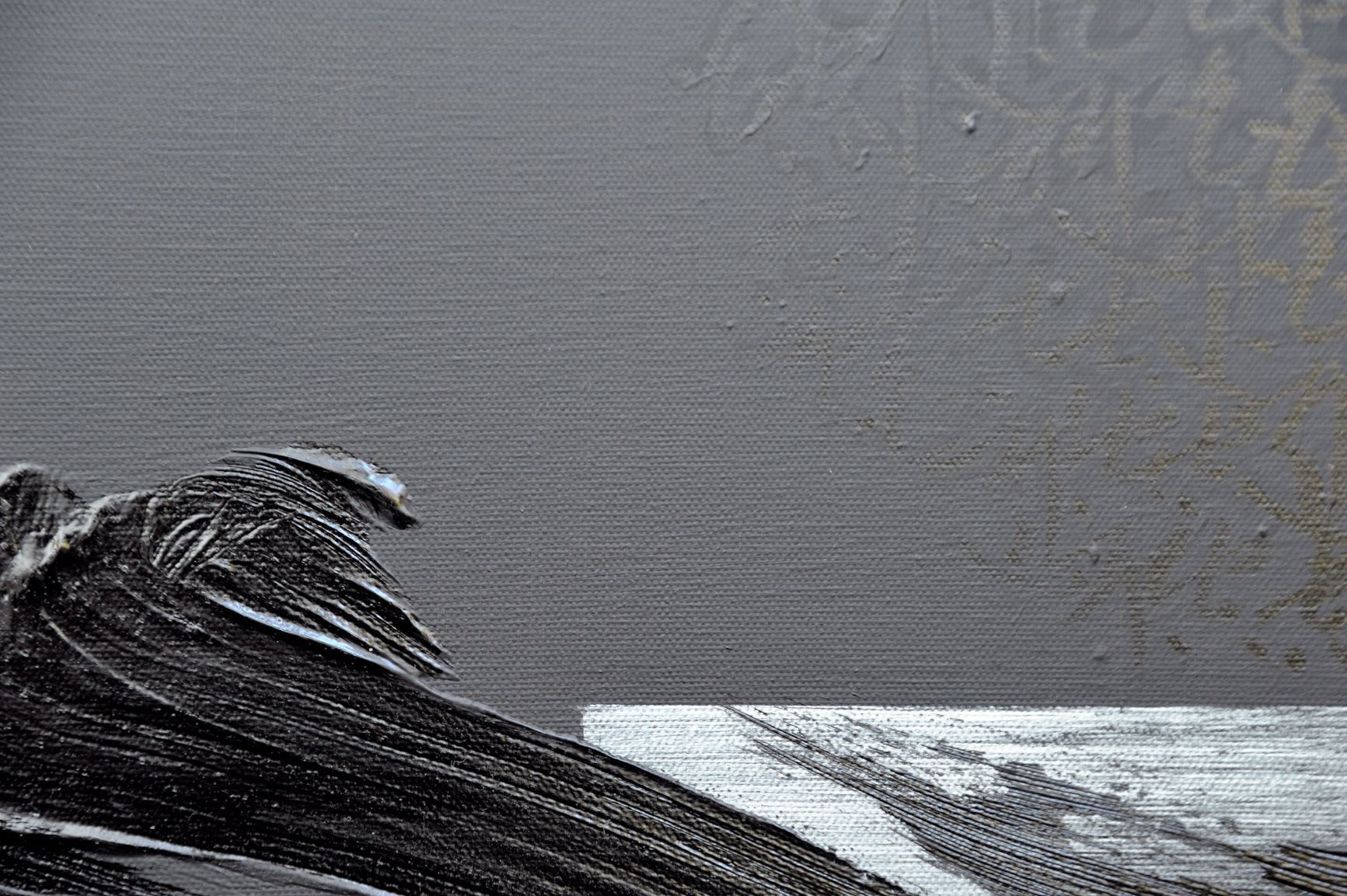 Cette œuvre d’art appartient à un registre abstrait et puise ses ressources dans la calligraphie japonaise. Les coups de pinceau, vigoureux et en même temps élégants, sont bien visibles et suggèrent la gestuelle du peintre. Les couleurs noir et blanc se croisent sur la toile en créant des superpositions et des transparences. Cette peinture, réalisée à l’encre et à l’acrylique, semble diffuser une sorte d’énergie et en même temps inviter à la méditation.