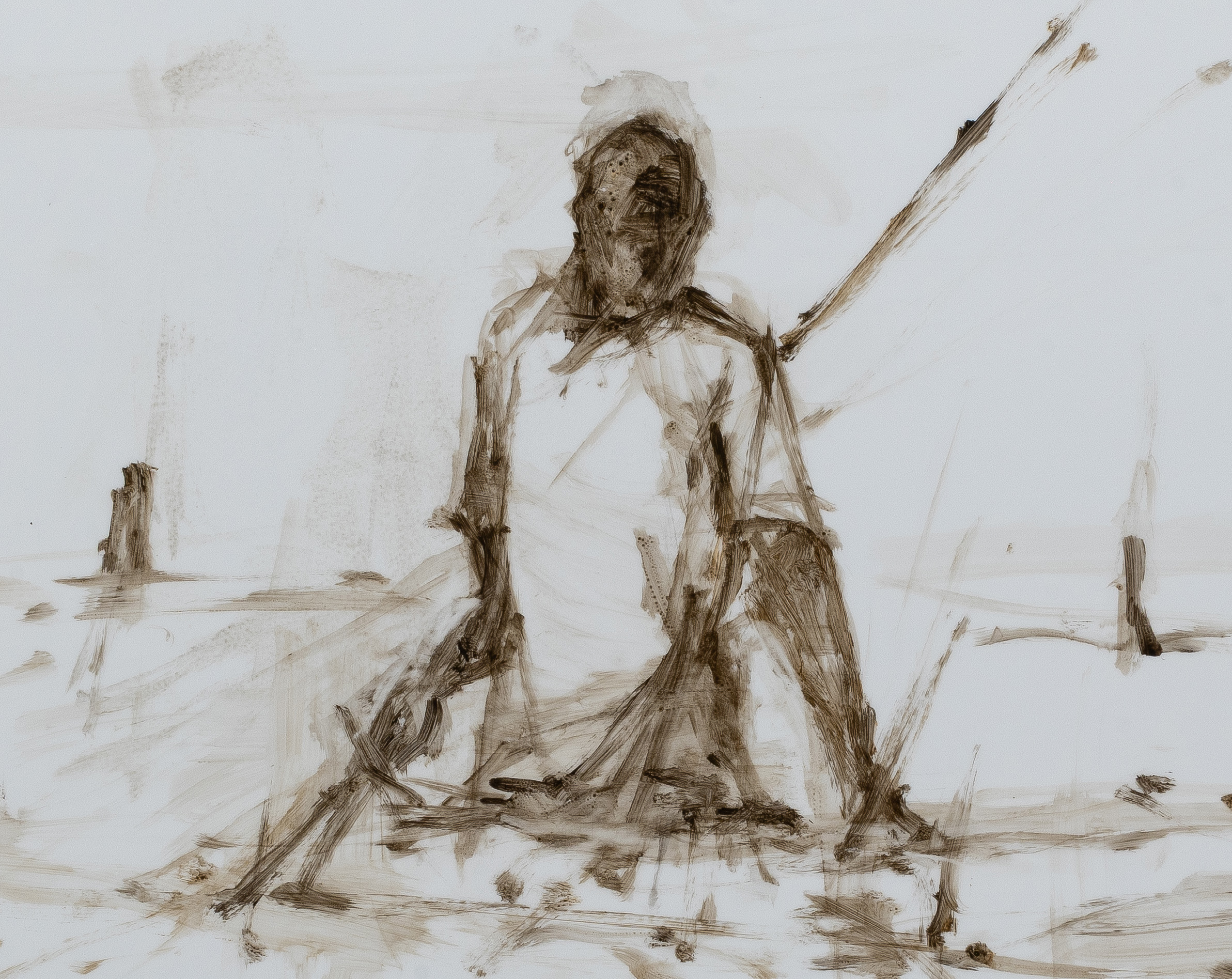 Cette œuvre d’art représente un homme, à moitié immergé dans l’eau, tirant un filet de pêche. Le dessin est brut et rapide, l’artiste capture par le geste vif du pinceau l’activité du pêcheur, les ondulations de l’eau et le filet de pêche, dans un tableau proche de l’Impressionnisme.
