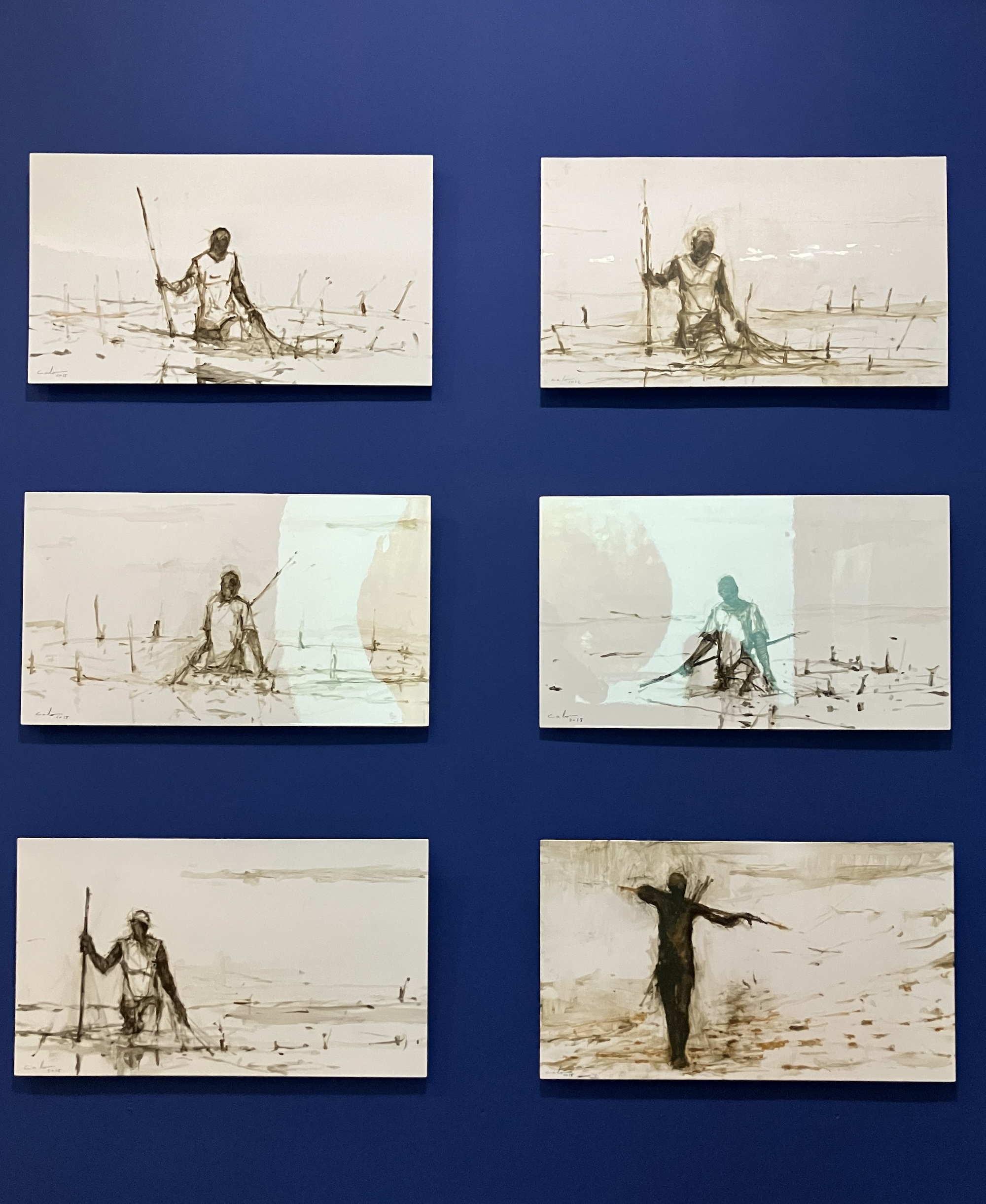 Pescadores de hierro N2, est une peinture figurative de l’artiste contemporain espagnol Calo Carratalá. Cette œuvre d’art représente un homme, à moitié immergé dans l’eau, tirant un filet de pêche. Le dessin est brut et rapide, l’artiste capture par le geste vif du pinceau l’activité du pêcheur, les ondulations de l’eau et le filet de pêche.