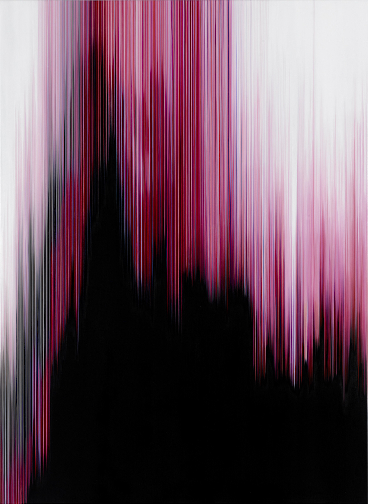 Inspirée par un phénomène numérique, la notion d’abstraction est au centre de la série Pink Paintings. Le tracé de lignes parallèles, caractéristique du travail de l’artiste, imite ici l’image produite par le disfonctionnement d’une caméra numérique dont le violet foncé hypnotise. Derrière ces peintures à l’huile résolument abstraites se cache une tendance à la figuration qui émerge par association d’idée ; la combinaison de la lumière et de la couleur peut créer des images de paysages, de bâtiments ou encore de figures. Pour cette série, l’artiste choisi de travailler sur toile afin d’accentuer la différence entre ses œuvres et les images numériques qui les inspirent ; l’organique s’oppose dès lors à l’austérité du pixel.