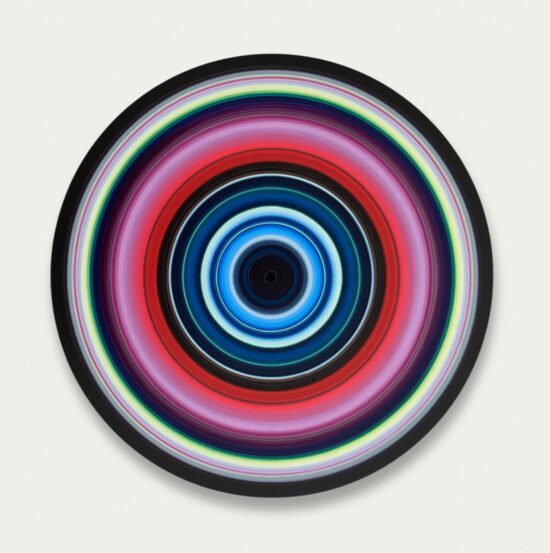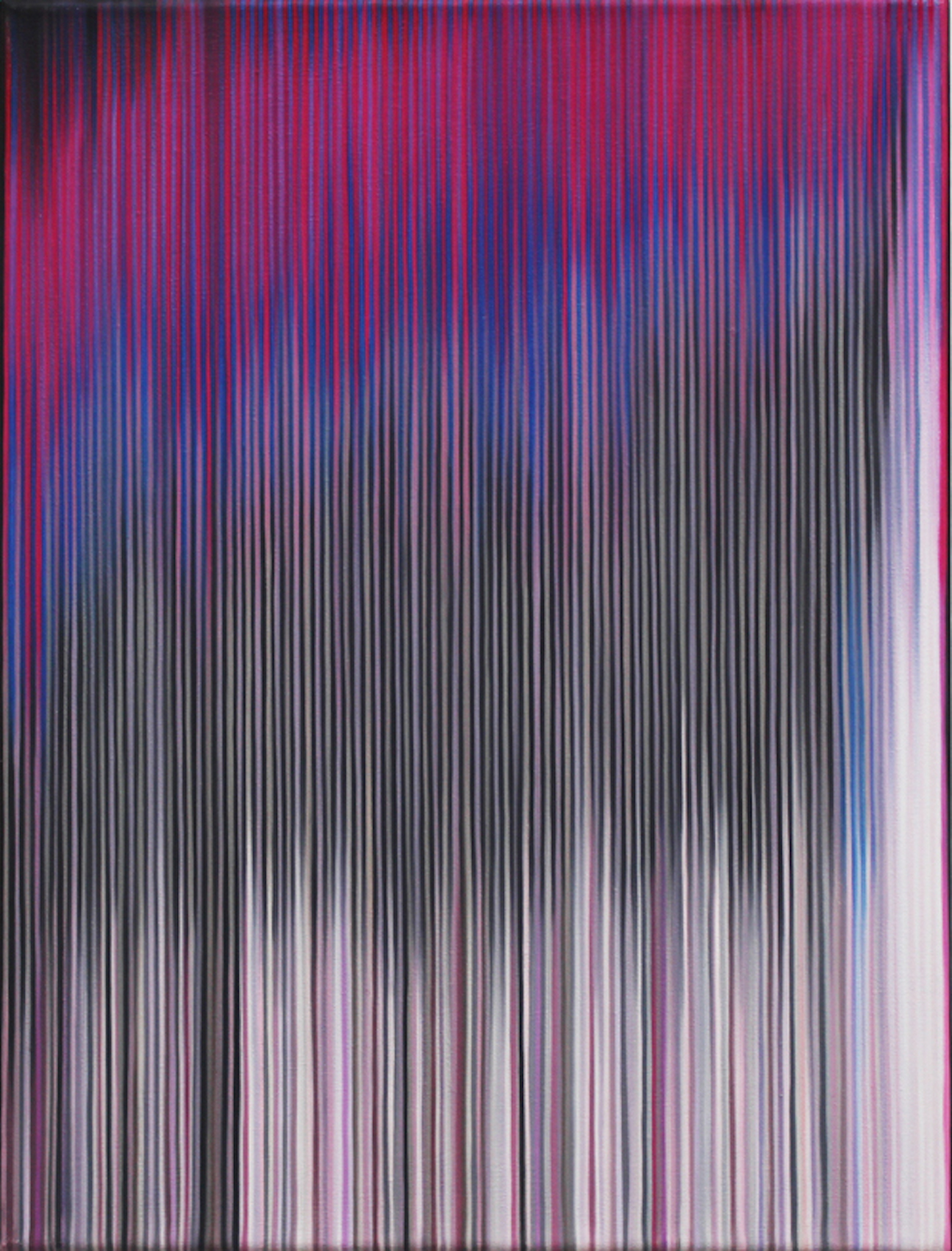 Inspirée par un phénomène numérique, la notion d’abstraction est au centre de la série Pink Paintings. Le tracé de lignes parallèles, caractéristique du travail de l’artiste, imite ici l’image produite par le disfonctionnement d’une caméra numérique dont le violet foncé hypnotise. Derrière ces peintures à l’huile résolument abstraites se cache une tendance à la figuration qui émerge par association d’idée ; la combinaison de la lumière et de la couleur peut créer des images de paysages, de bâtiments ou encore de figures. Pour cette série, l’artiste choisi de travailler sur toile afin d’accentuer la différence entre ses œuvres et les images numériques qui les inspirent ; l’organique s’oppose dès lors à l’austérité du pixel.