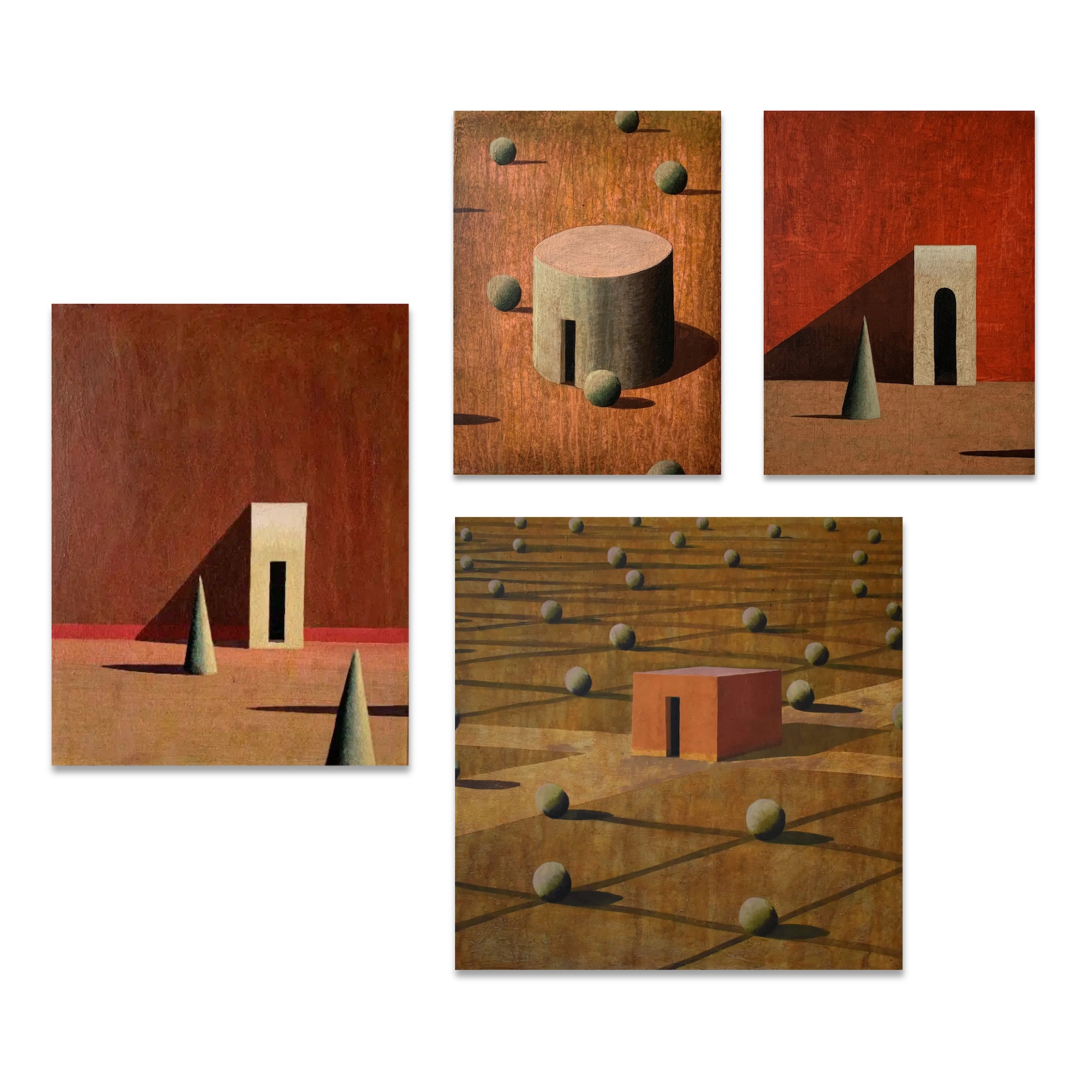 Dans ses peintures, l’artiste établit un dialogue entre l’architecture et le paysage, dans une figuration soumise à la géométrie et une atmosphère toujours énigmatique. La conception de ces espaces et la simplification des formes (poussée jusqu’aux limites de l’abstraction) traduisent une conception théâtrale de l’architecture.