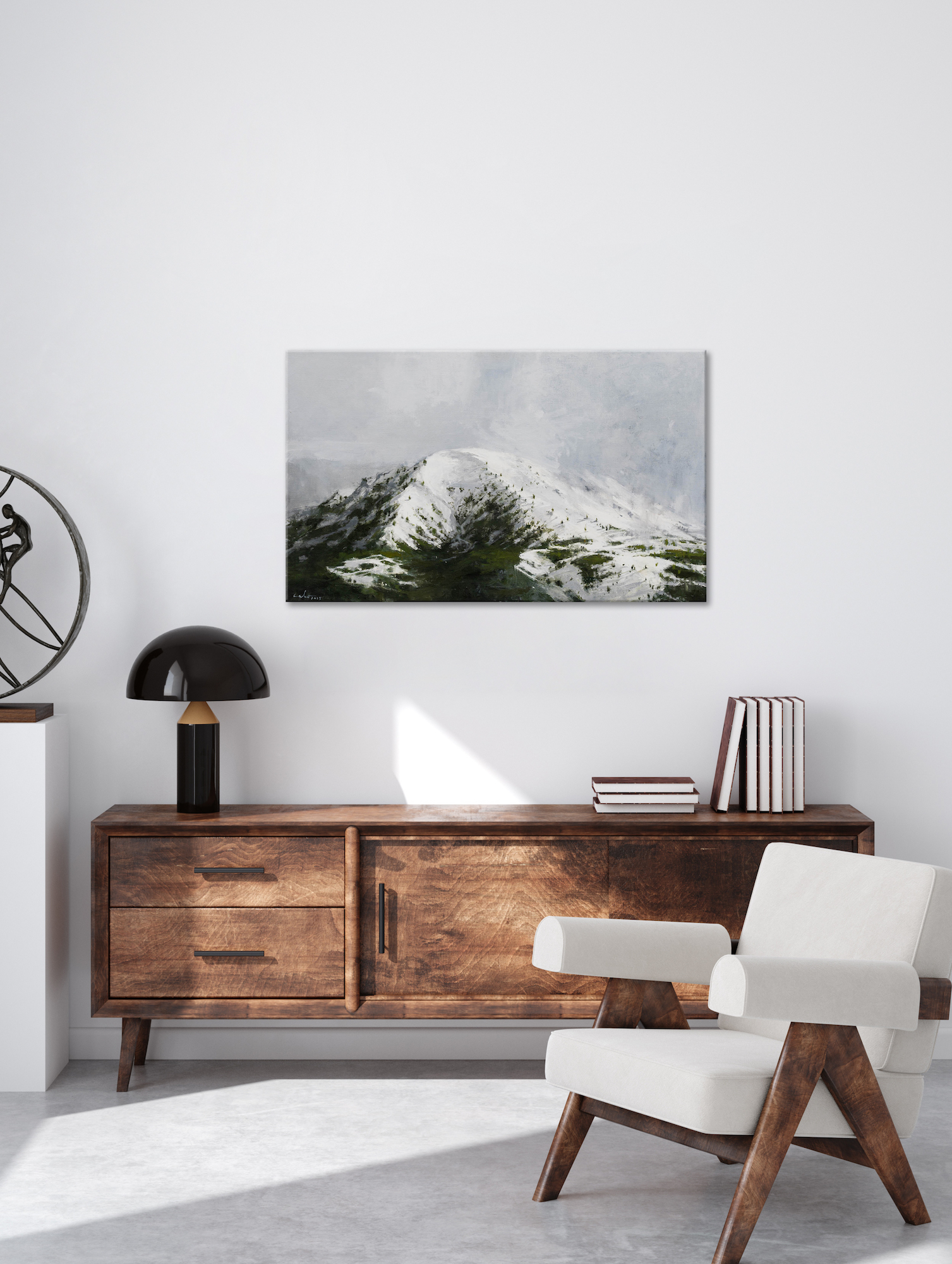 Cette œuvre d’art représente une montagne enneigée qui se trouve dans les contreforts des Pyrénées.