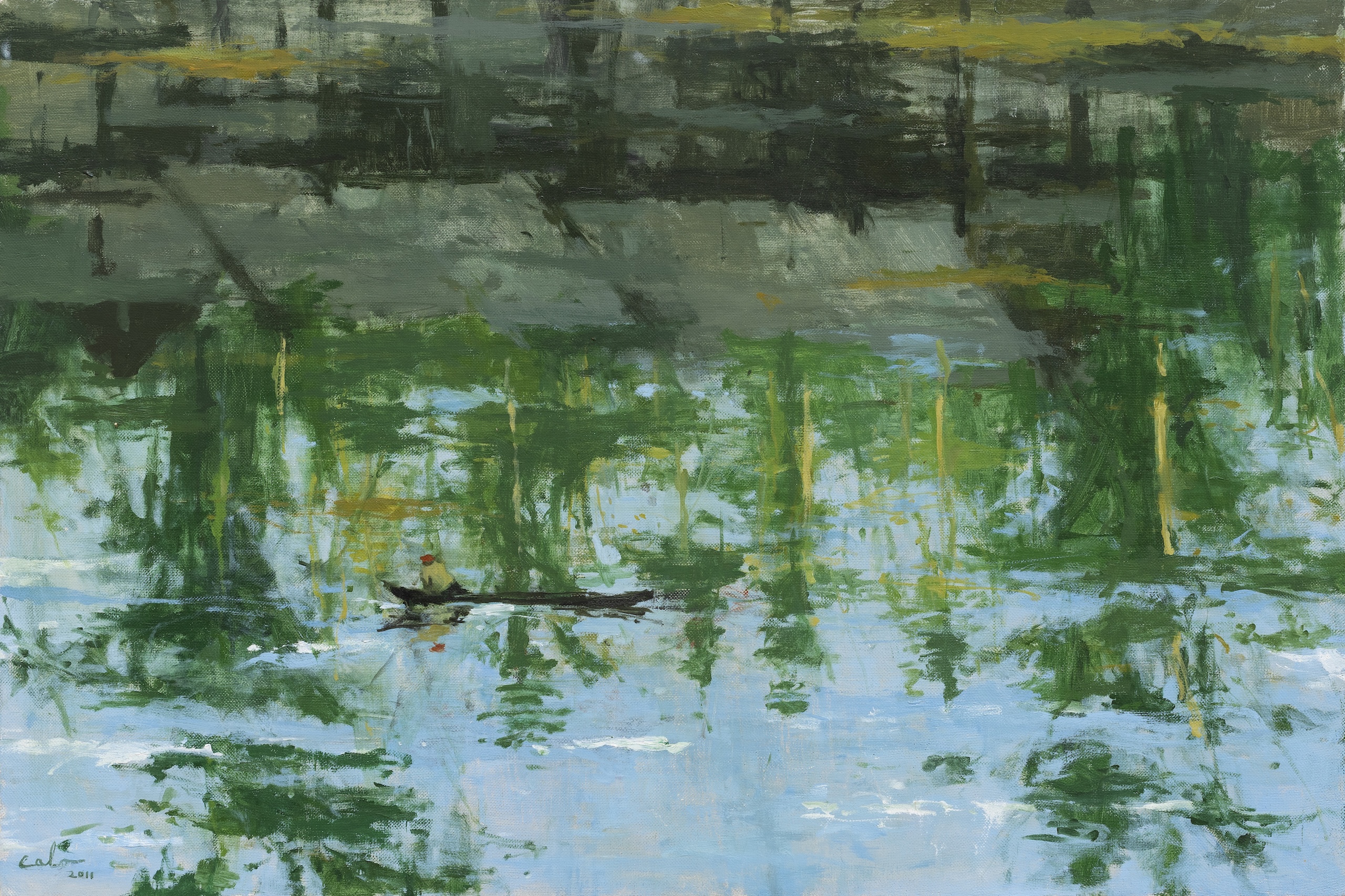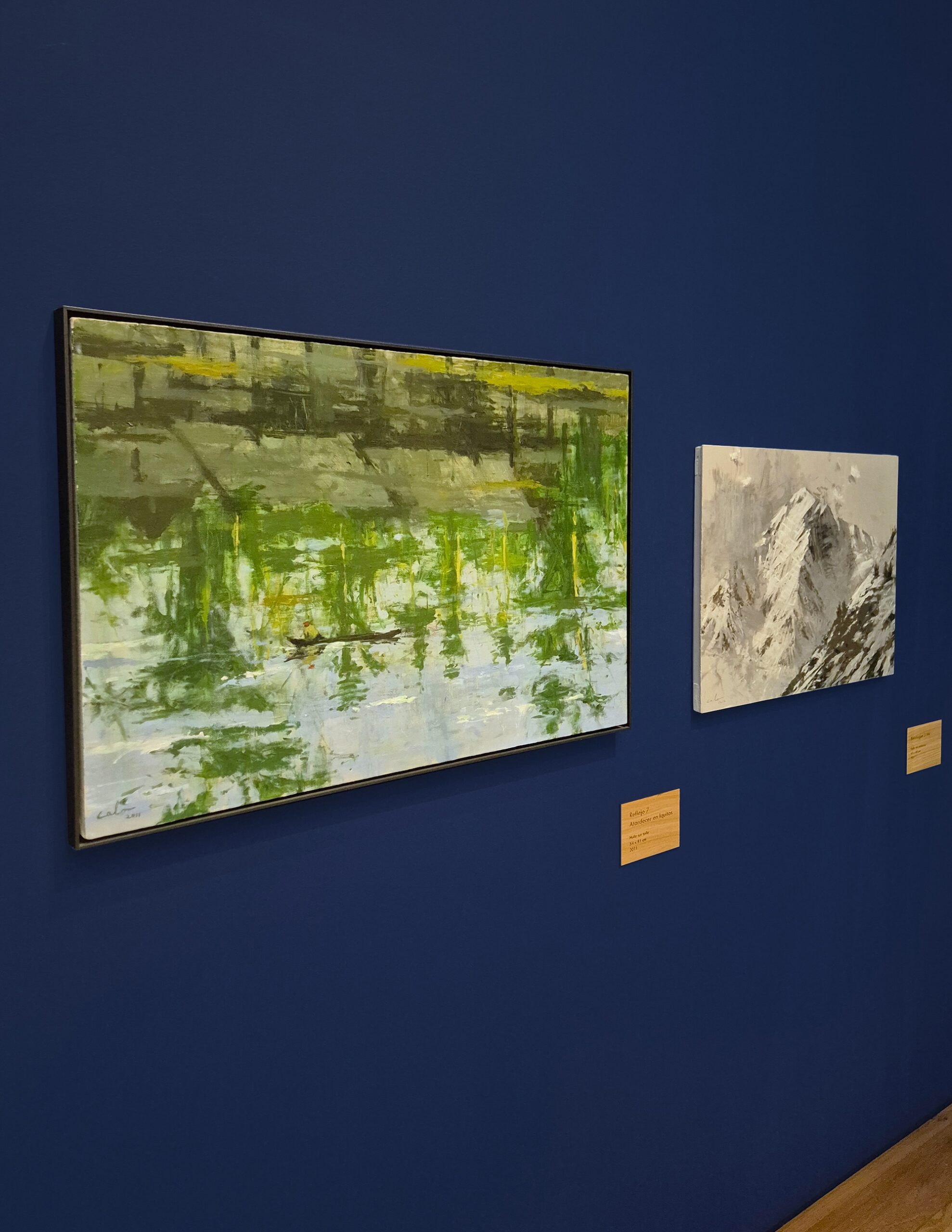 Reflejo n°7 Atardecer en Iquitos est une peinture de l’artiste espagnol Calo Carratalá. Dans cette œuvre, l’artiste représente une silhouette lointaine naviguant sur un fleuve, transmettant le rythme tranquille du fleuve et de la forêt environnante. Iquitos est la plus grande métropole de l’Amazonie péruvienne.