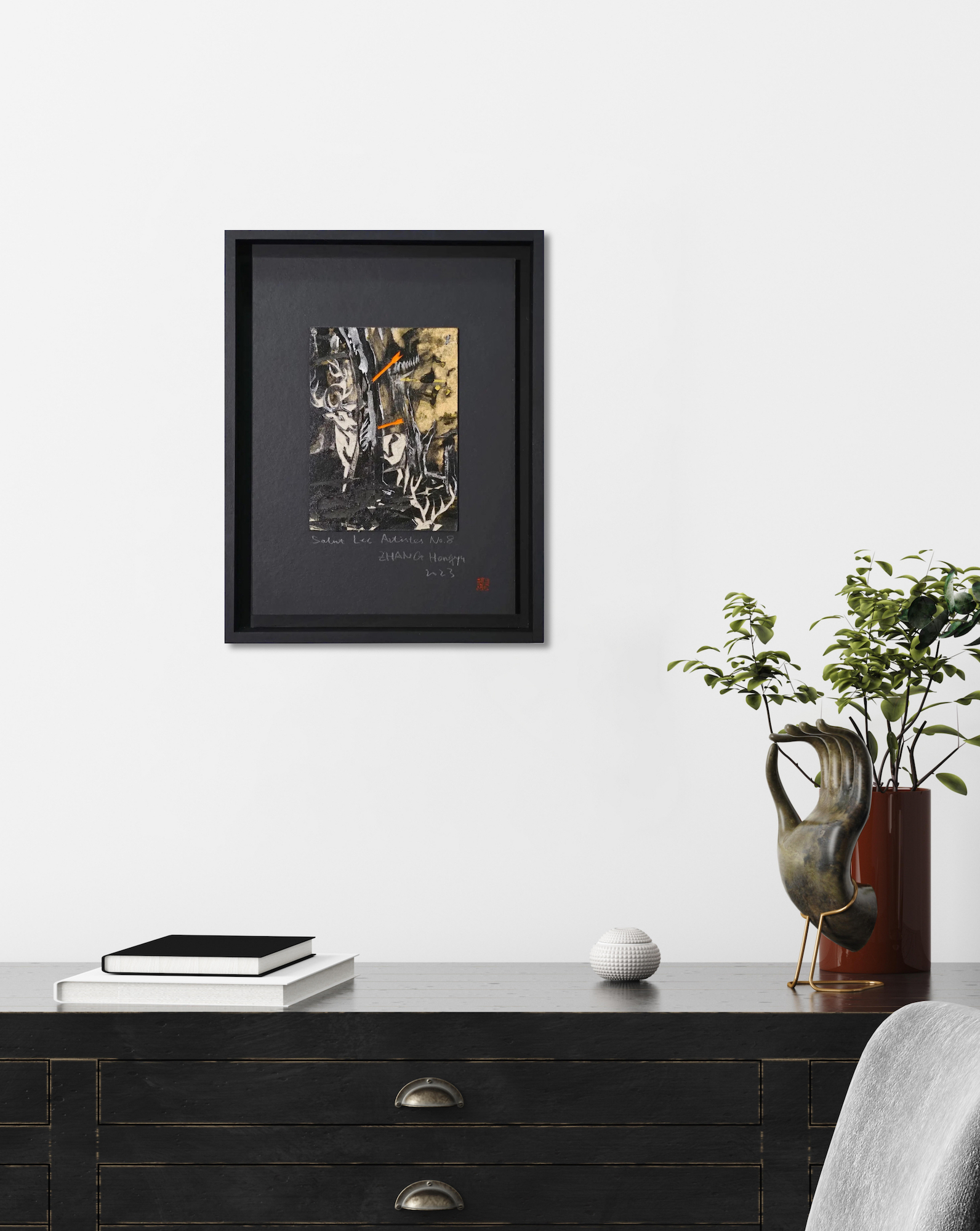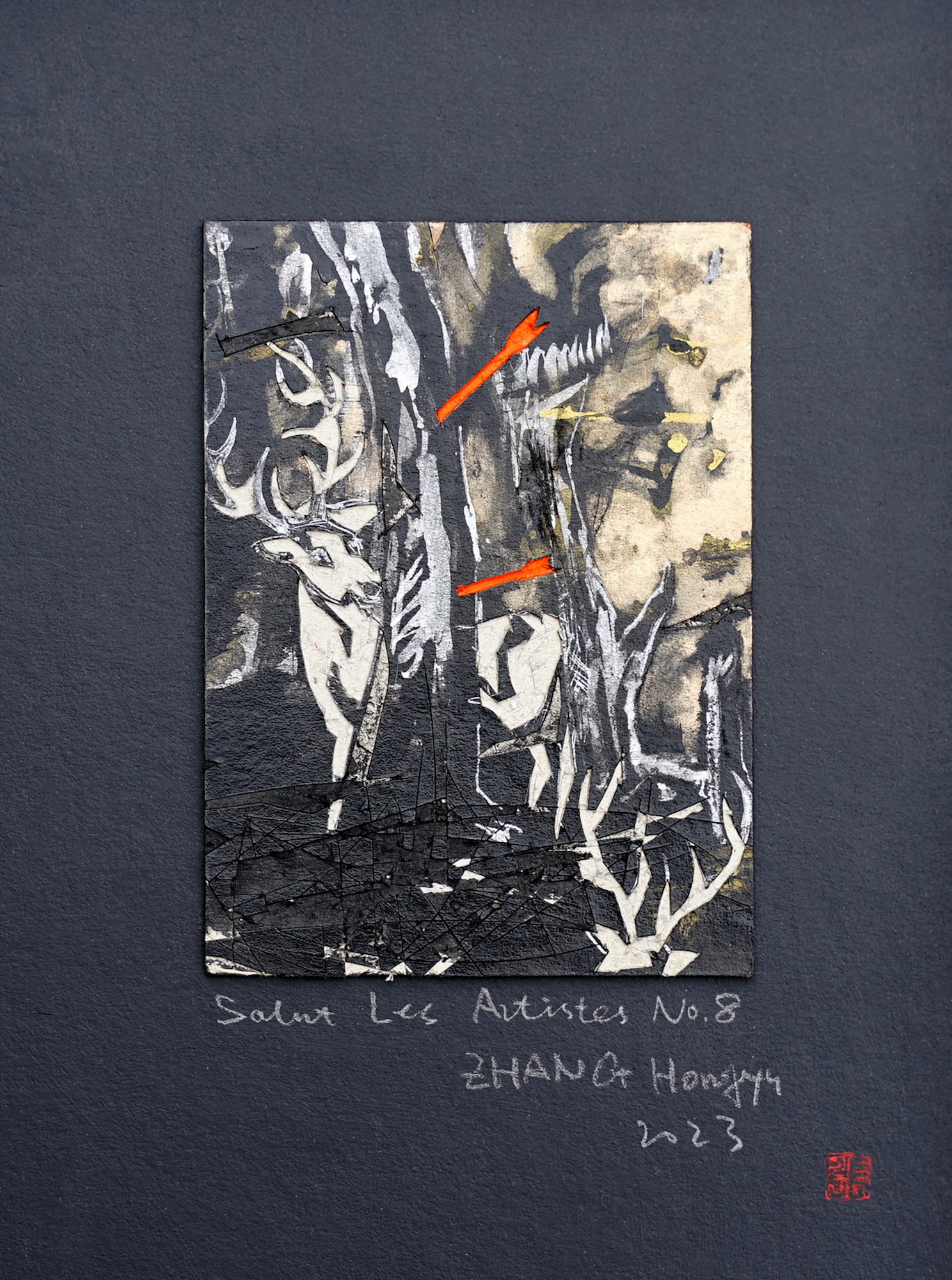 Cette peinture rend hommage aux anciennes peintures pariétales des grottes de Lascaux, en France. Hongyu Zhang les réinterprète sur un support bidimensionnel grâce à la gravure et à la peinture, deux techniques dont il maîtrise les capacités expressives. Sur cette peinture, on distingue les contours d’un cerf.