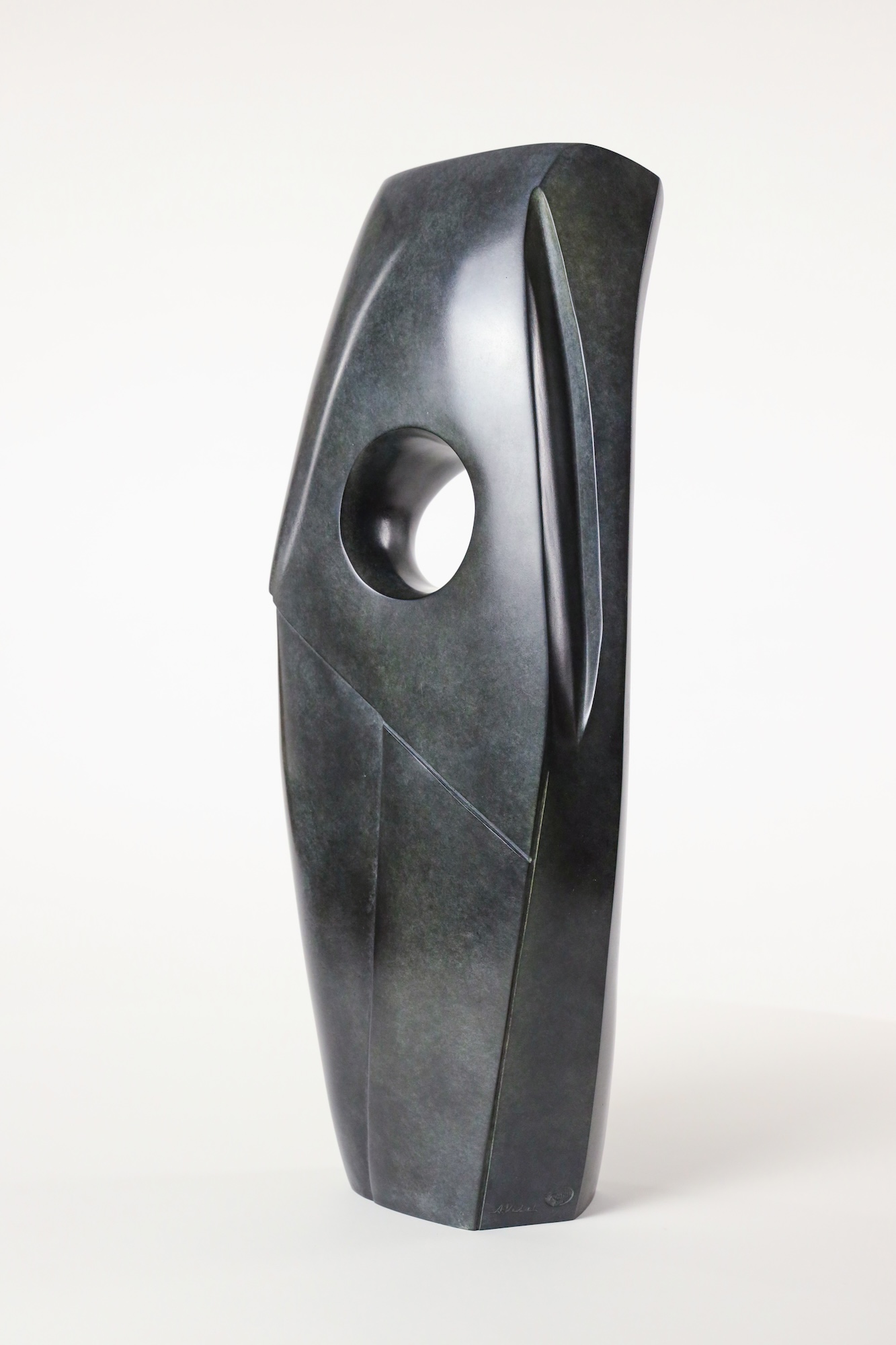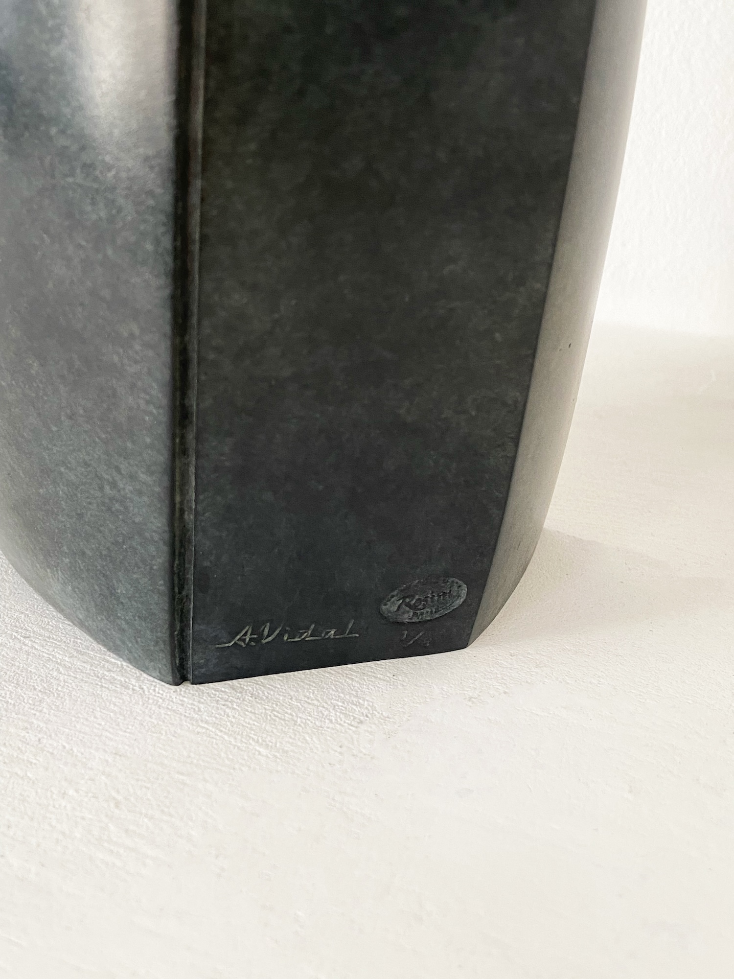Antoine Vidal travaille principalement avec le bronze, dont il apprécie la noblesse, la force et l’aspect impérissable. Il accorde une grande attention au choix de la patine, privilégiant des teintes sobres, parfois aux aspects minéraux, afin de brouiller la perception du matériau. L’objectif est de permettre à la lumière de glisser sur la pièce, révélant son élégance fluide et sinueuse.