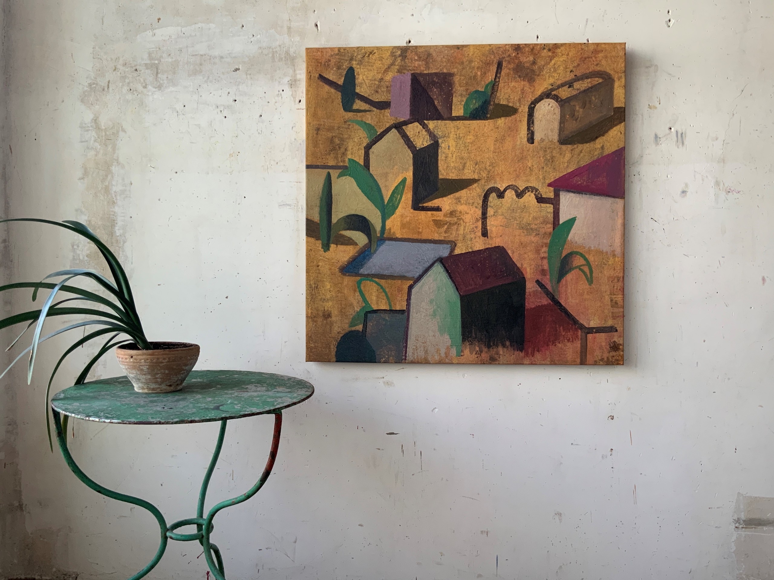 Dans ses peintures, l’artiste établit un dialogue entre l’architecture et le paysage, dans une figuration soumise à la géométrie et une atmosphère toujours énigmatique. La conception de ces espaces et la simplification des formes (poussée jusqu’aux limites de l’abstraction) traduisent une conception théâtrale de l’architecture.