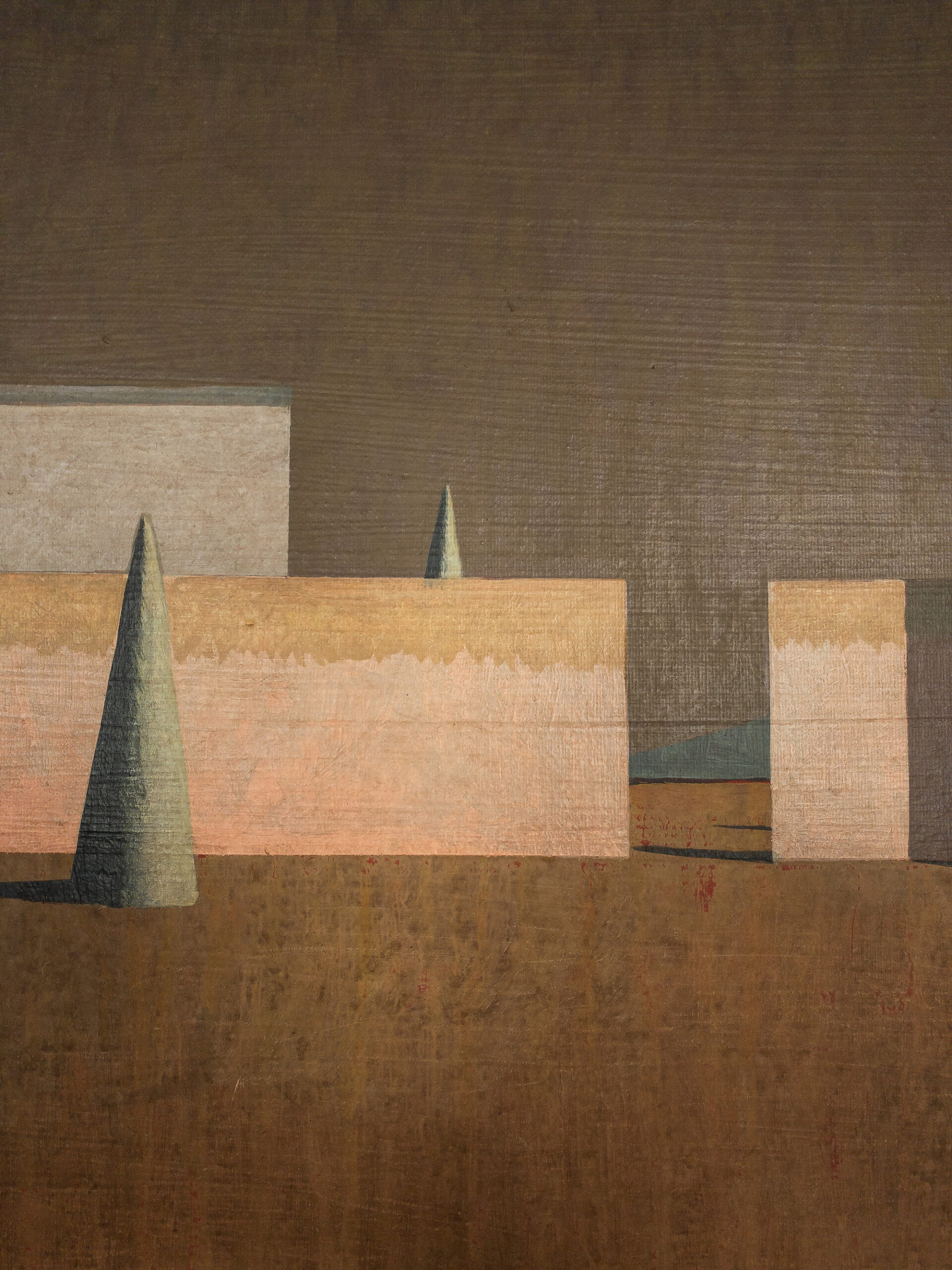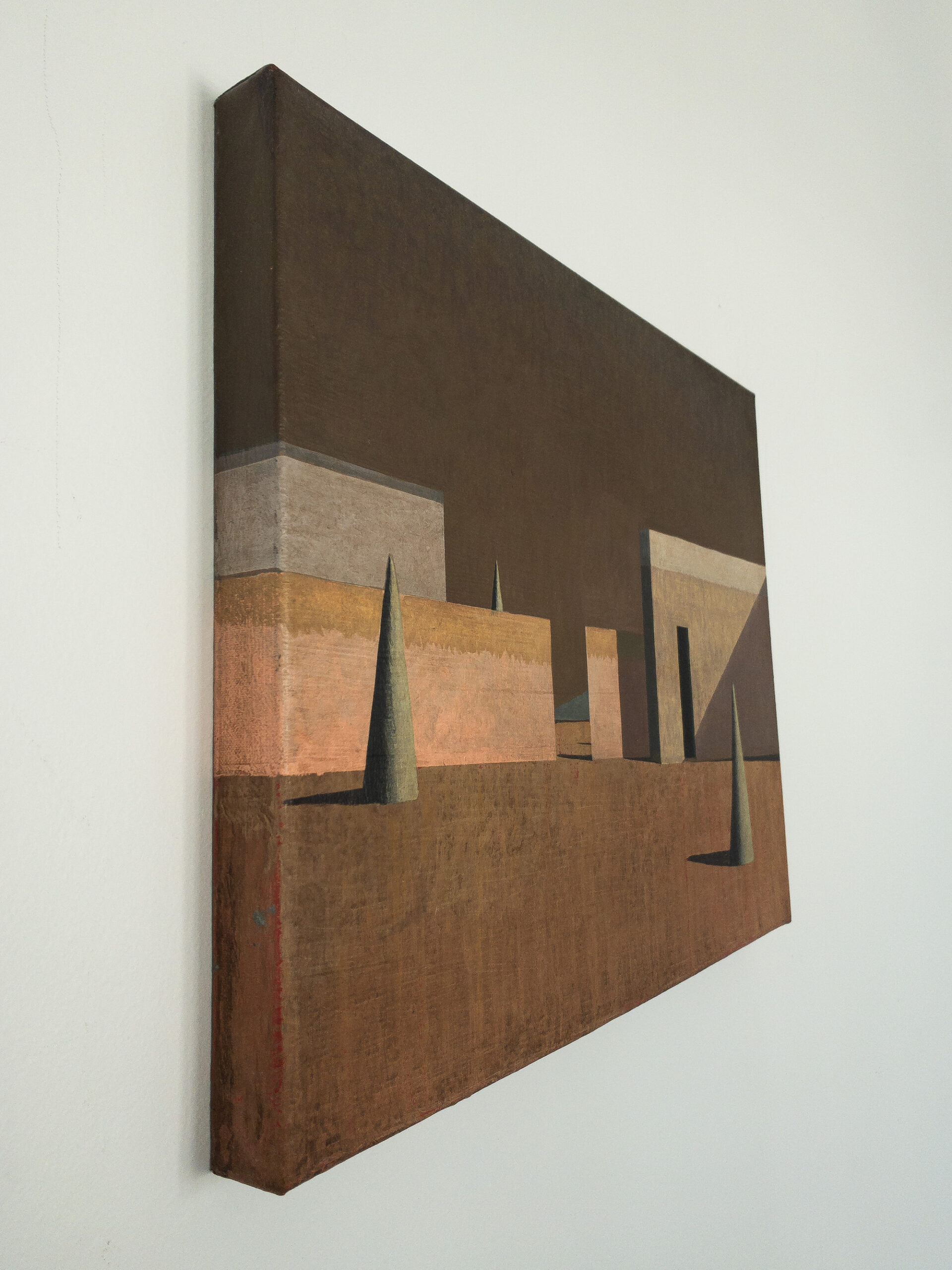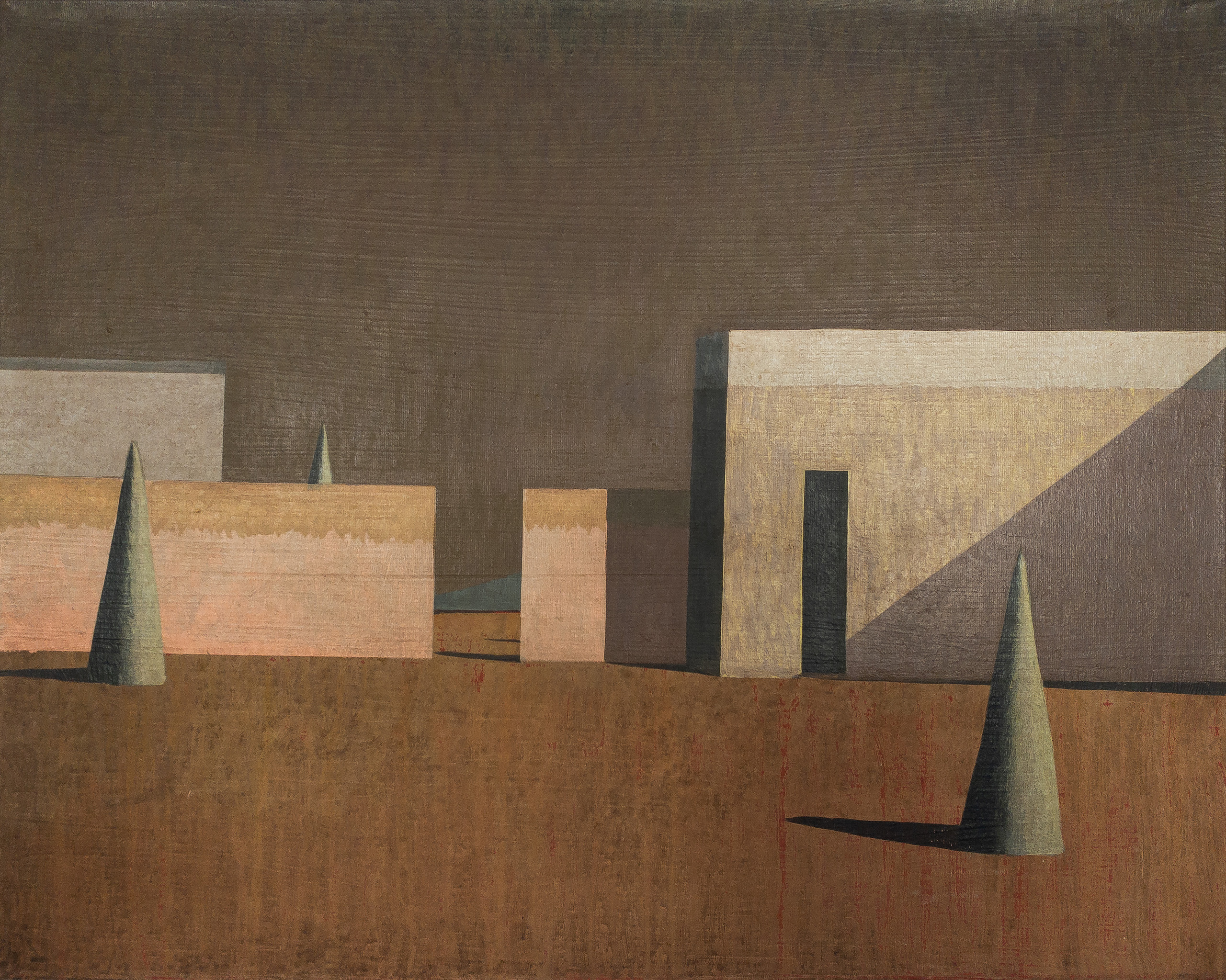 Dans ses peintures, l’artiste établit un dialogue entre l’architecture et le paysage, dans une figuration soumise à la géométrie et une atmosphère toujours énigmatique. La conception de ces espaces et la simplification des formes (poussée jusqu’aux limites de l’abstraction) traduisent une conception théâtrale de l’architecture.