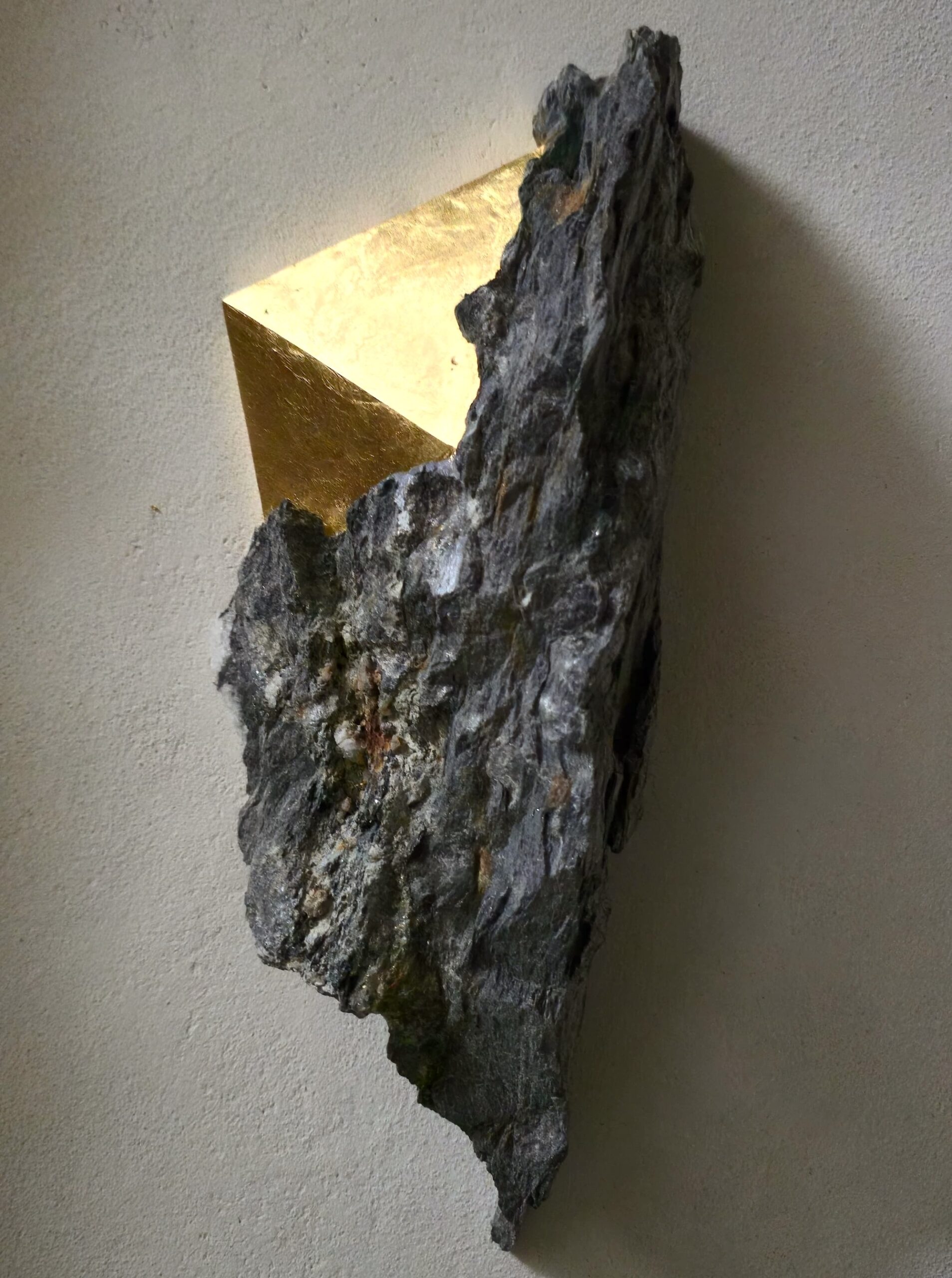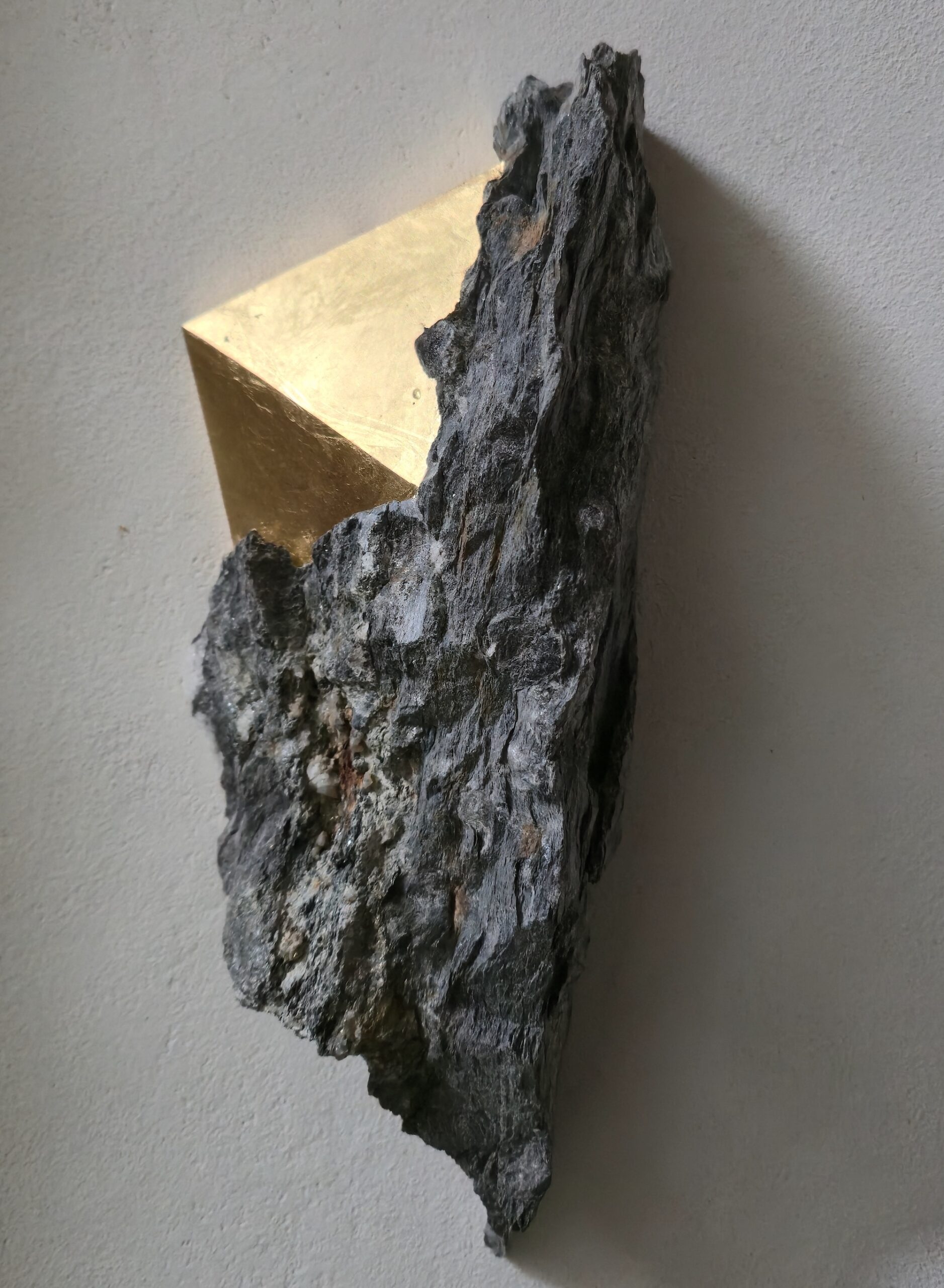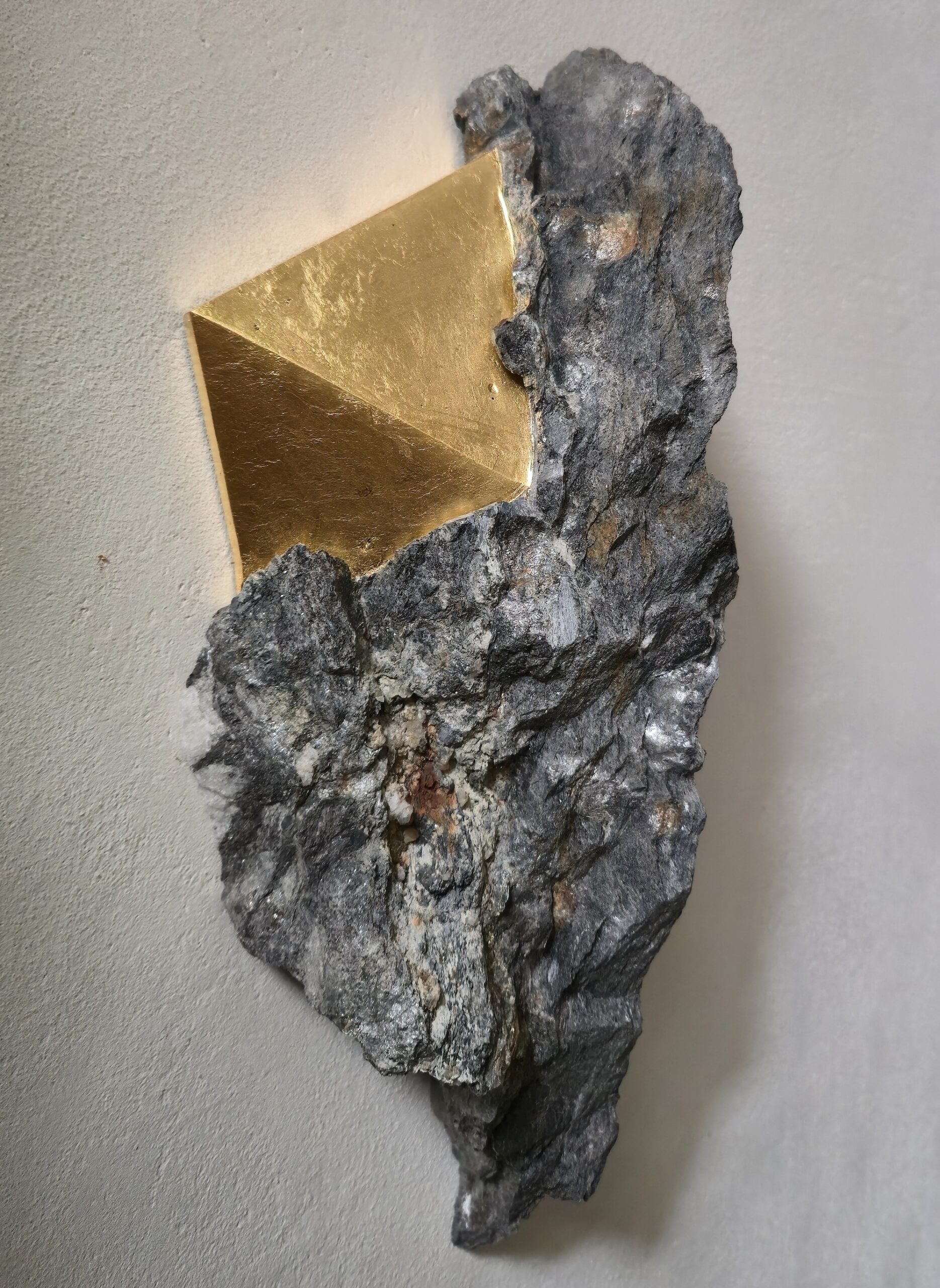 Afin d’accentuer encore davantage certaines formes et lignes de la pierre, l’artiste y applique de la feuille d’argent. Le choix de l’argent provient du scintillement argenté naturel de la pierre ; l’artiste a alors décidé de cristalliser cette présence brillante avec de la feuille d’argent. Par rapport à l’or, également utilisé par l’artiste, l’argent offre une possibilité esthétique supplémentaire : celle conférée par l’oxydation, qui peut apporter à la feuille des effets différents avec le temps.