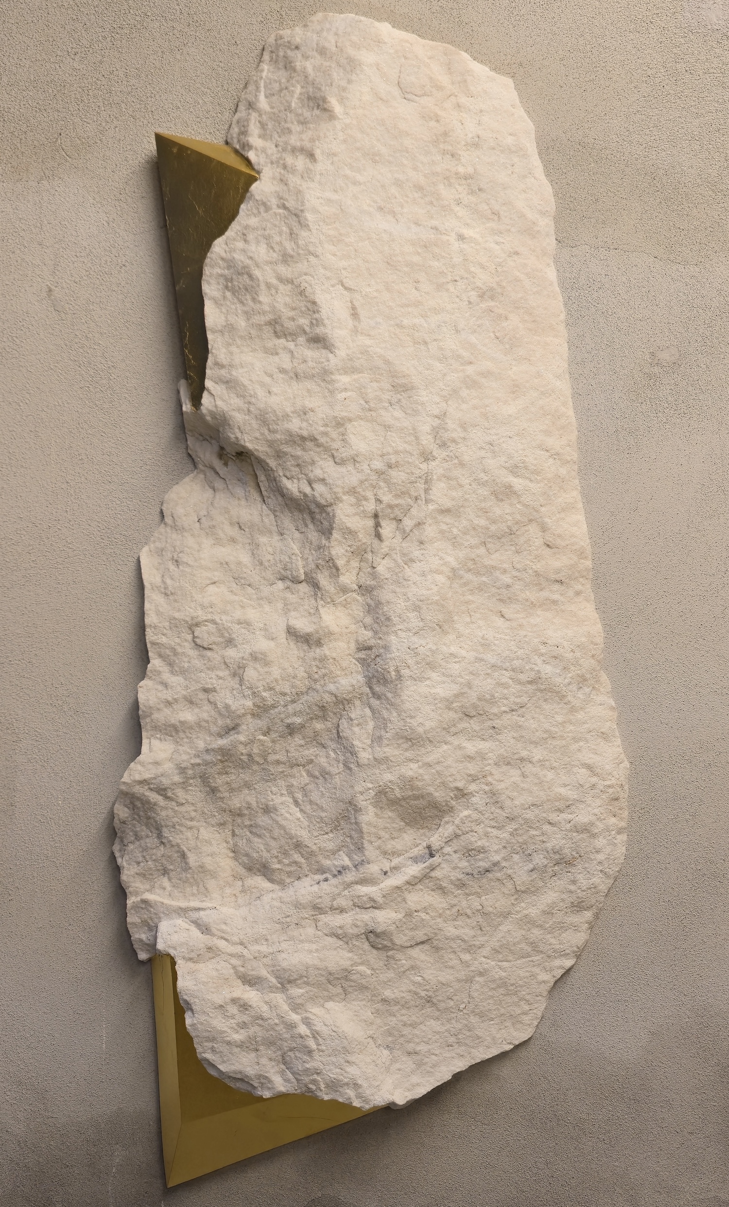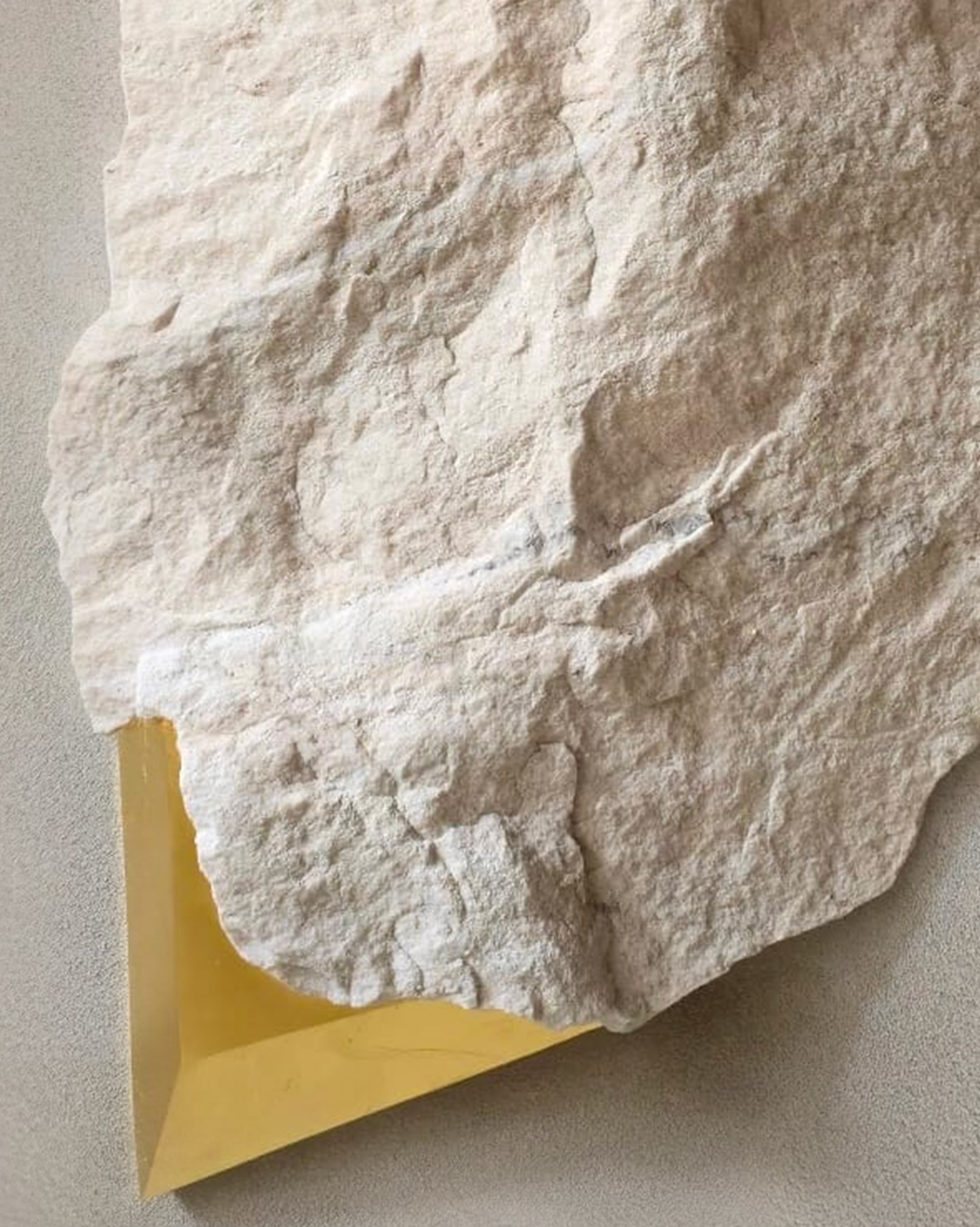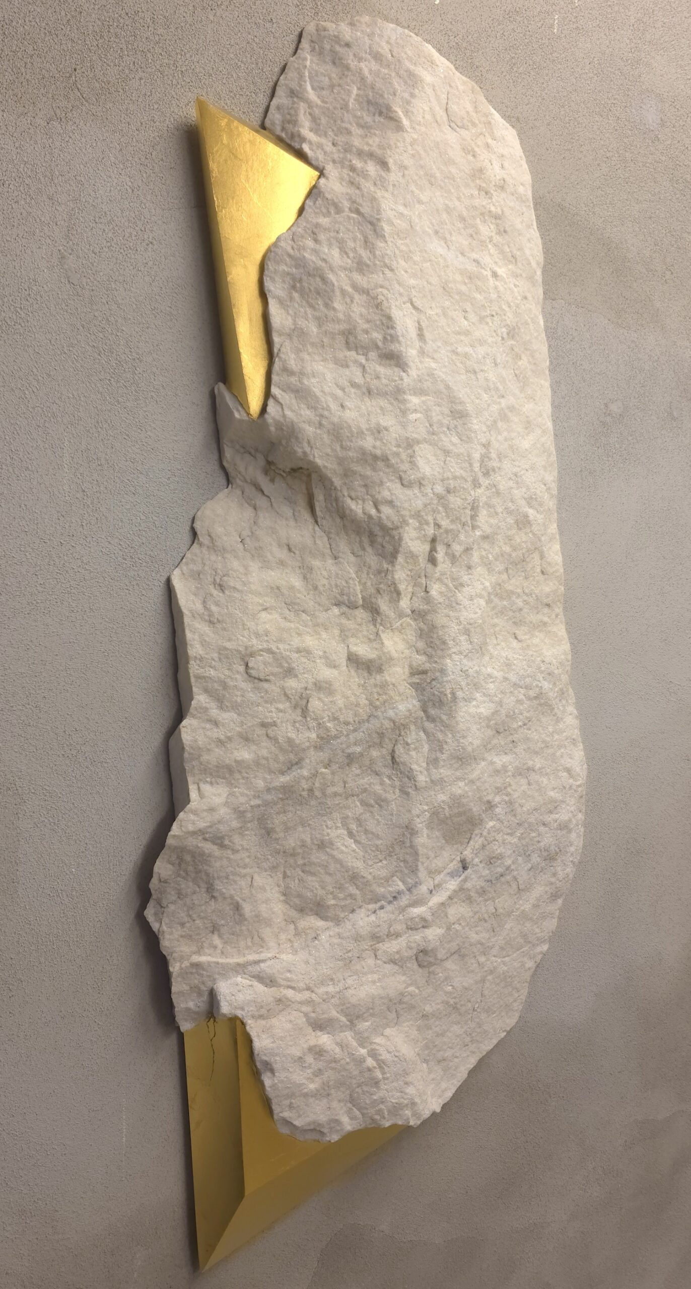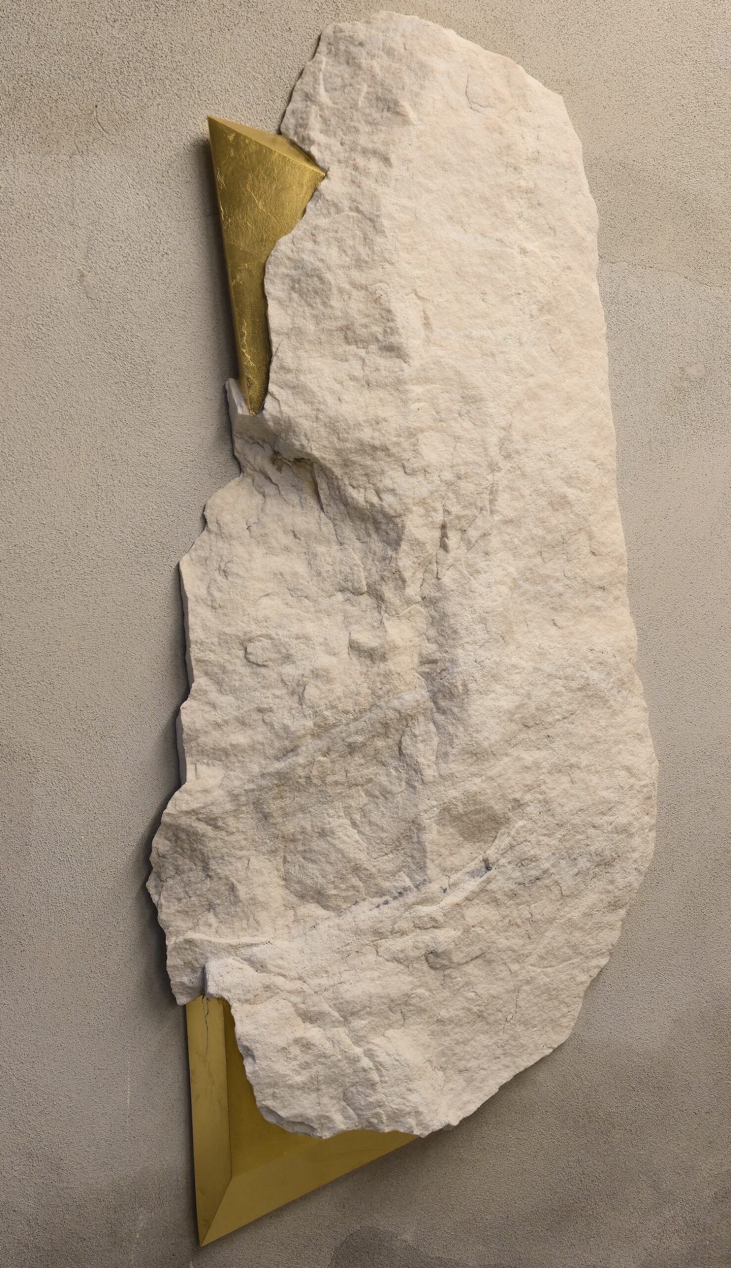 Sezione Aurea 2025-08 est une sculpture murale en marbre Palissandre blanc et feuille d’or de l’artiste contemporain italien Mattia Bosco.
