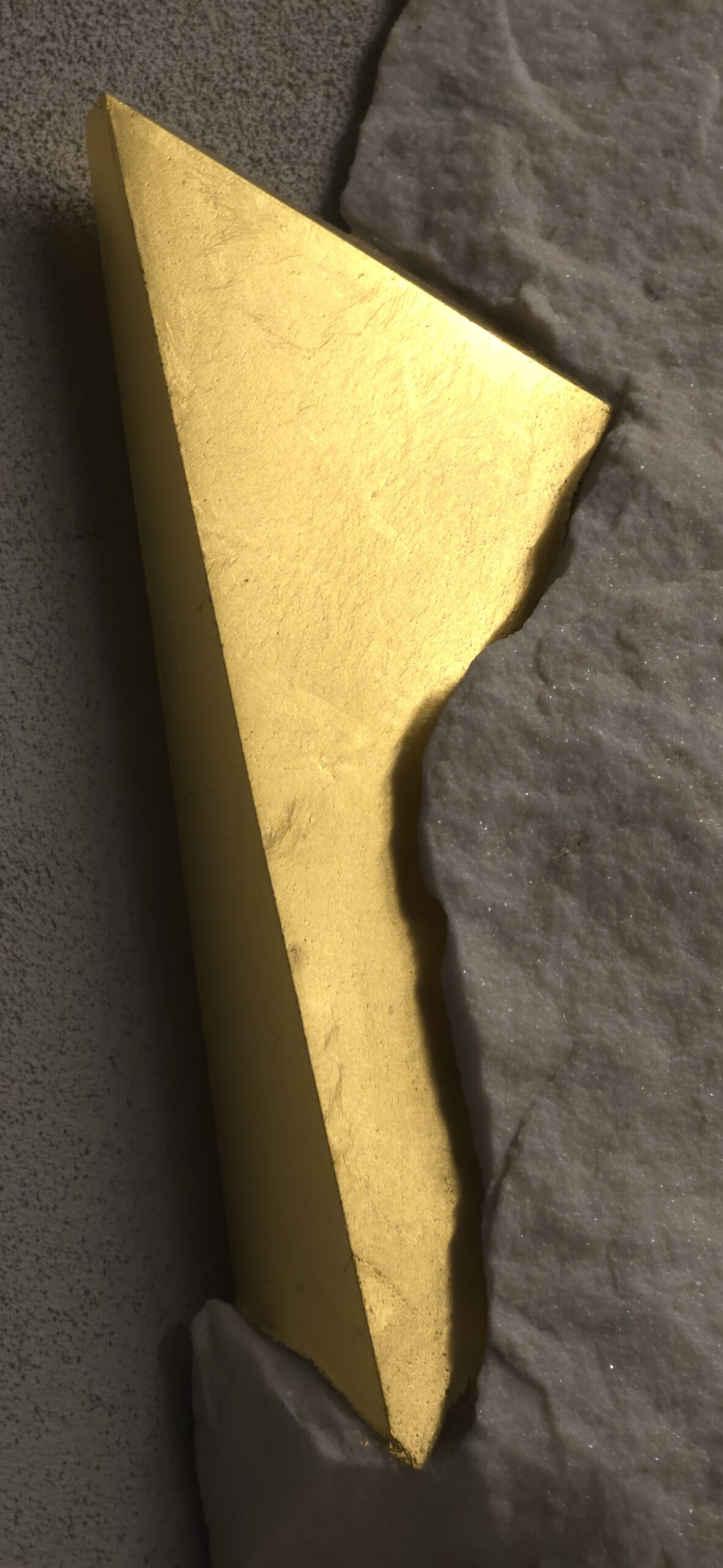 Afin d’accentuer encore davantage certaines formes et lignes de la pierre, l’artiste y applique de la feuille d’argent. Le choix de l’argent provient du scintillement argenté naturel de la pierre ; l’artiste a alors décidé de cristalliser cette présence brillante avec de la feuille d’argent. Par rapport à l’or, également utilisé par l’artiste, l’argent offre une possibilité esthétique supplémentaire : celle conférée par l’oxydation, qui peut apporter à la feuille des effets différents avec le temps.
