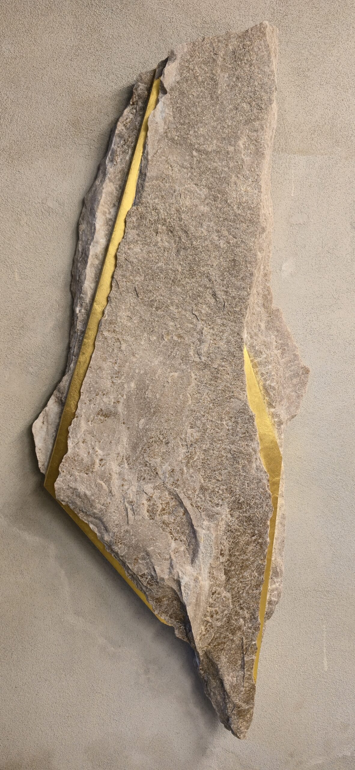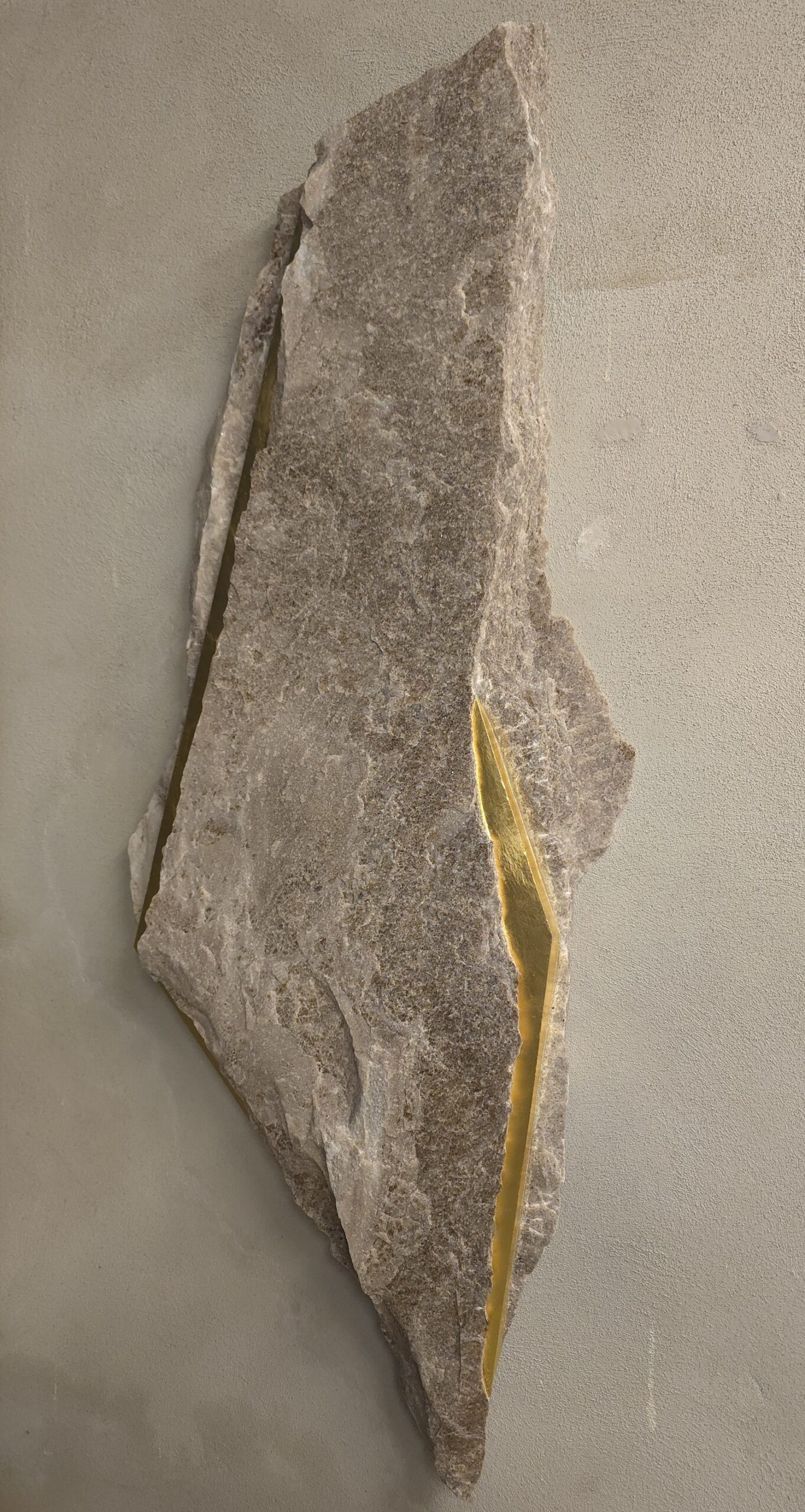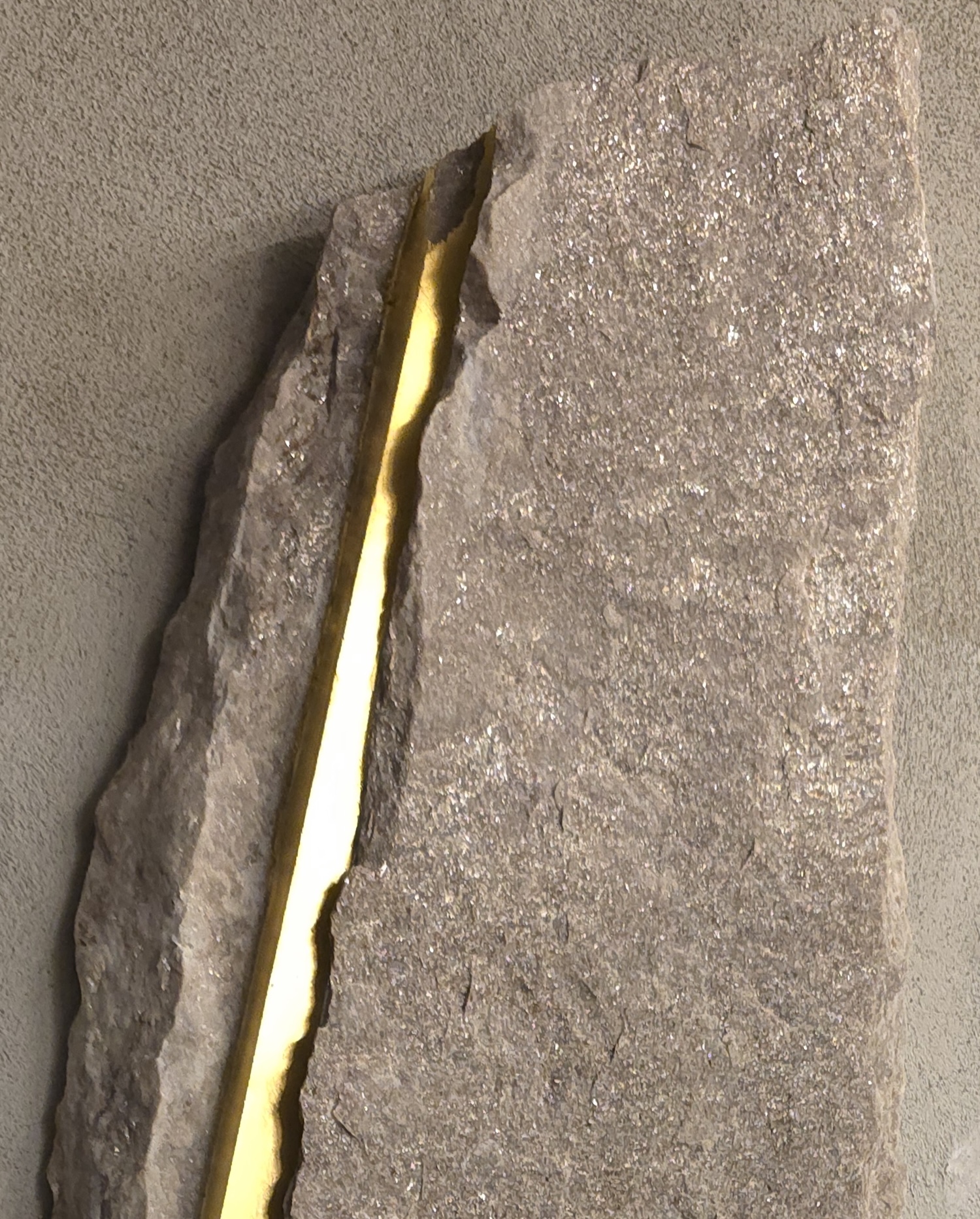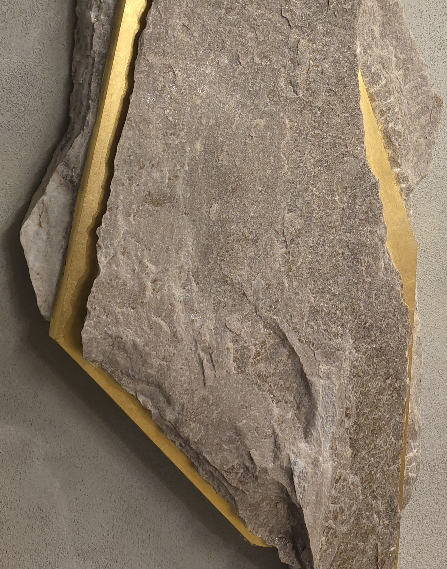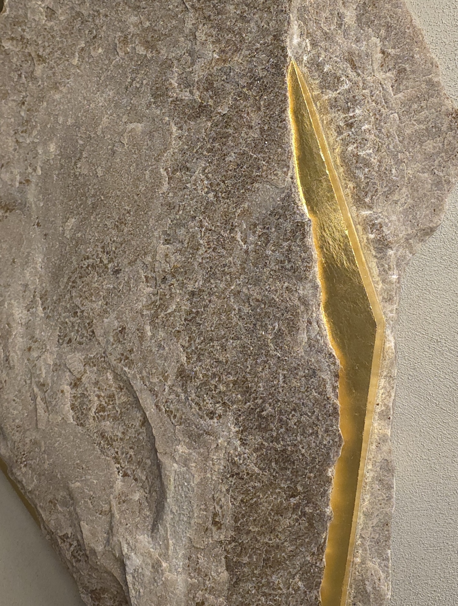 Afin d’accentuer encore davantage certaines formes et lignes de la pierre, l’artiste y applique de la feuille d’argent. Le choix de l’argent provient du scintillement argenté naturel de la pierre ; l’artiste a alors décidé de cristalliser cette présence brillante avec de la feuille d’argent. Par rapport à l’or, également utilisé par l’artiste, l’argent offre une possibilité esthétique supplémentaire : celle conférée par l’oxydation, qui peut apporter à la feuille des effets différents avec le temps.
