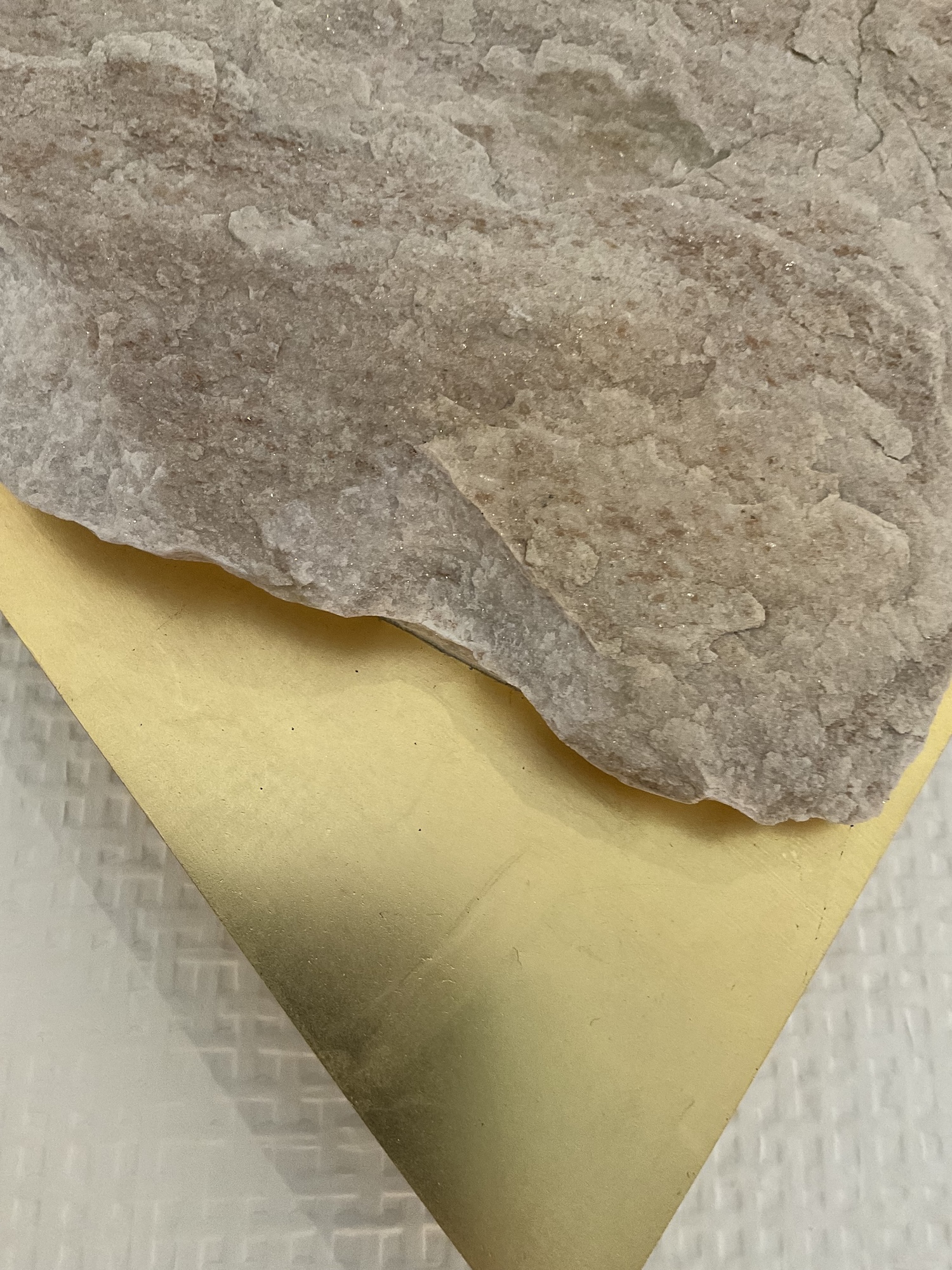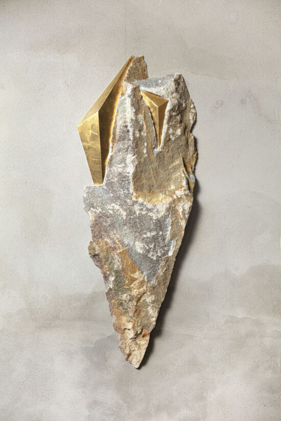 Afin d’accentuer encore davantage certaines formes et lignes de la pierre, l’artiste y applique de la feuille d’argent. Le choix de l’argent provient du scintillement argenté naturel de la pierre ; l’artiste a alors décidé de cristalliser cette présence brillante avec de la feuille d’argent. Par rapport à l’or, également utilisé par l’artiste, l’argent offre une possibilité esthétique supplémentaire : celle conférée par l’oxydation, qui peut apporter à la feuille des effets différents avec le temps.