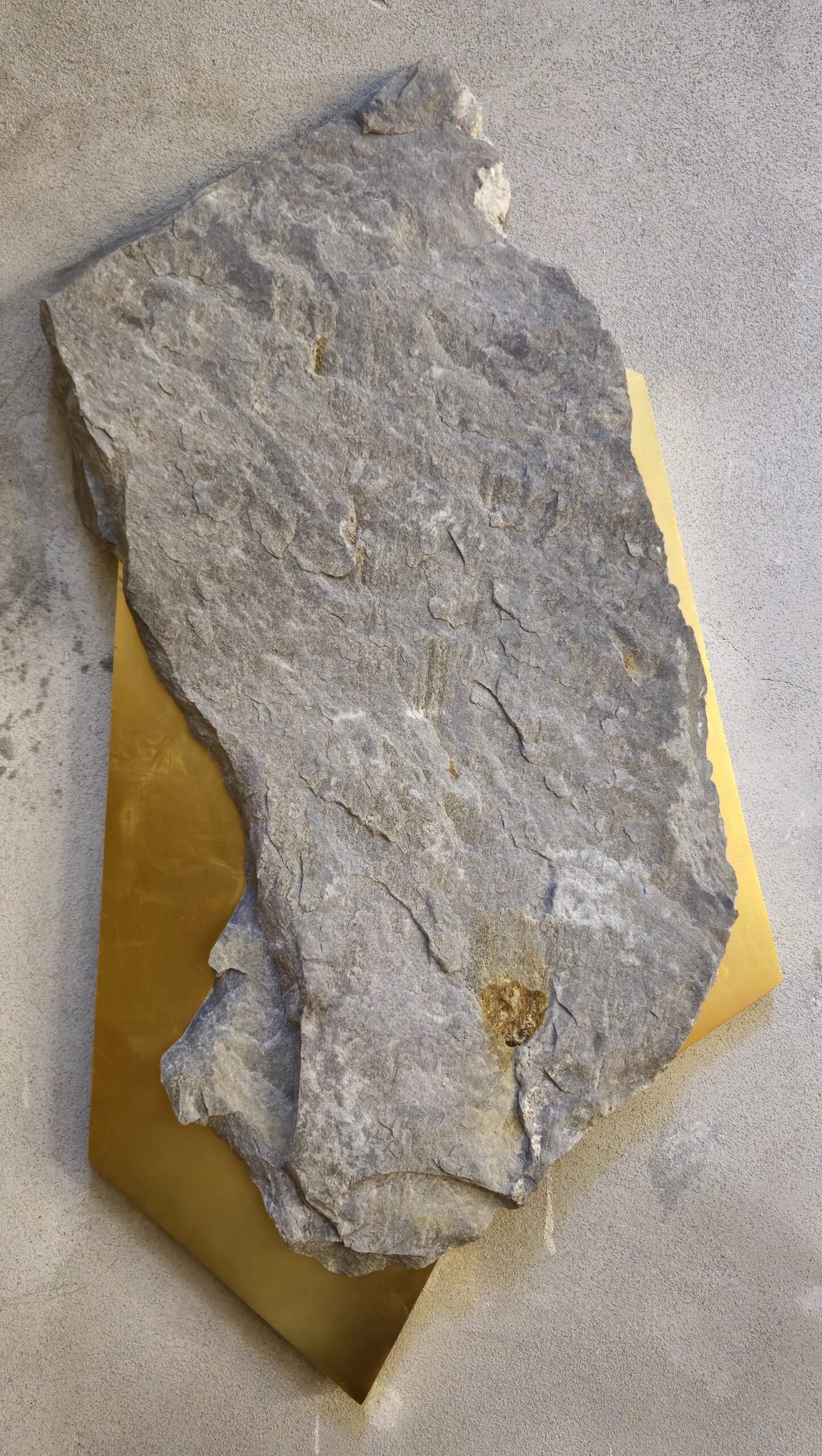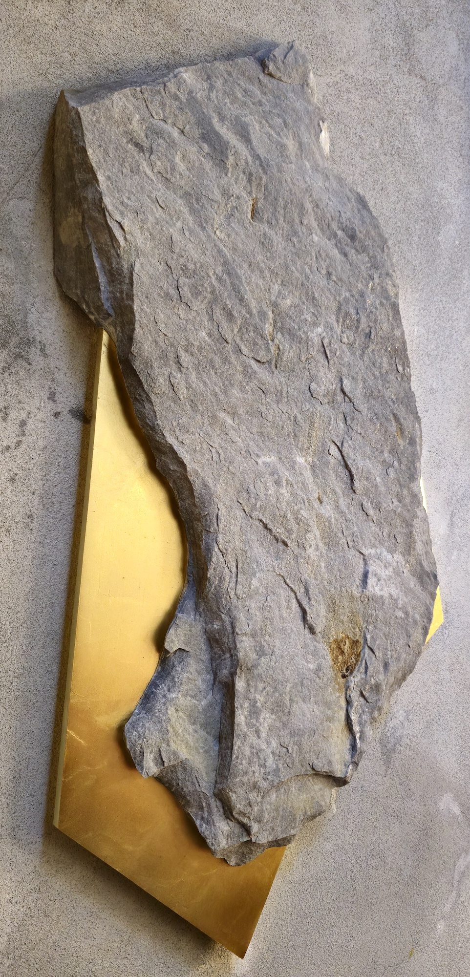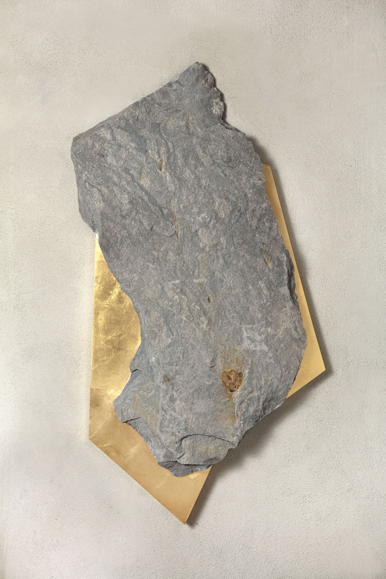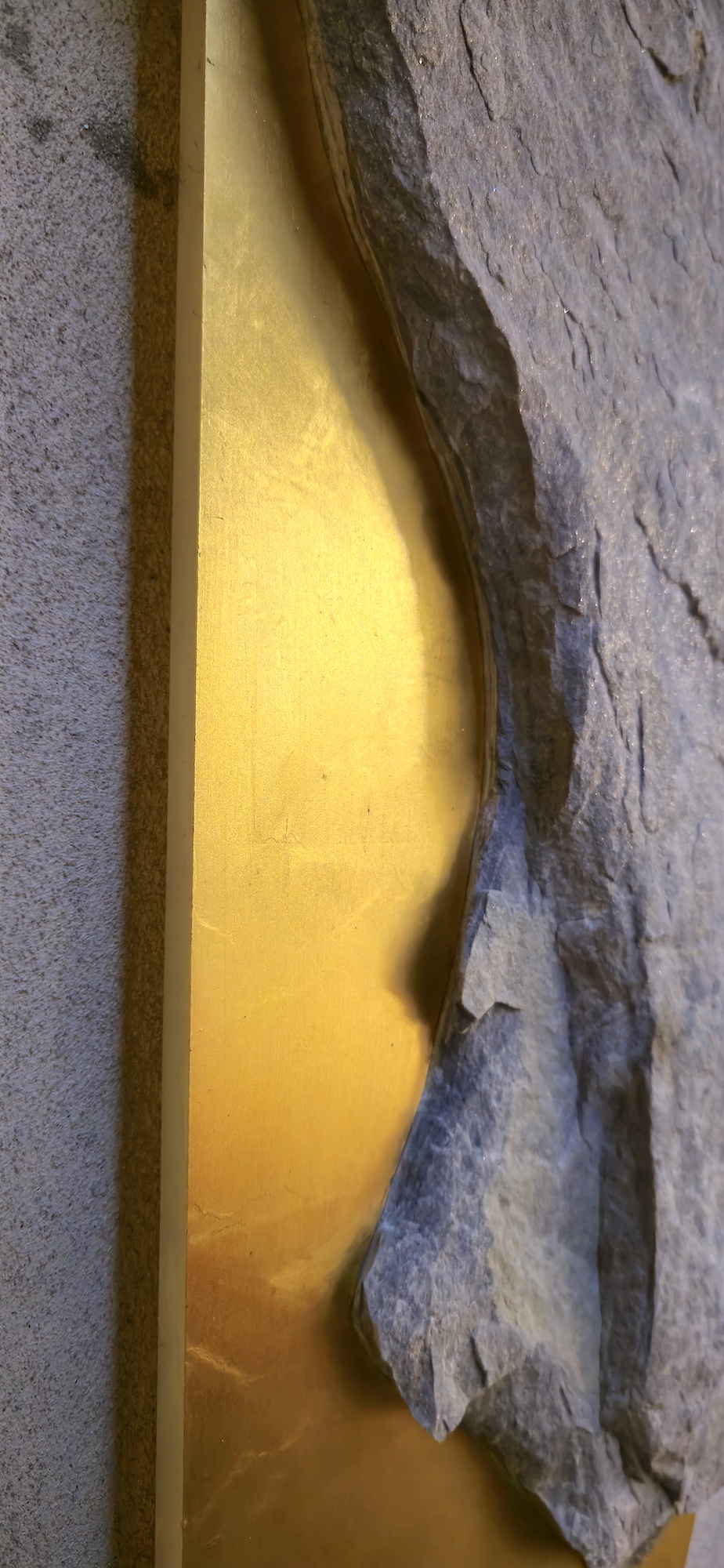 Afin d’accentuer encore davantage certaines formes et lignes de la pierre, l’artiste y applique de la feuille d’argent. Le choix de l’argent provient du scintillement argenté naturel de la pierre ; l’artiste a alors décidé de cristalliser cette présence brillante avec de la feuille d’argent. Par rapport à l’or, également utilisé par l’artiste, l’argent offre une possibilité esthétique supplémentaire : celle conférée par l’oxydation, qui peut apporter à la feuille des effets différents avec le temps.