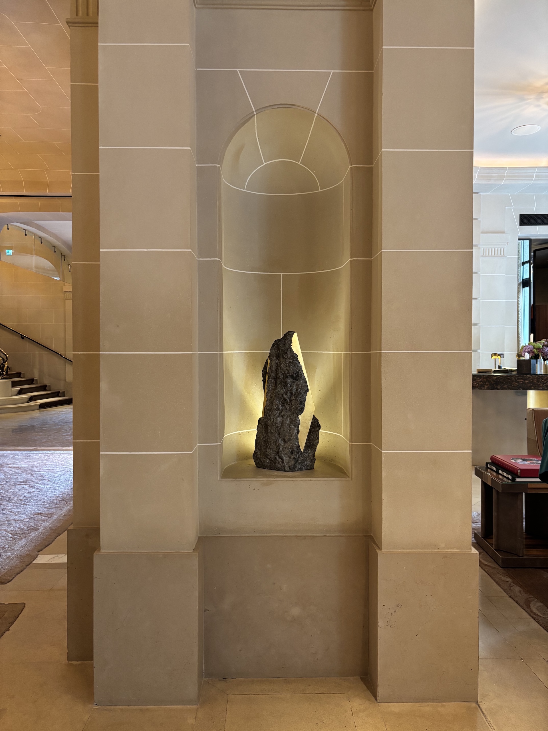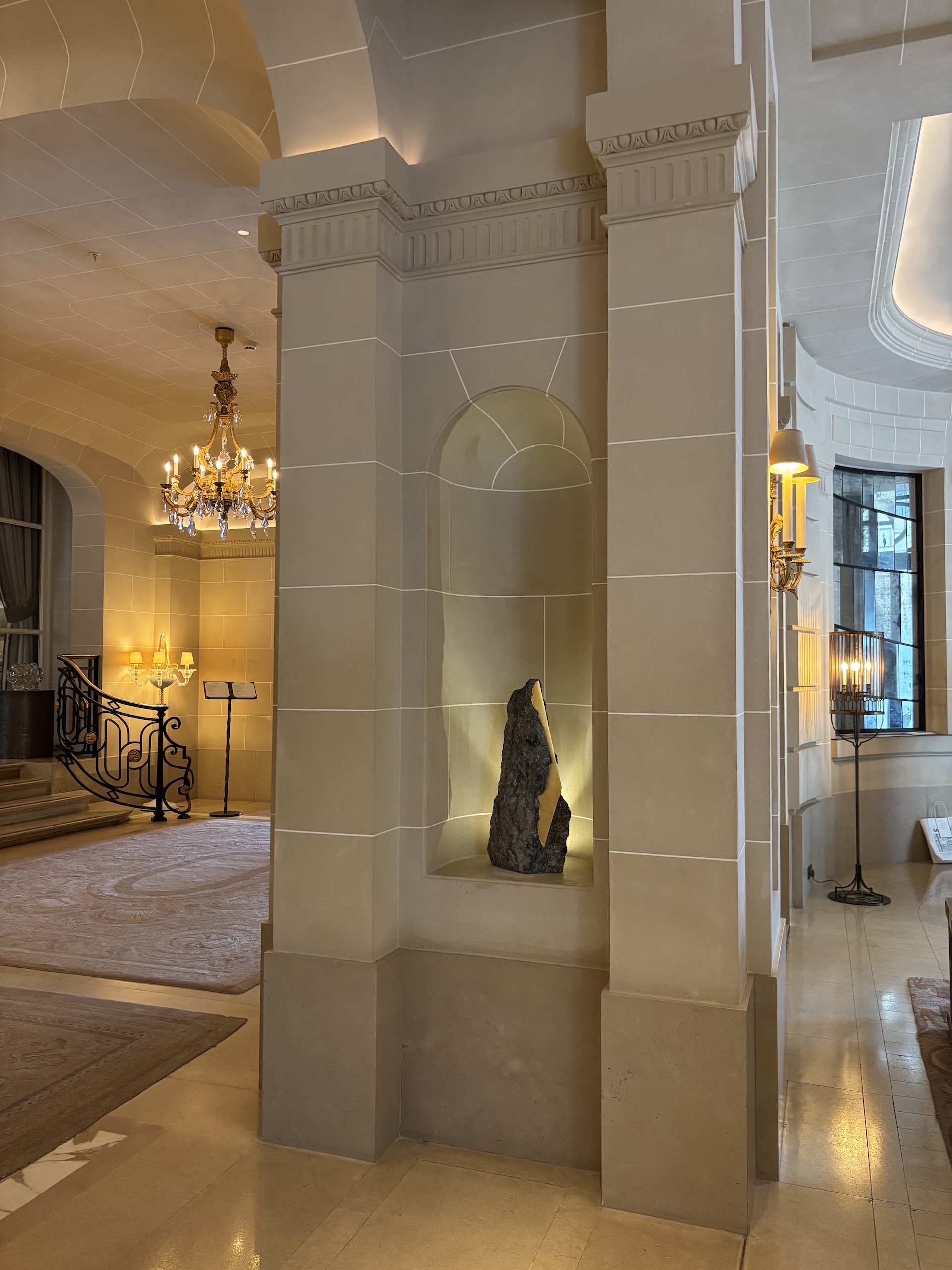 Les photographies prises dans un intérieur d’hôtel montrent l’œuvre exposée à l’Hôtel de Crillon (Paris, février-mars 2026).