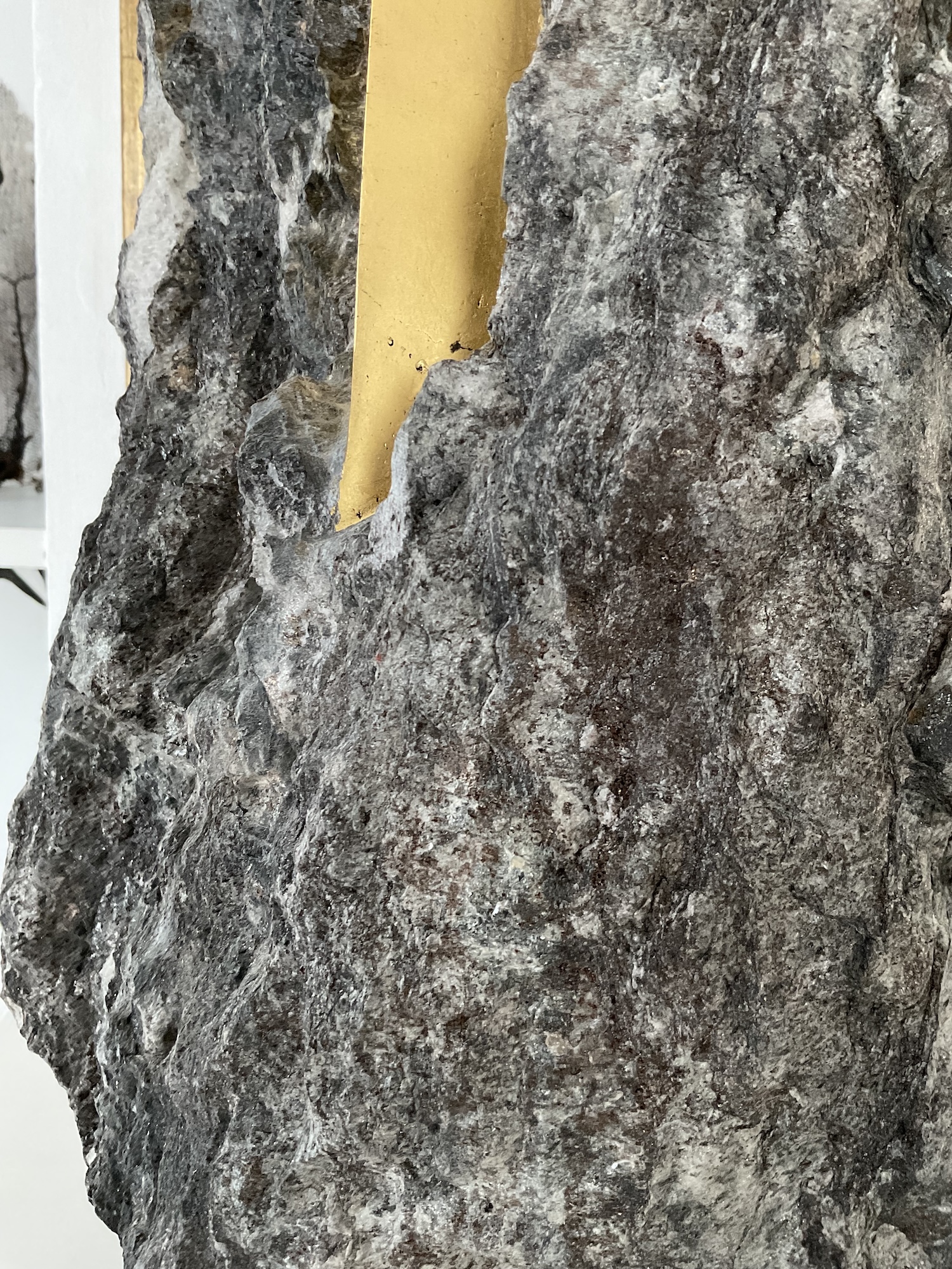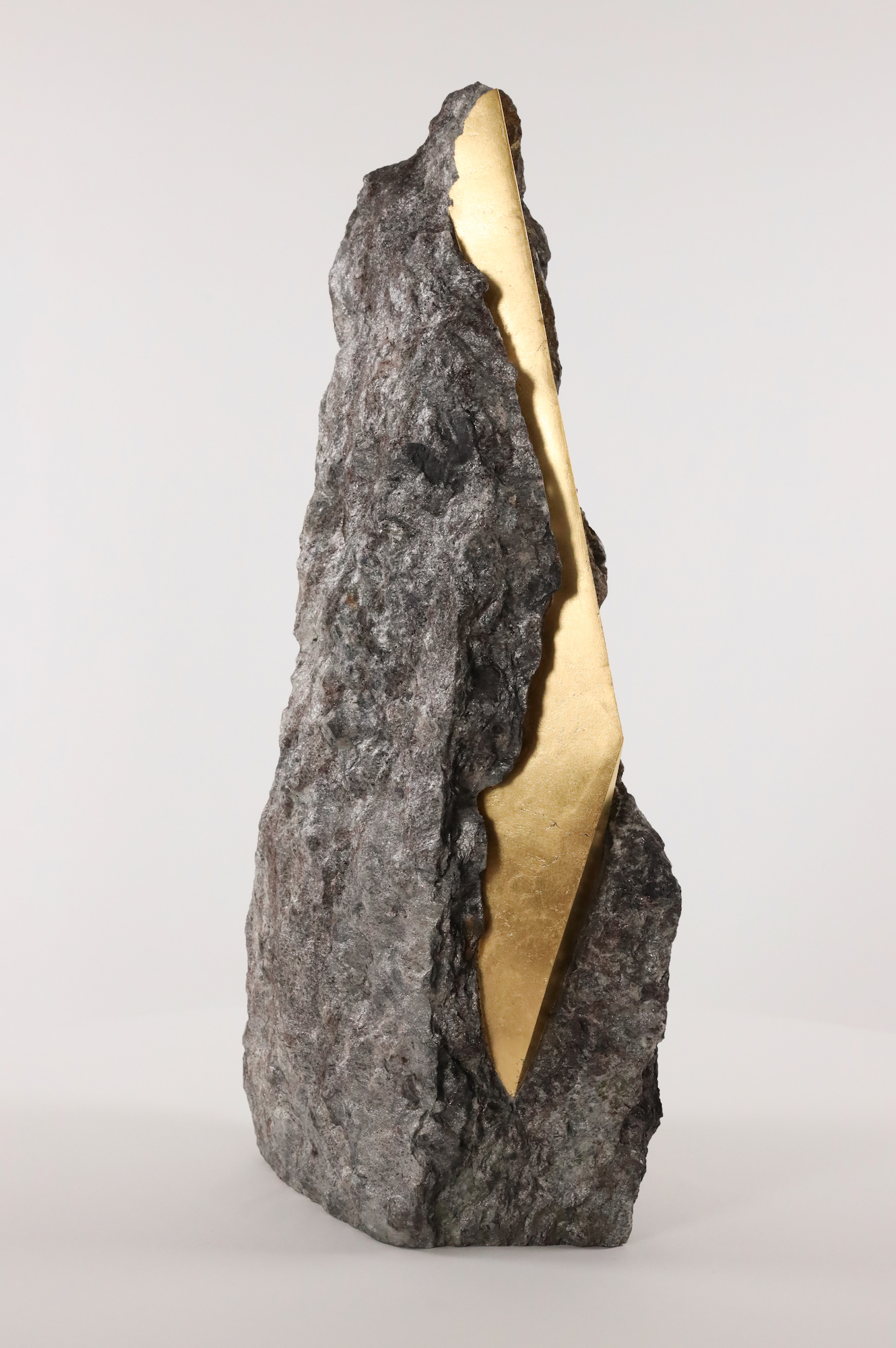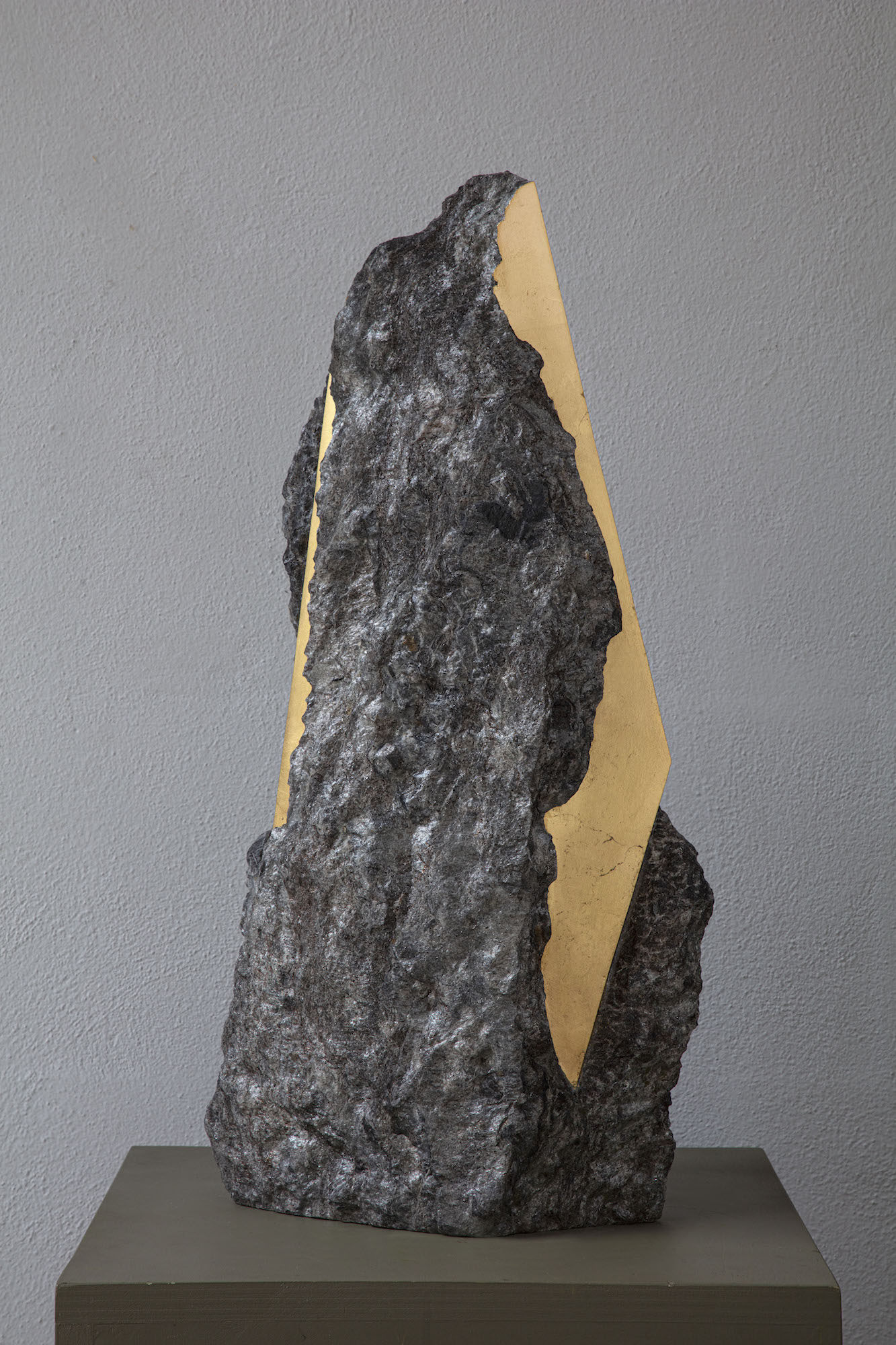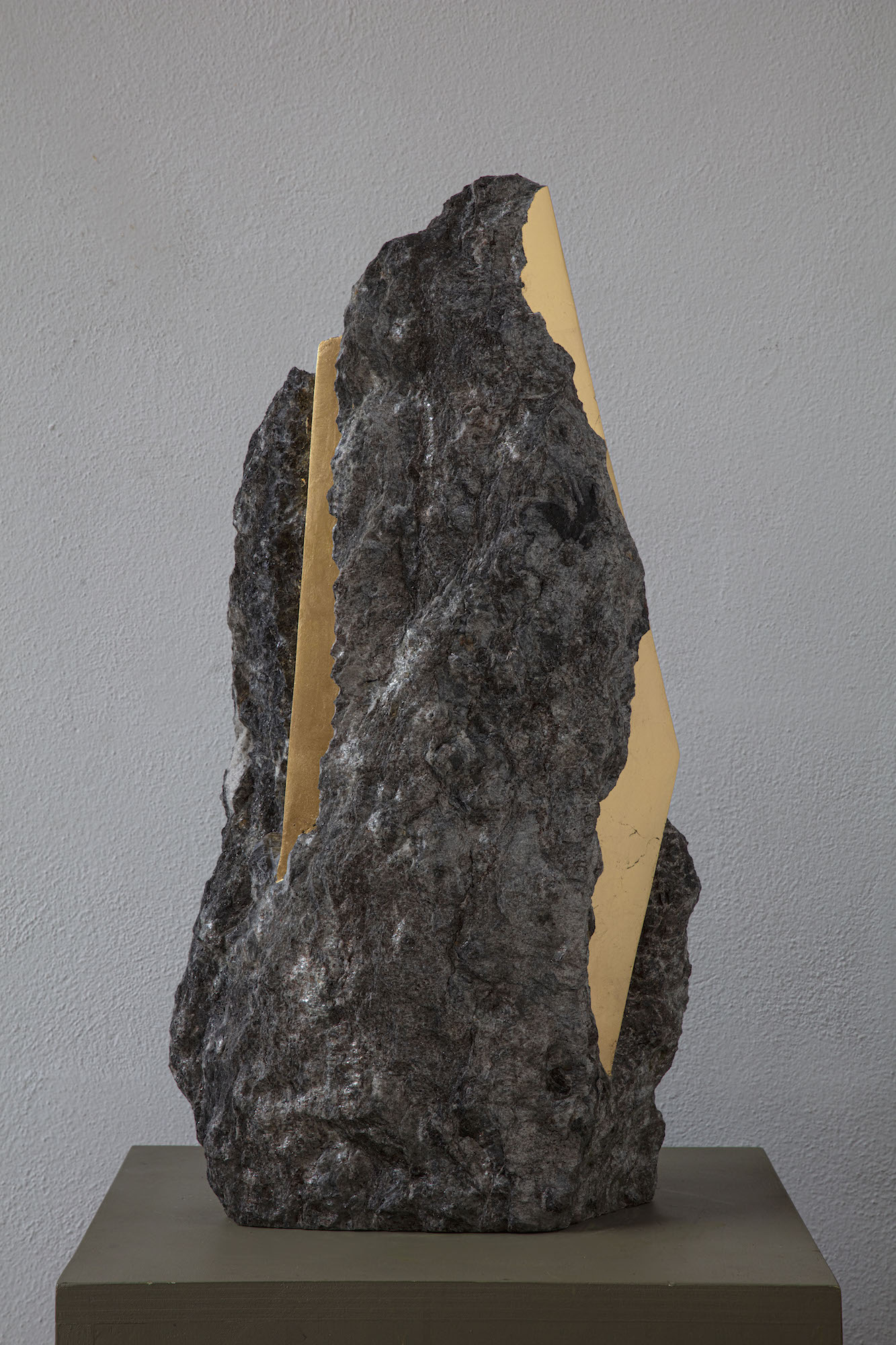 Afin d’accentuer encore davantage certaines formes et lignes de la pierre, l’artiste y applique de la feuille d’or. Cette série d’œuvres d’art, appelée « Sezione aurea » (« Section dorée »), est née de l’observation des pierres contenant du mica. Grâce à ce minéral faisant scintiller la pierre, l’artiste a décidé de cristalliser cette présence aurifère avec de la feuille d’or. Pour Mattia Bosco, si la pierre est une incarnation solide du temps, l’or s’apparente à de la lumière à l’état solide.