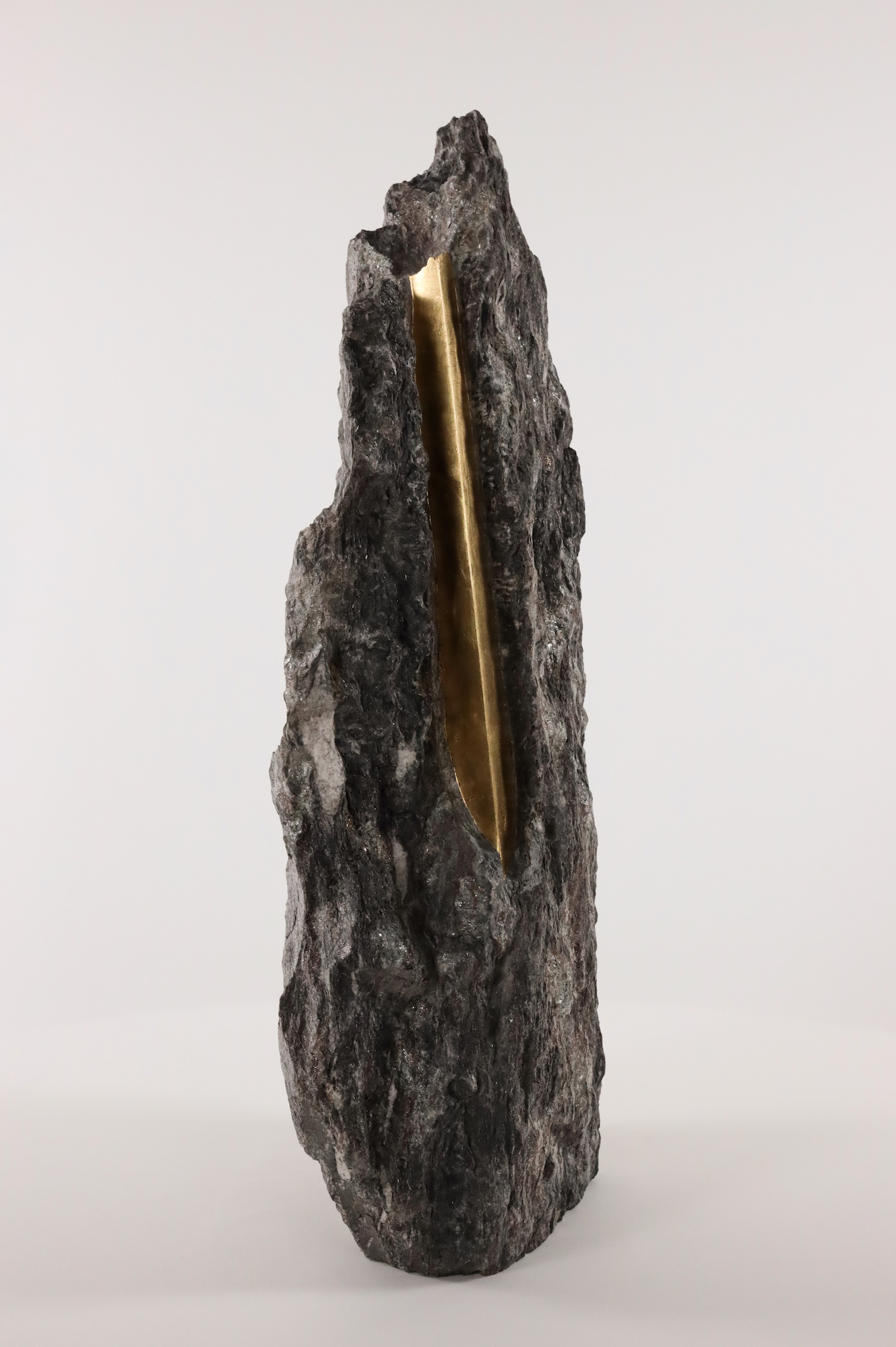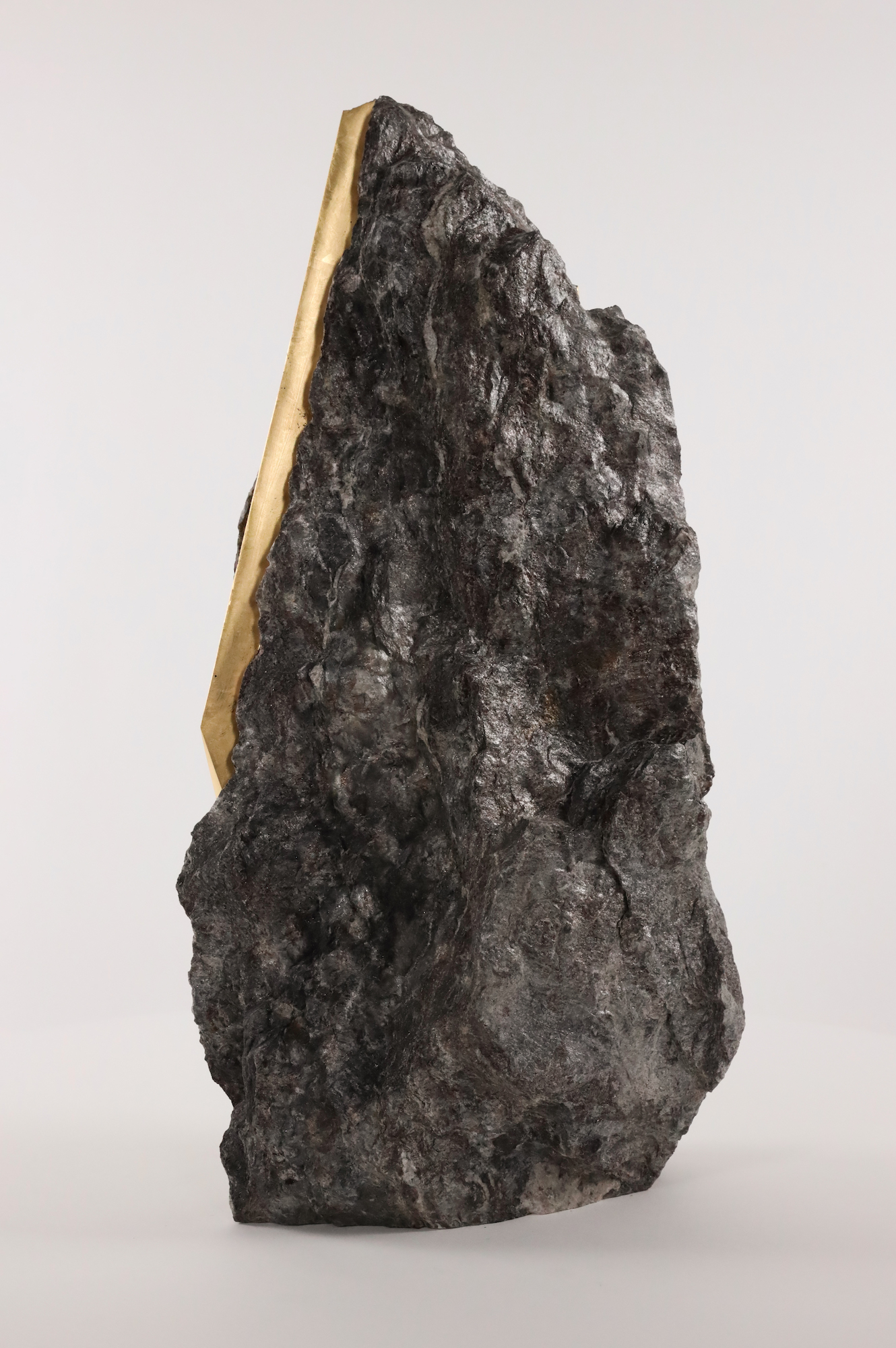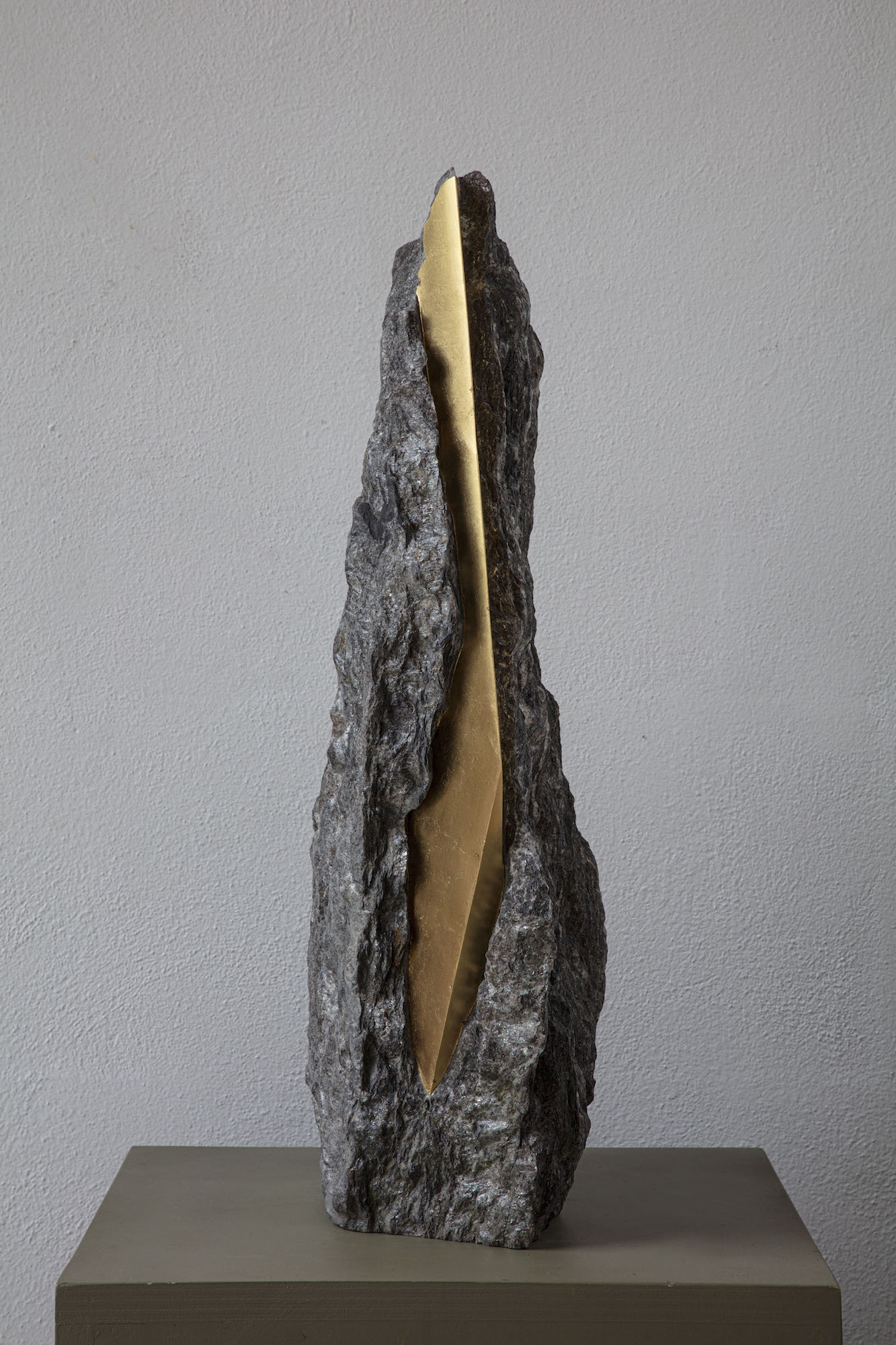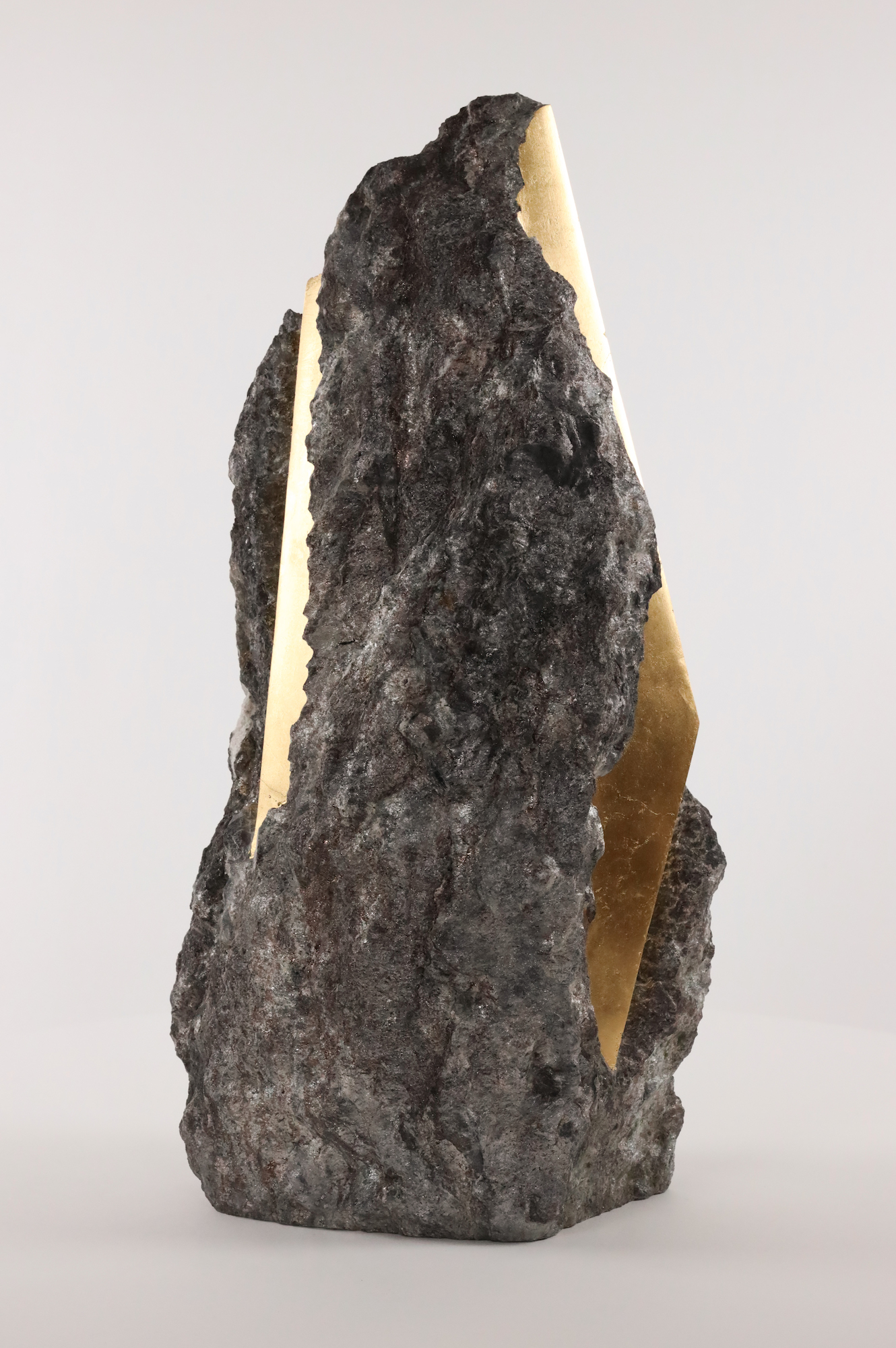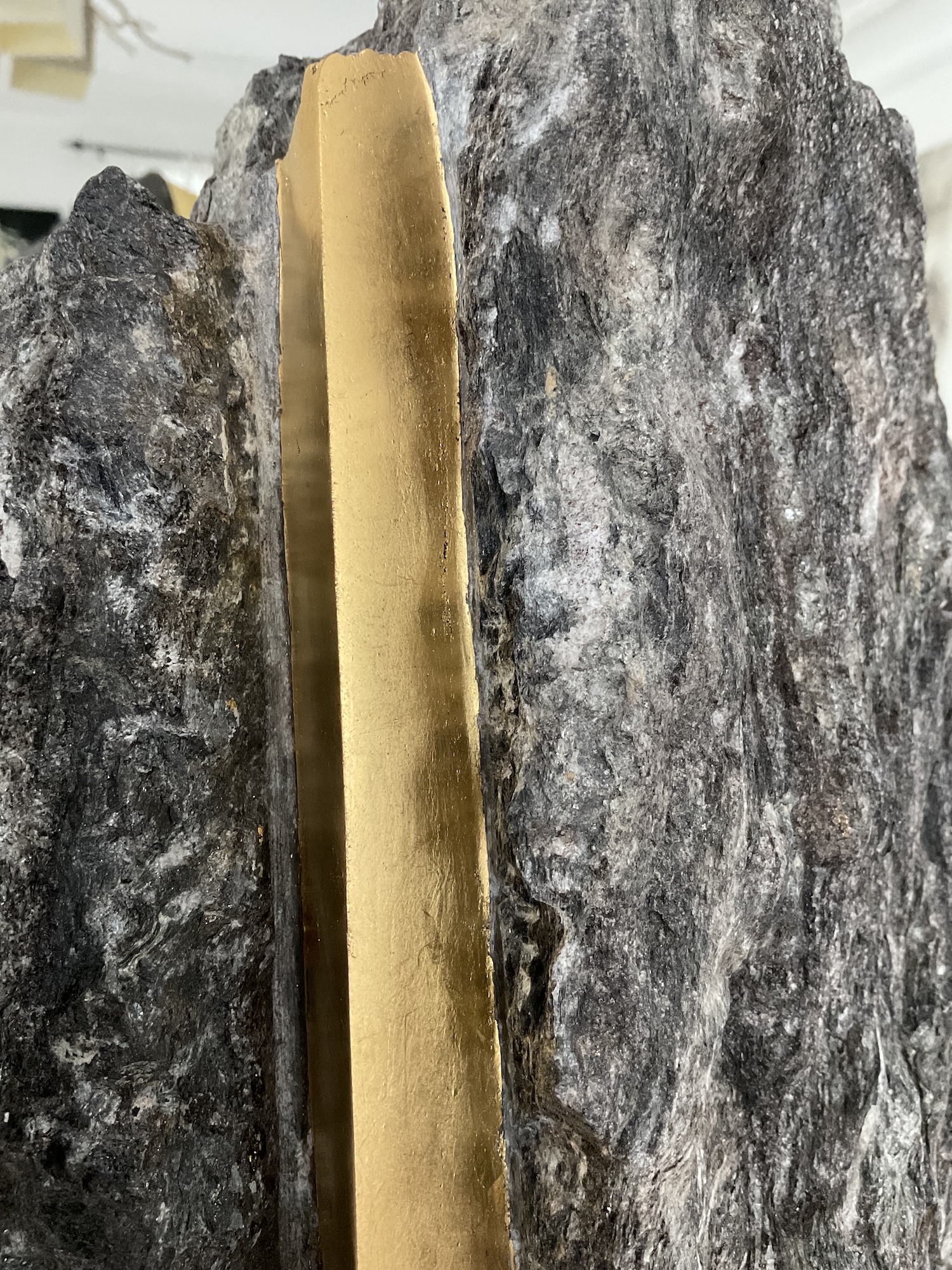 Afin d’accentuer encore davantage certaines formes et lignes de la pierre, l’artiste y applique de la feuille d’or. Cette série d’œuvres d’art, appelée « Sezione aurea » (« Section dorée »), est née de l’observation des pierres contenant du mica. Grâce à ce minéral faisant scintiller la pierre, l’artiste a décidé de cristalliser cette présence aurifère avec de la feuille d’or. Pour Mattia Bosco, si la pierre est une incarnation solide du temps, l’or s’apparente à de la lumière à l’état solide.