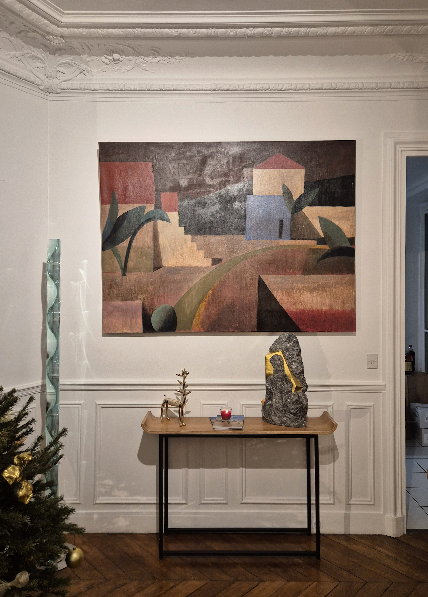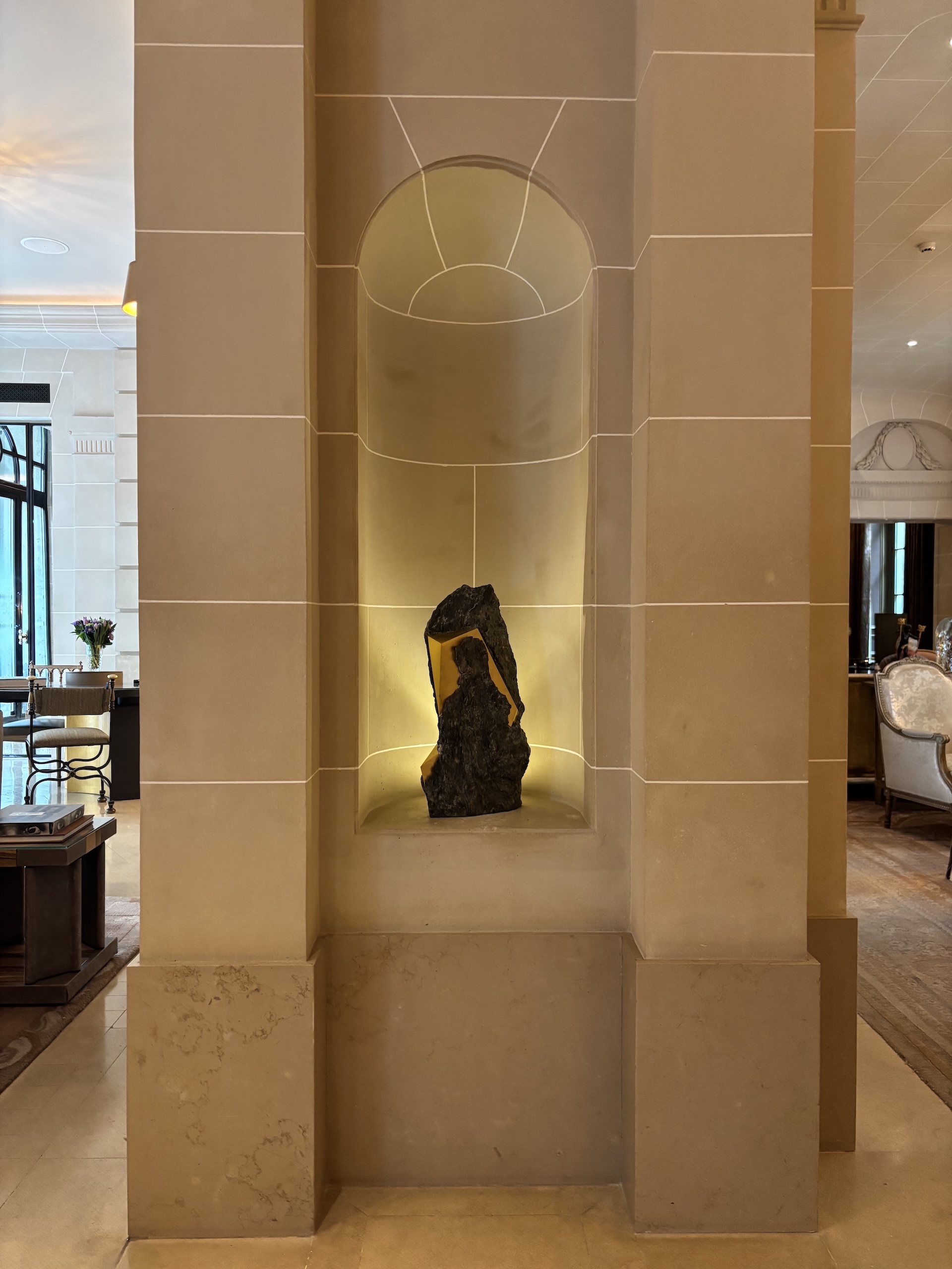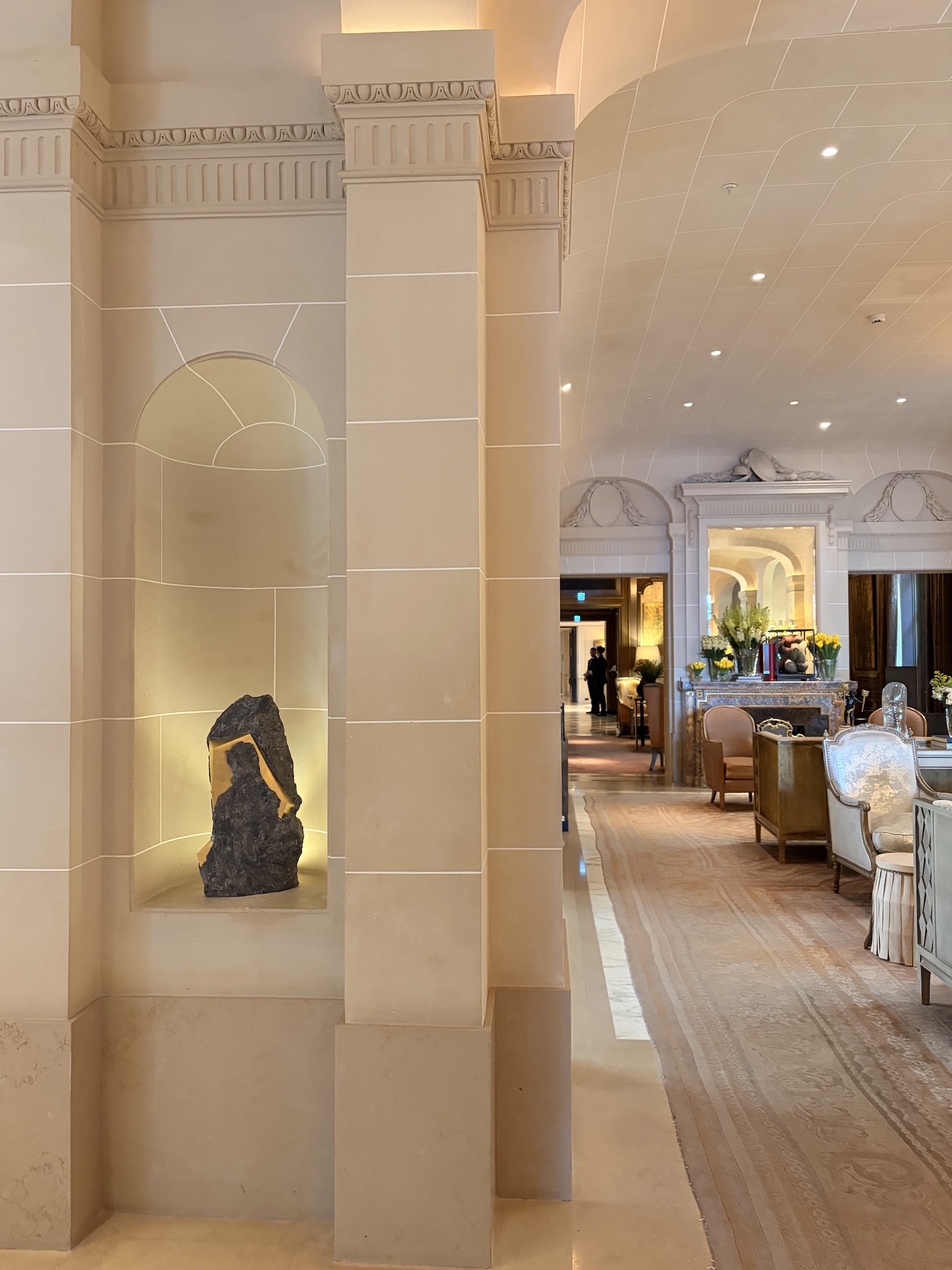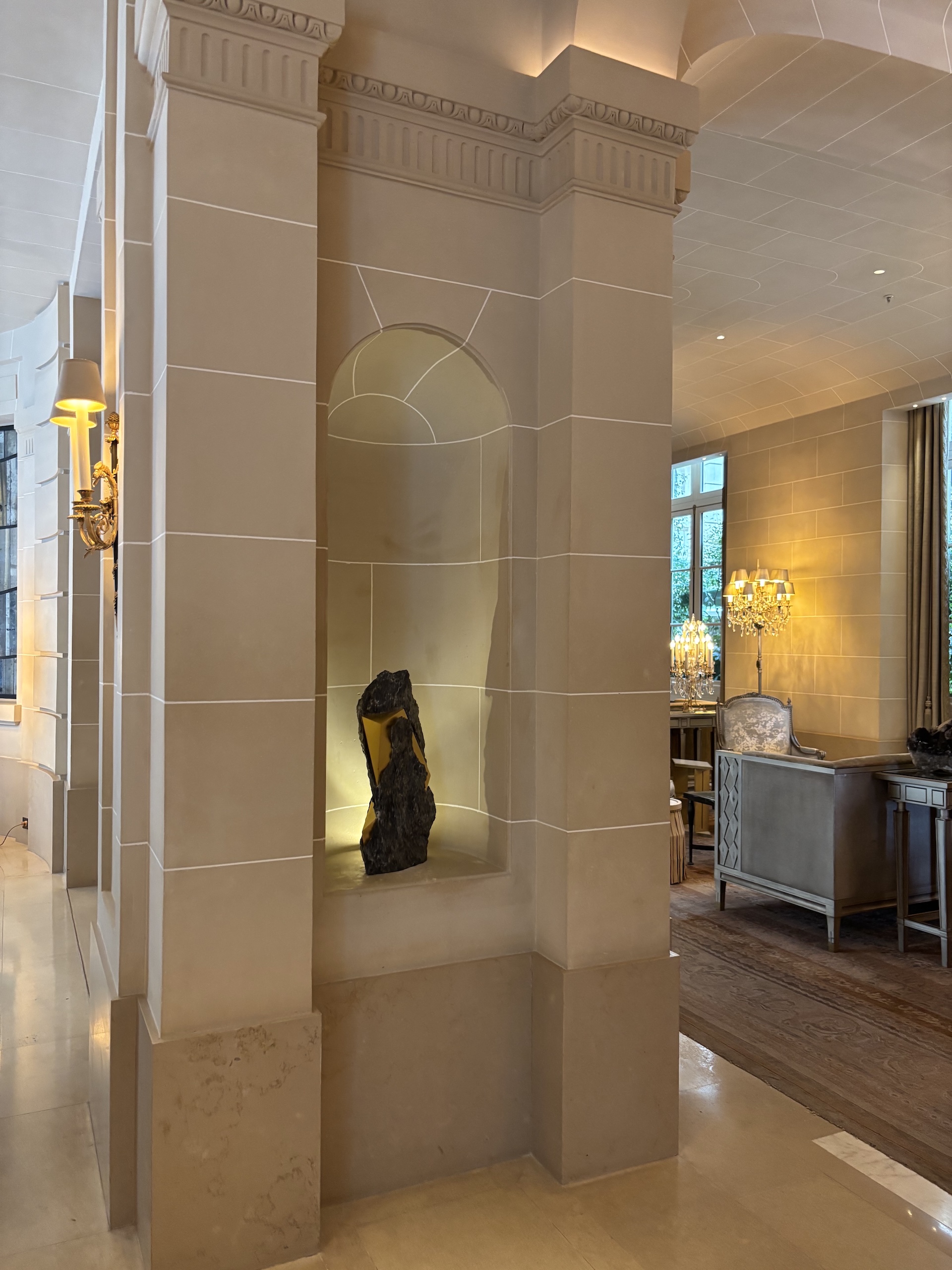 Les photographies prises dans un intérieur d’hôtel montrent l’œuvre exposée à l’Hôtel de Crillon (Paris, février-mars 2026).
