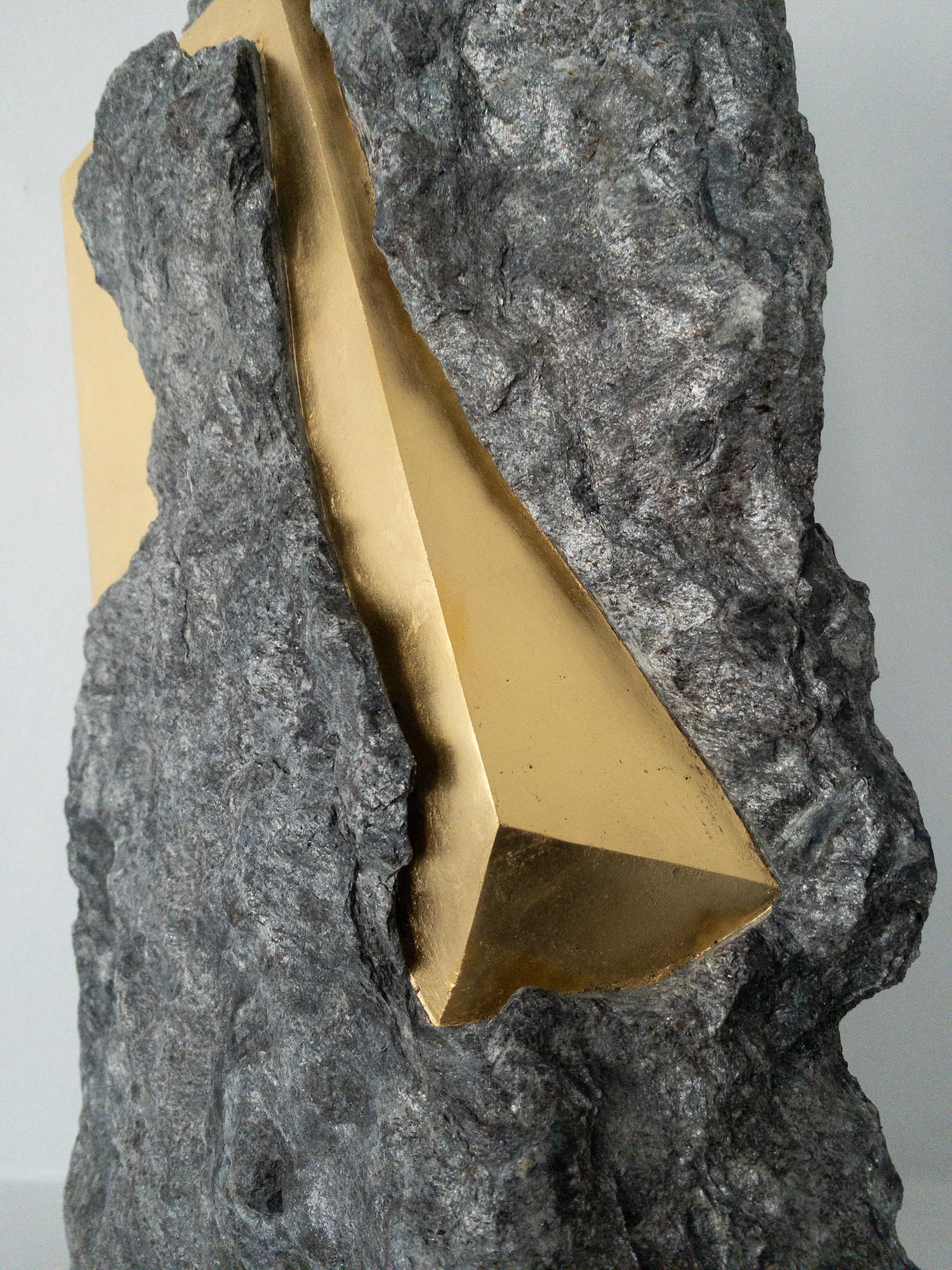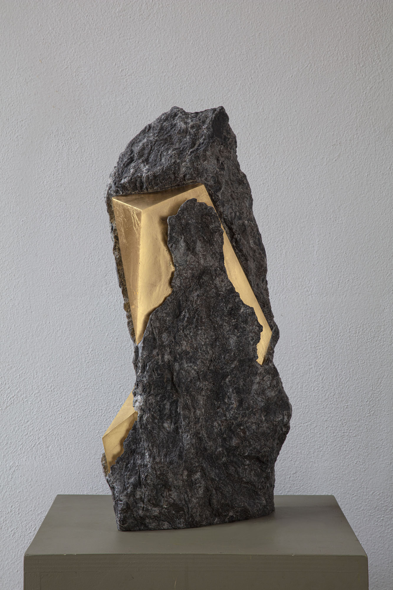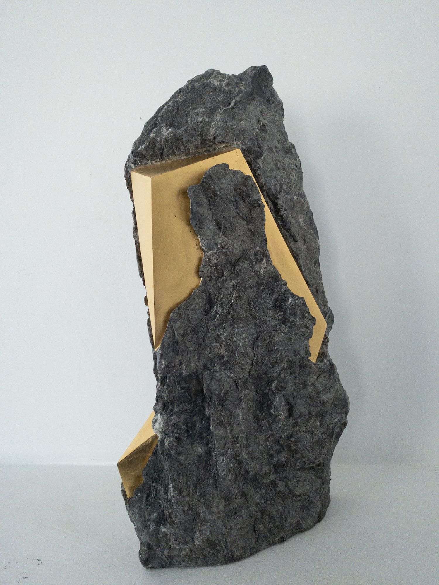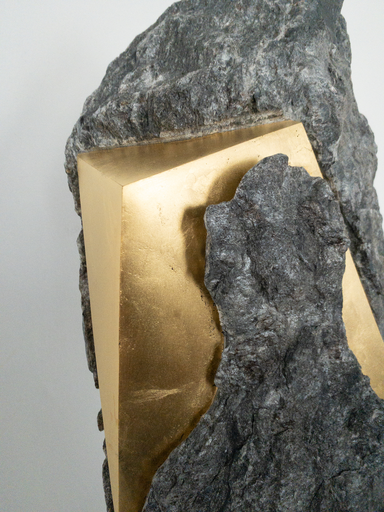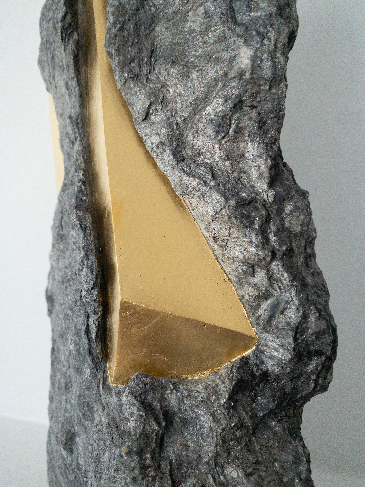 Afin d’accentuer encore davantage certaines formes et lignes de la pierre, l’artiste y applique de la feuille d’or. Cette série d’œuvres d’art, appelée « Sezione aurea » (« Section dorée »), est née de l’observation des pierres contenant du mica. Grâce à ce minéral faisant scintiller la pierre, l’artiste a décidé de cristalliser cette présence aurifère avec de la feuille d’or. Pour Mattia Bosco, si la pierre est une incarnation solide du temps, l’or s’apparente à de la lumière à l’état solide.