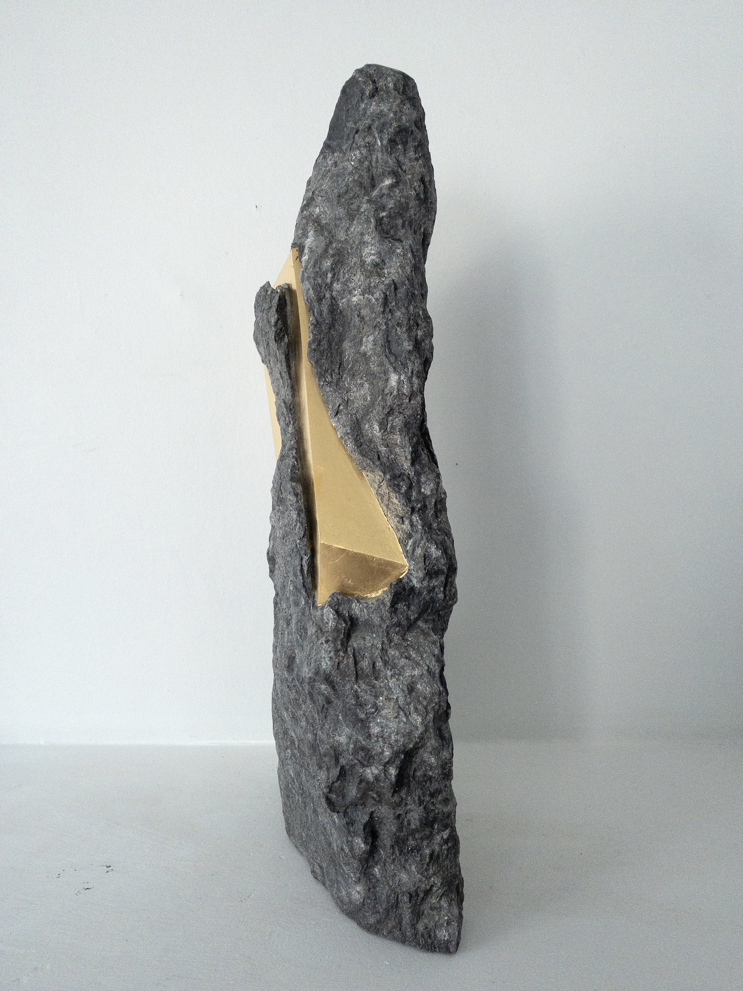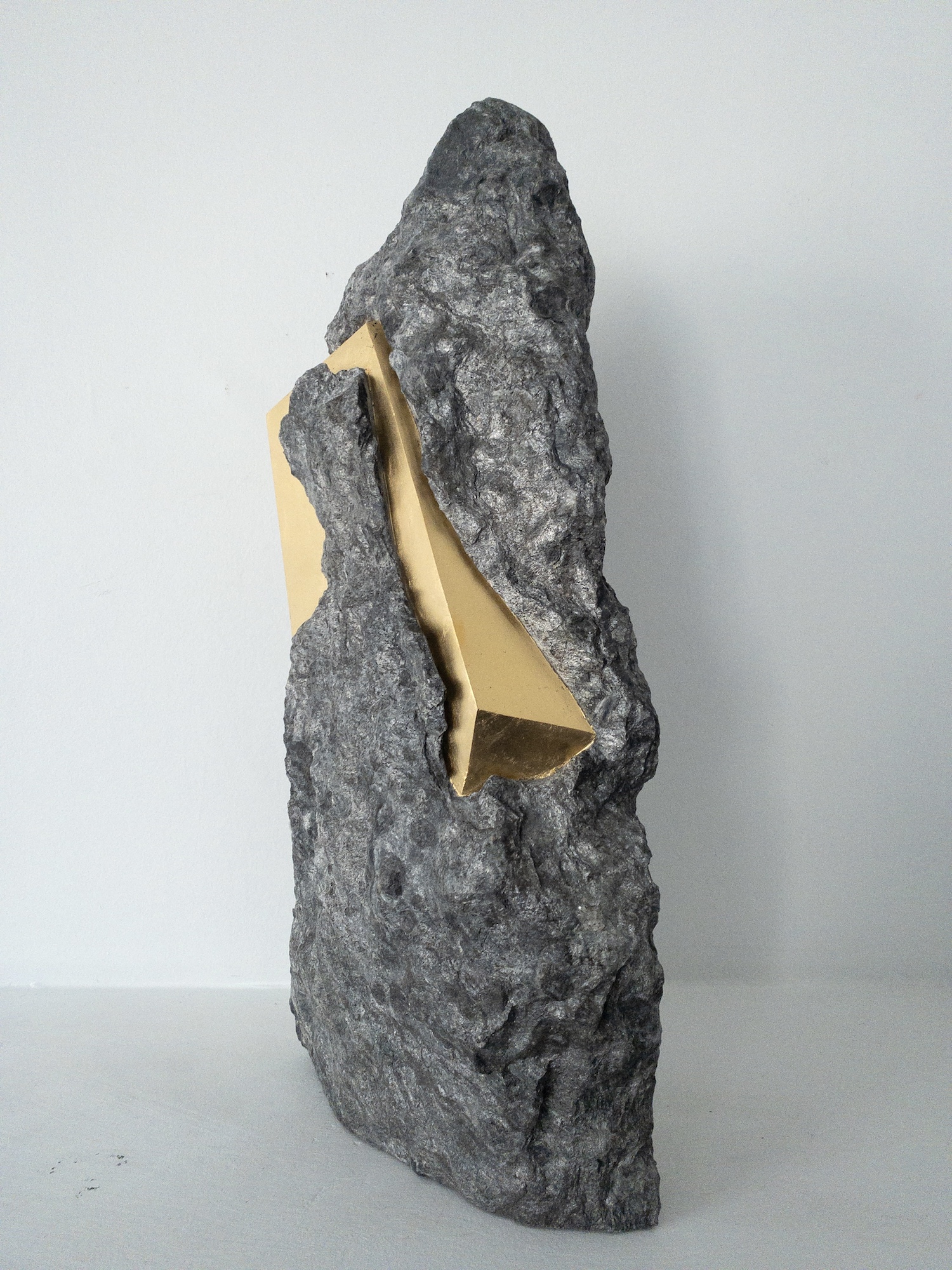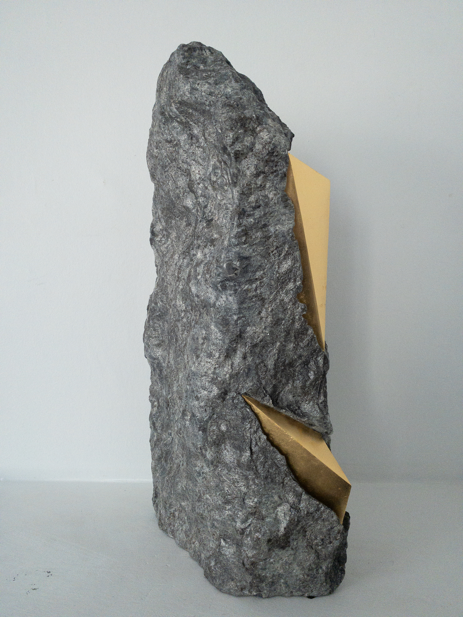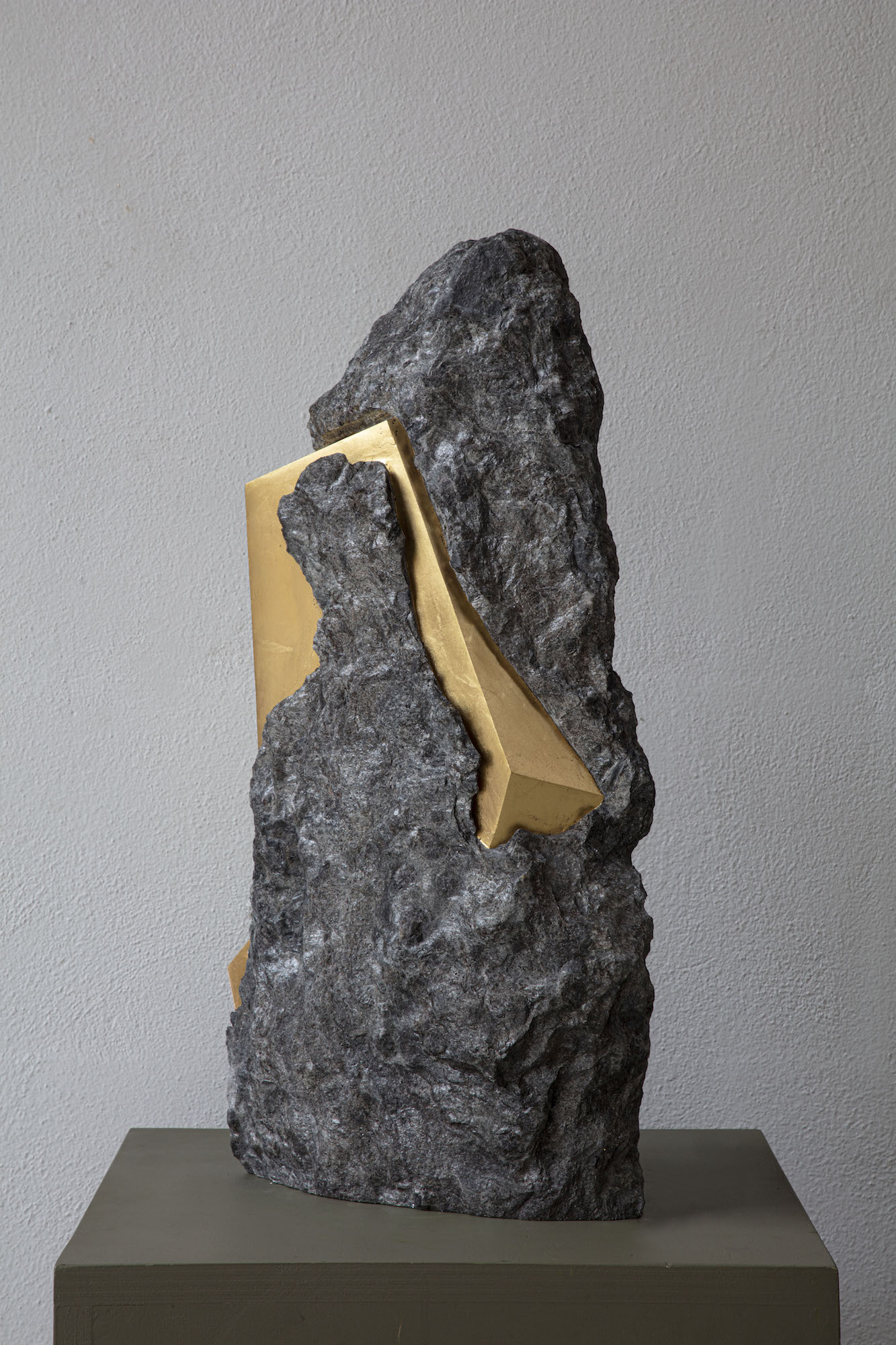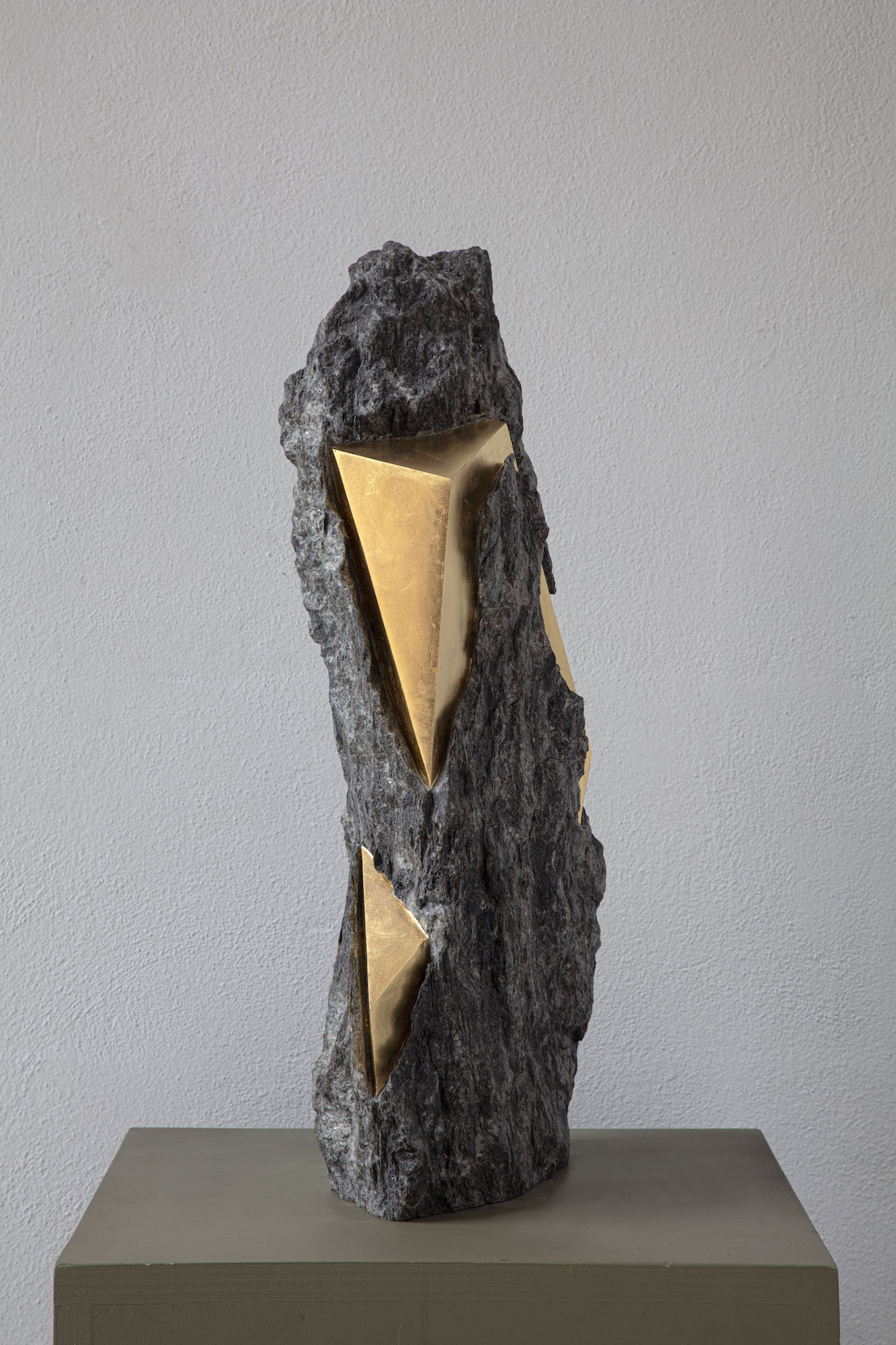 Afin d’accentuer encore davantage certaines formes et lignes de la pierre, l’artiste y applique de la feuille d’or. Cette série d’œuvres d’art, appelée « Sezione aurea » (« Section dorée »), est née de l’observation des pierres contenant du mica. Grâce à ce minéral faisant scintiller la pierre, l’artiste a décidé de cristalliser cette présence aurifère avec de la feuille d’or. Pour Mattia Bosco, si la pierre est une incarnation solide du temps, l’or s’apparente à de la lumière à l’état solide.
