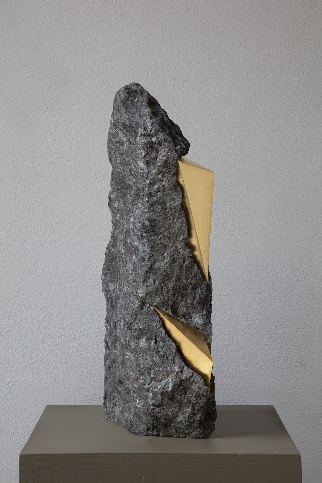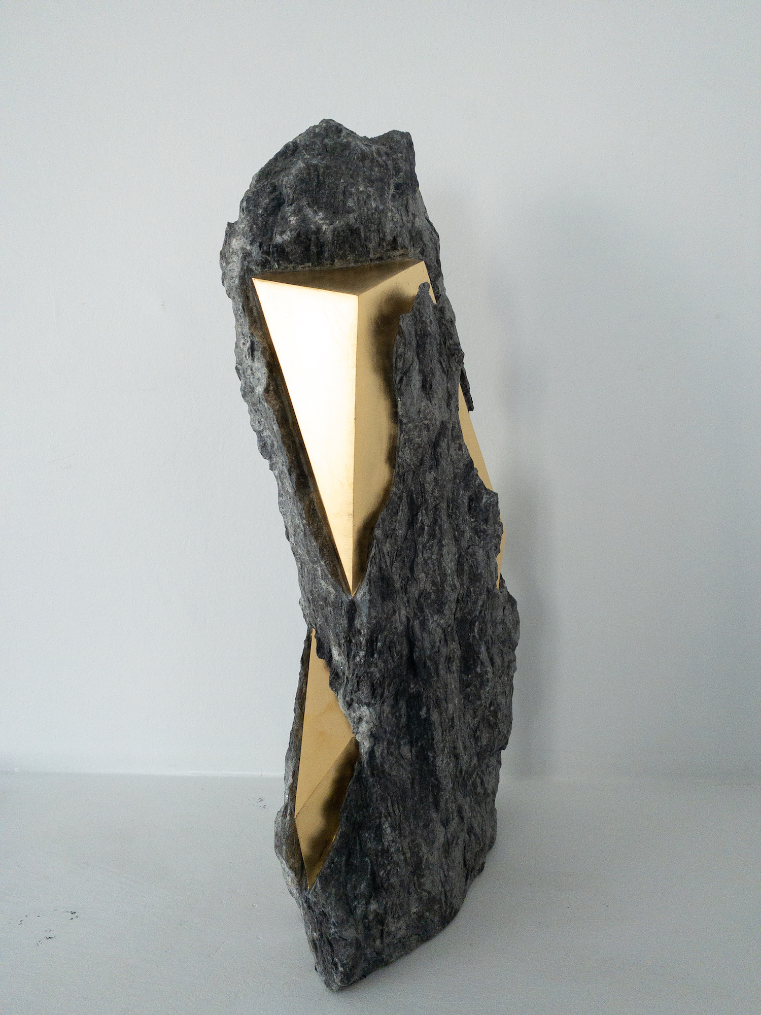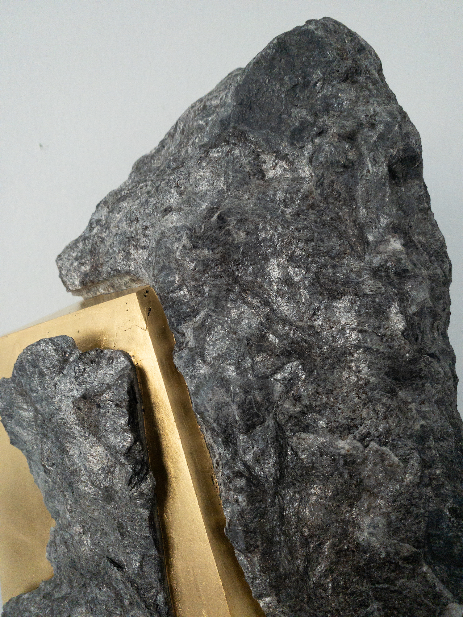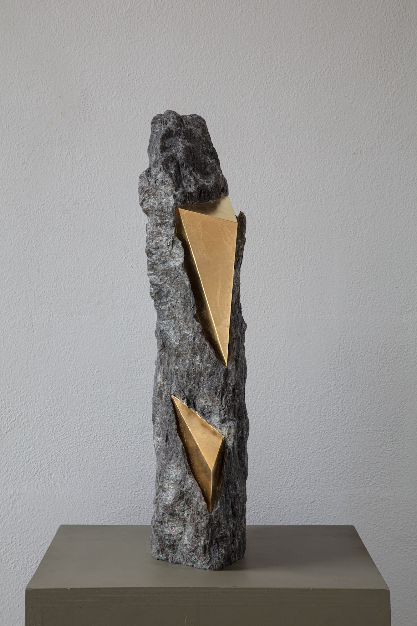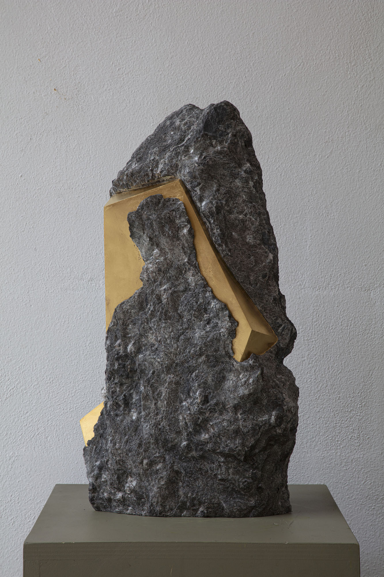 Afin d’accentuer encore davantage certaines formes et lignes de la pierre, l’artiste y applique de la feuille d’or. Cette série d’œuvres d’art, appelée « Sezione aurea » (« Section dorée »), est née de l’observation des pierres contenant du mica. Grâce à ce minéral faisant scintiller la pierre, l’artiste a décidé de cristalliser cette présence aurifère avec de la feuille d’or. Pour Mattia Bosco, si la pierre est une incarnation solide du temps, l’or s’apparente à de la lumière à l’état solide.