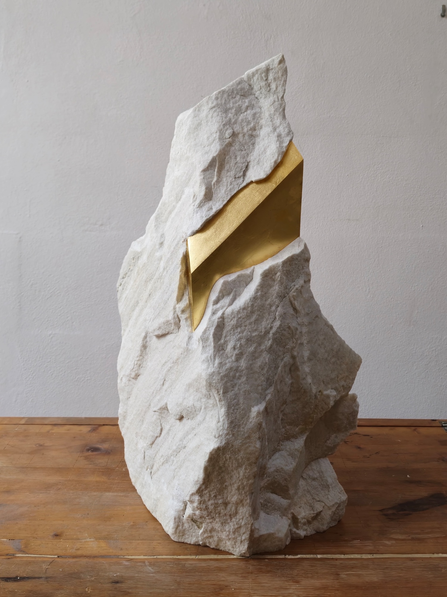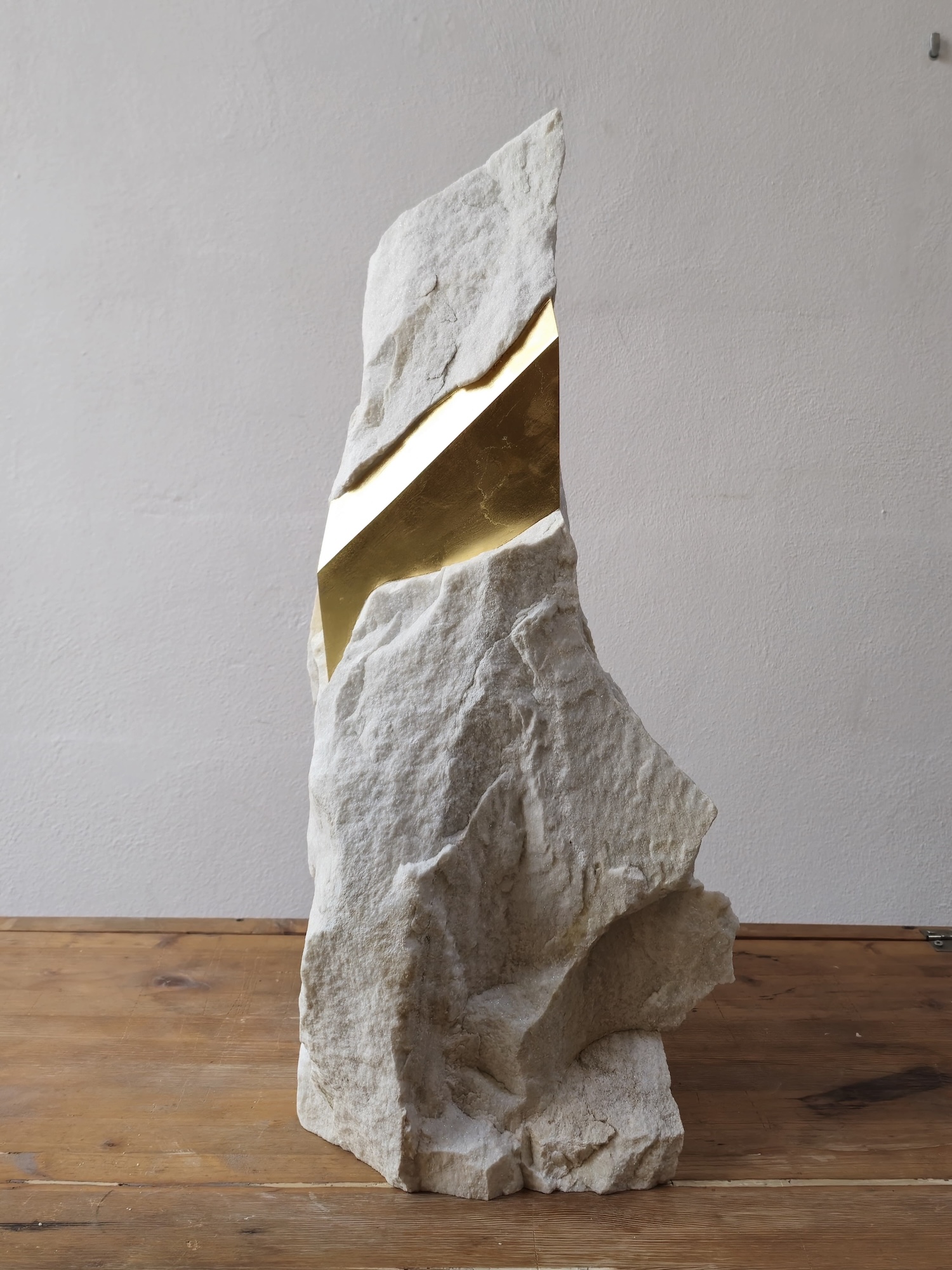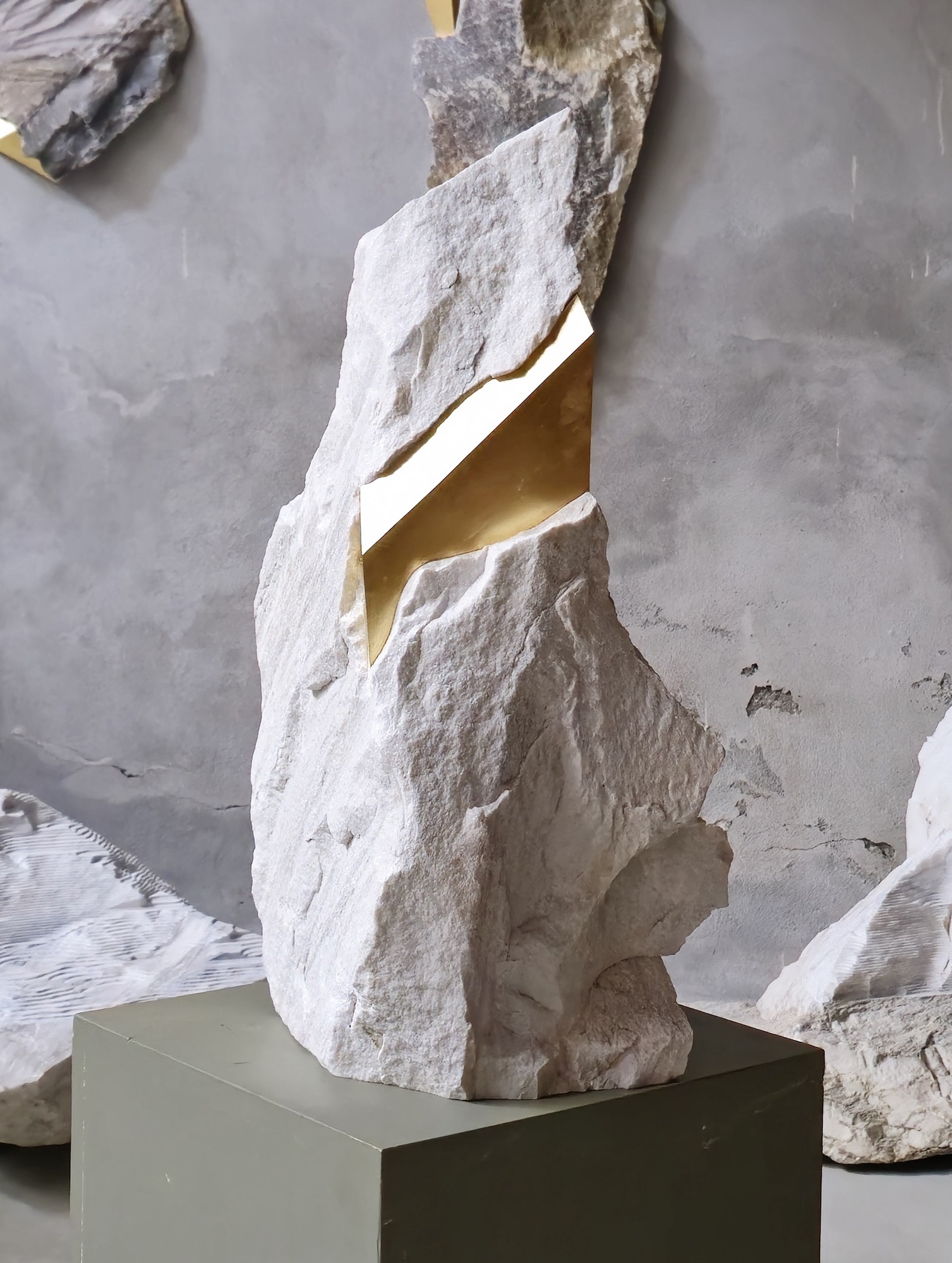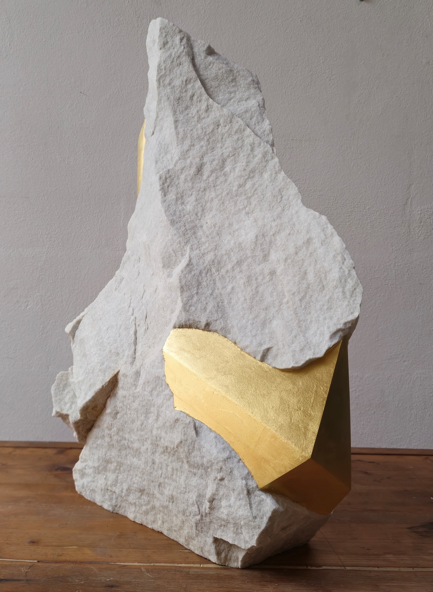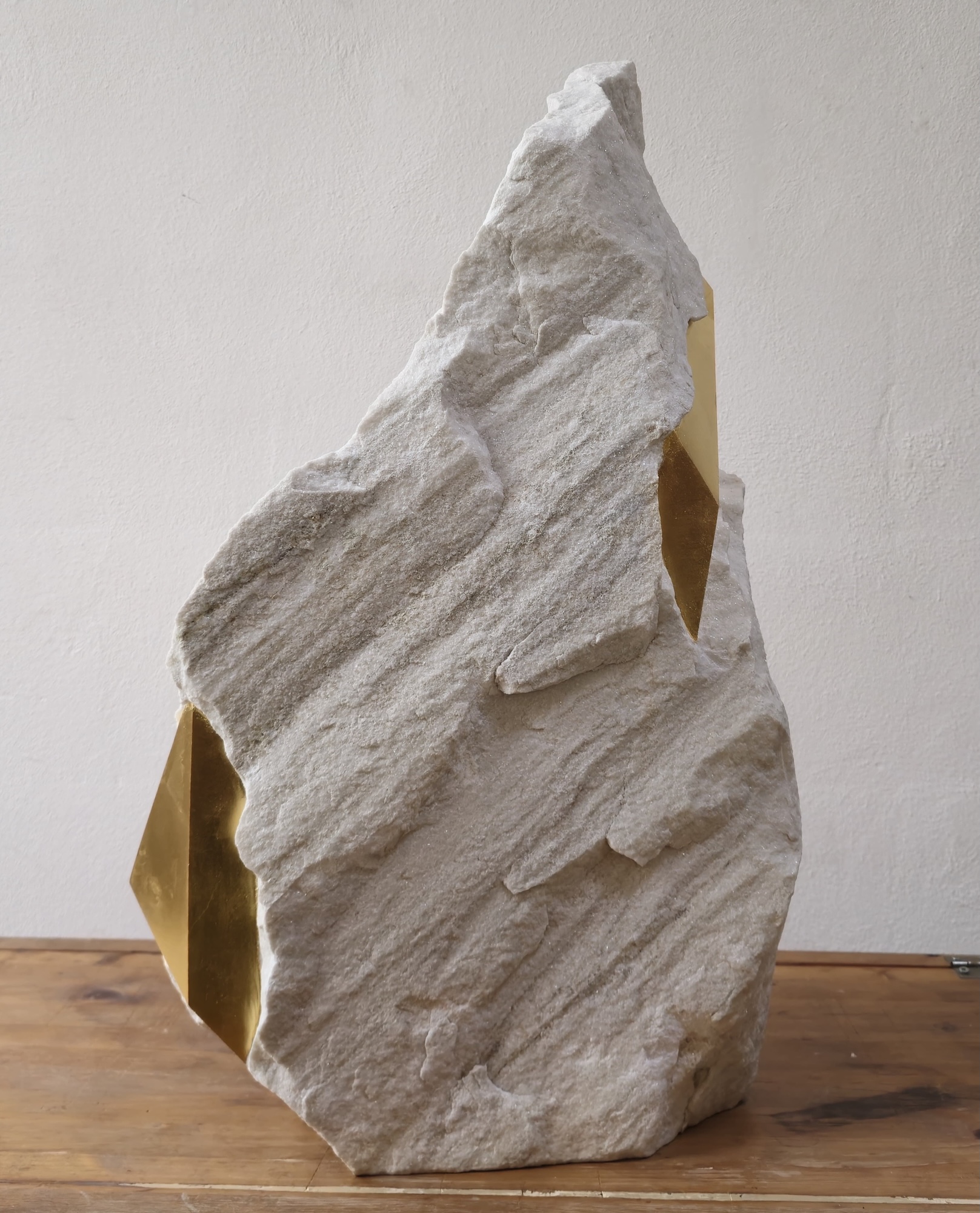 Afin d’accentuer encore davantage certaines formes et lignes de la pierre, l’artiste y applique de la feuille d’or. Cette série d’œuvres d’art, appelée « Sezione aurea » (« Section dorée »), est née de l’observation des pierres contenant du mica. Grâce à ce minéral faisant scintiller la pierre, l’artiste a décidé de cristalliser cette présence aurifère avec de la feuille d’or. Pour Mattia Bosco, si la pierre est une incarnation solide du temps, l’or s’apparente à de la lumière à l’état solide.