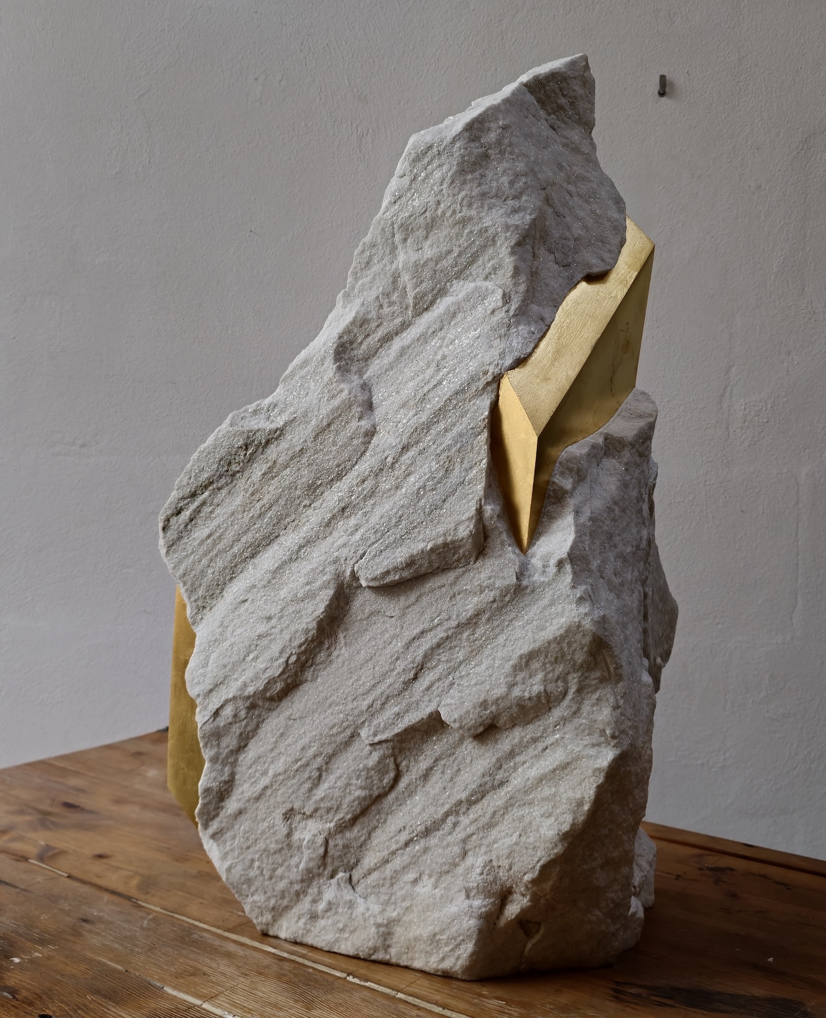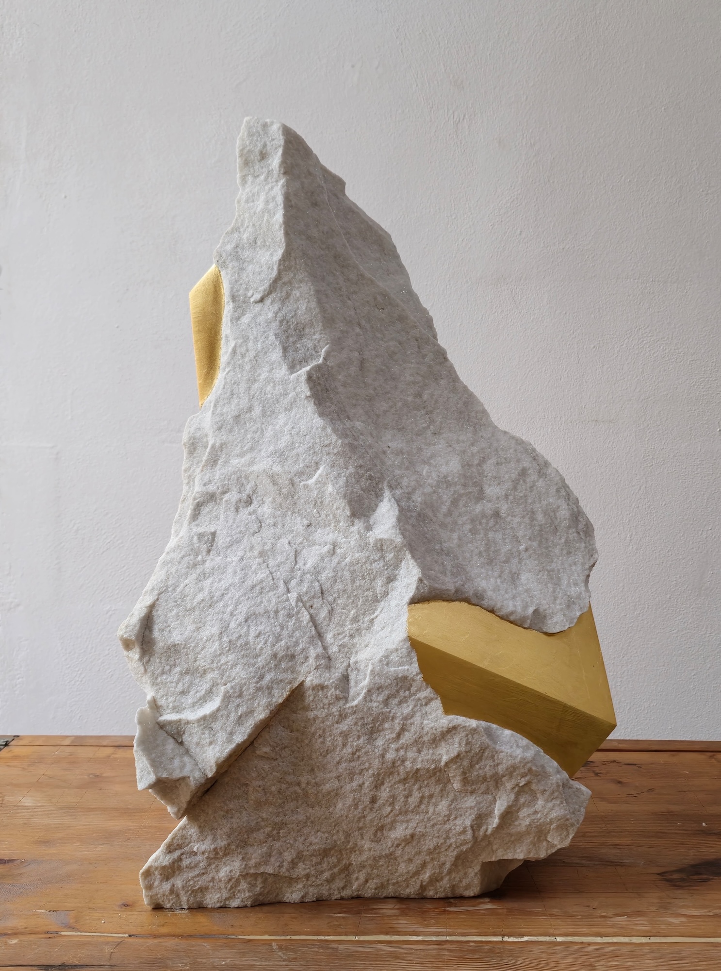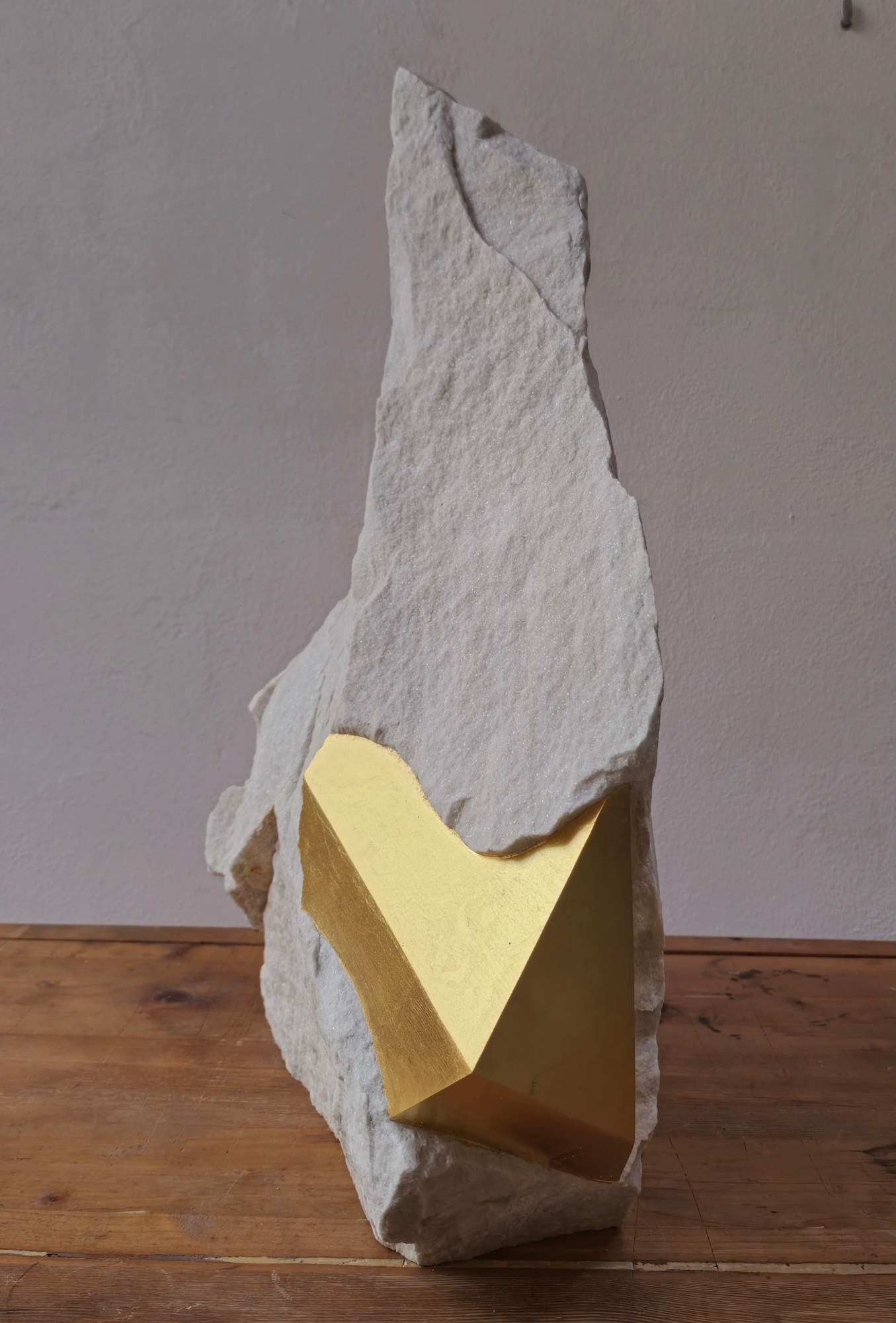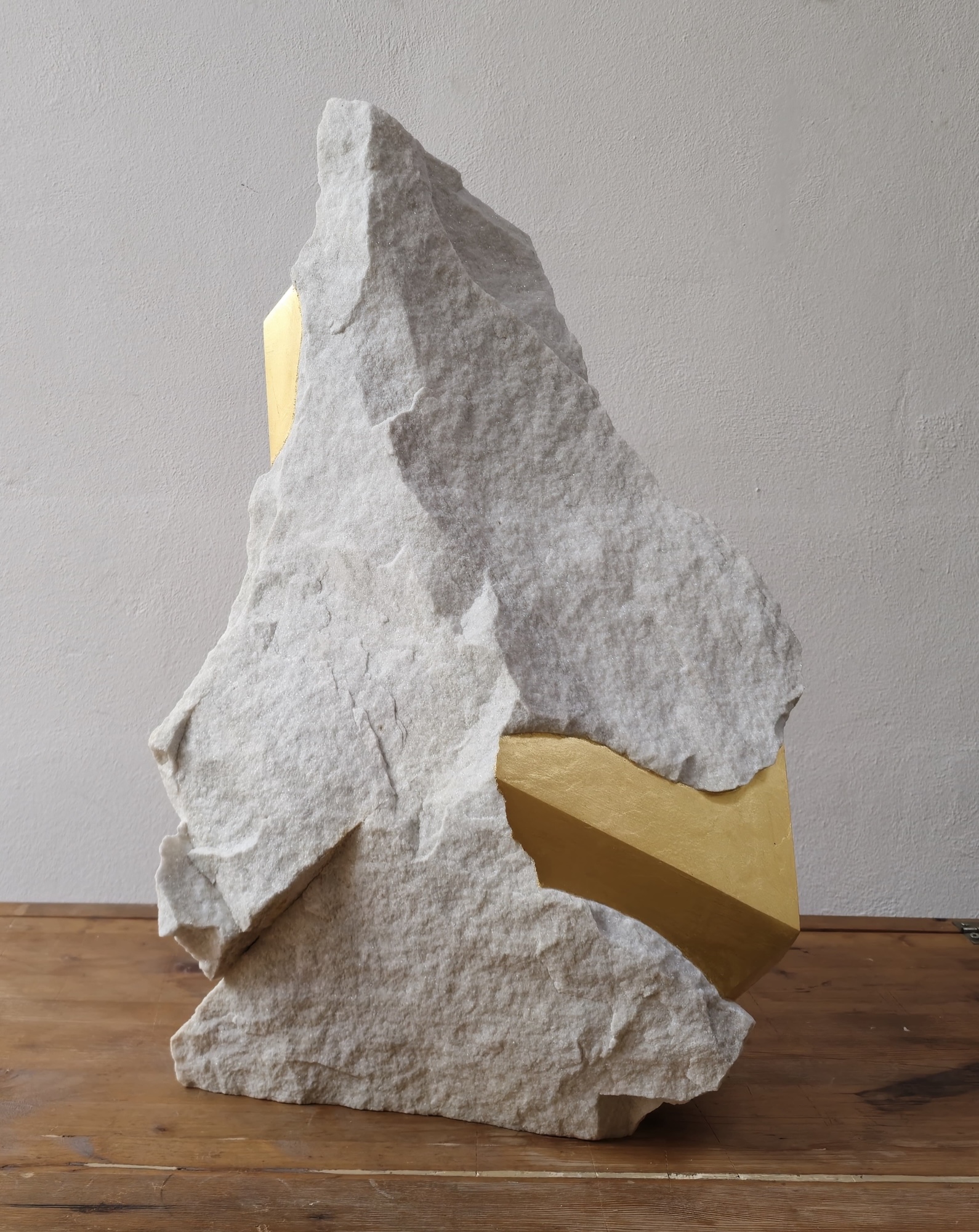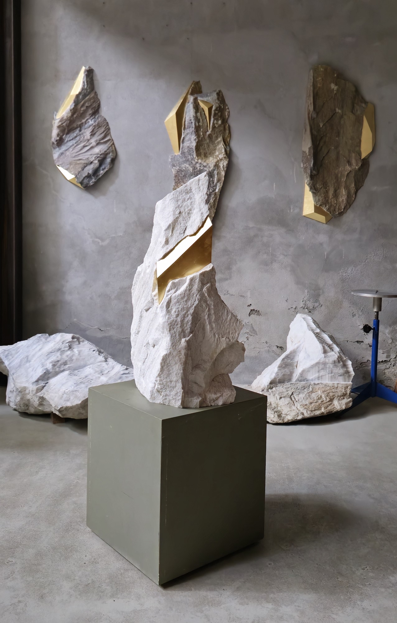 Afin d’accentuer encore davantage certaines formes et lignes de la pierre, l’artiste y applique de la feuille d’or. Cette série d’œuvres d’art, appelée « Sezione aurea » (« Section dorée »), est née de l’observation des pierres contenant du mica. Grâce à ce minéral faisant scintiller la pierre, l’artiste a décidé de cristalliser cette présence aurifère avec de la feuille d’or. Pour Mattia Bosco, si la pierre est une incarnation solide du temps, l’or s’apparente à de la lumière à l’état solide.