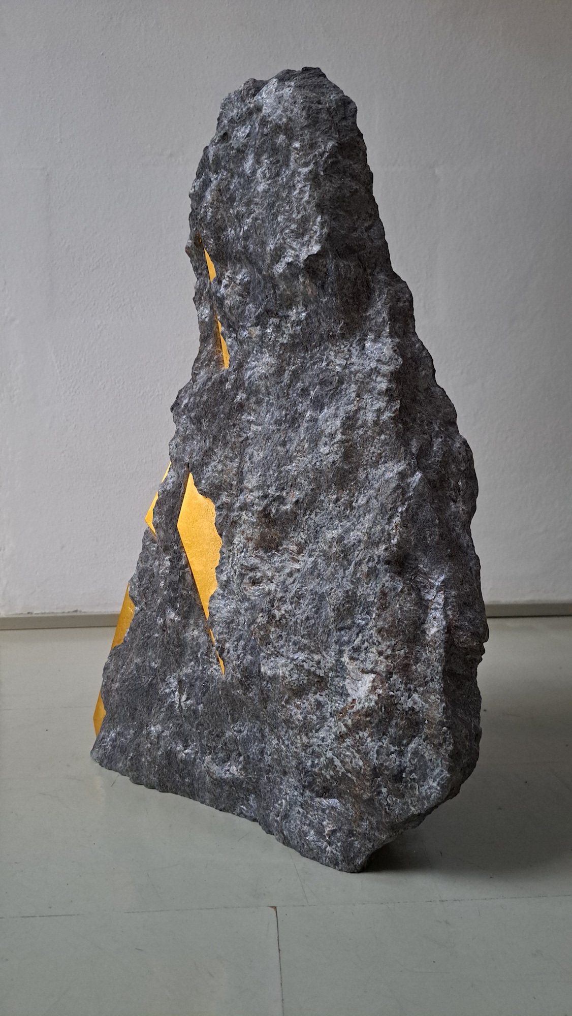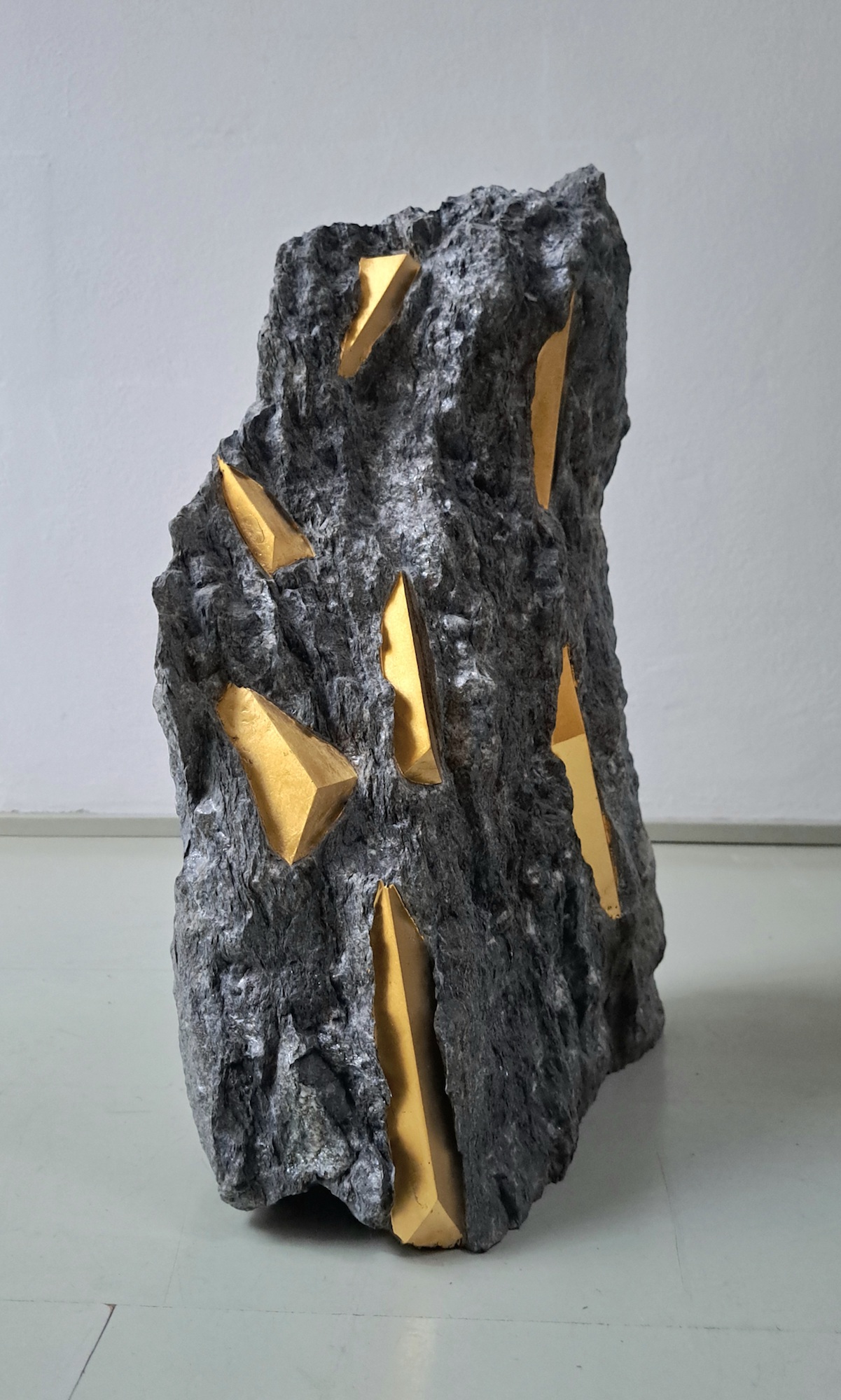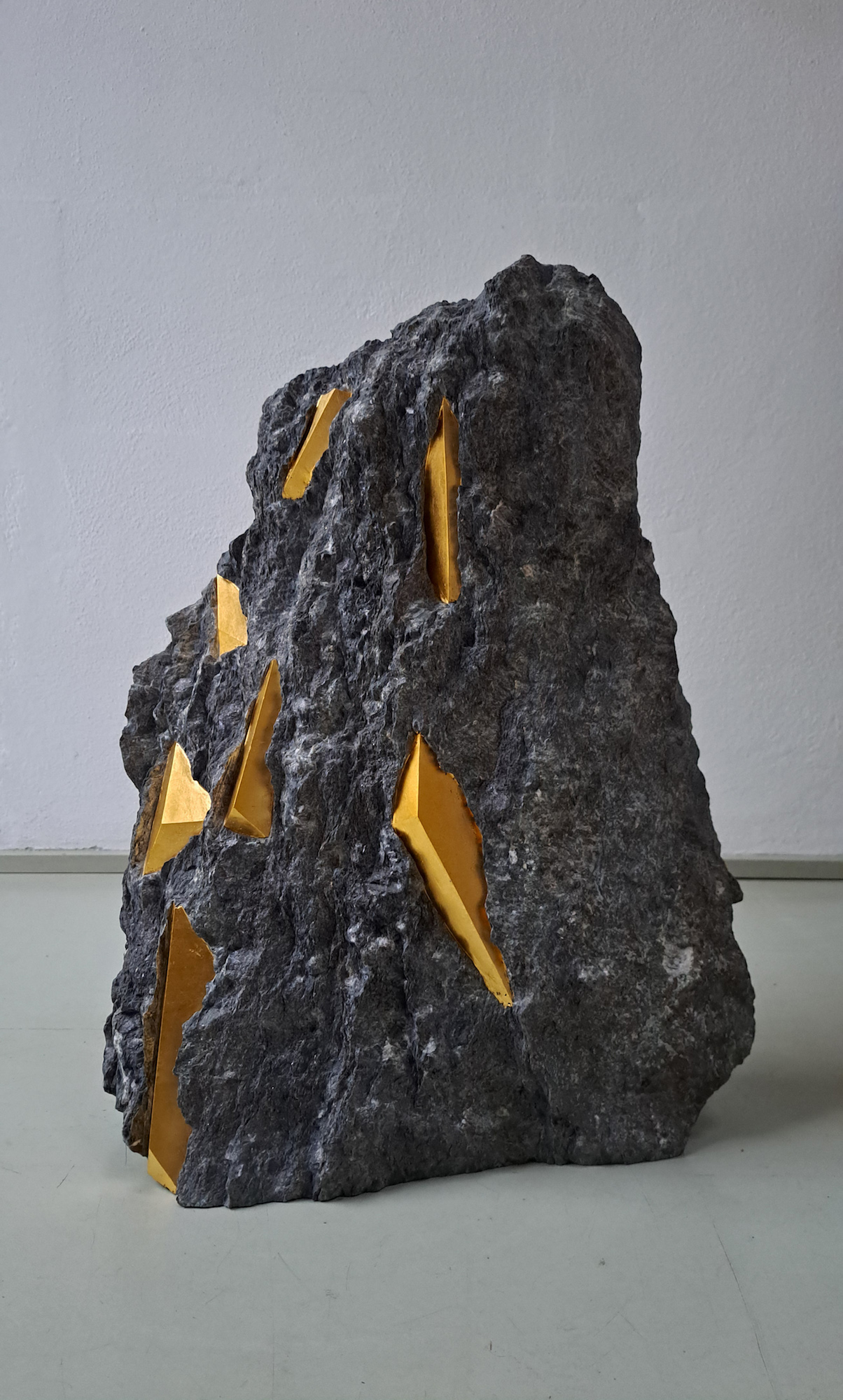 Afin d’accentuer encore davantage certaines formes et lignes de la pierre, l’artiste y applique de la feuille d’or. Cette série d’œuvres d’art, appelée « Sezione aurea » (« Section dorée »), est née de l’observation des pierres contenant du mica. Grâce à ce minéral faisant scintiller la pierre, l’artiste a décidé de cristalliser cette présence aurifère avec de la feuille d’or. Pour Mattia Bosco, si la pierre est une incarnation solide du temps, l’or s’apparente à de la lumière à l’état solide.