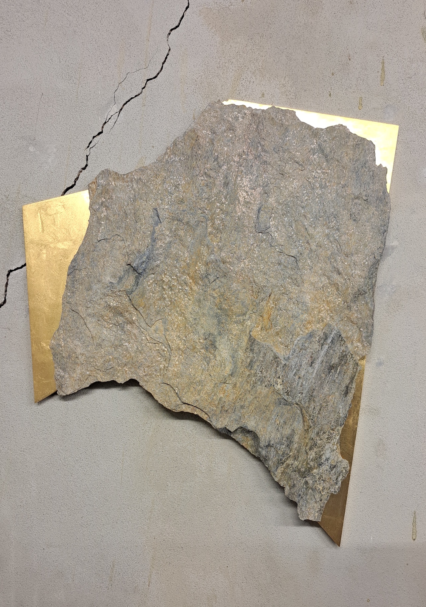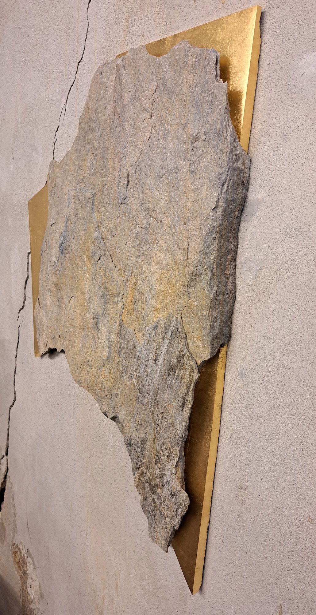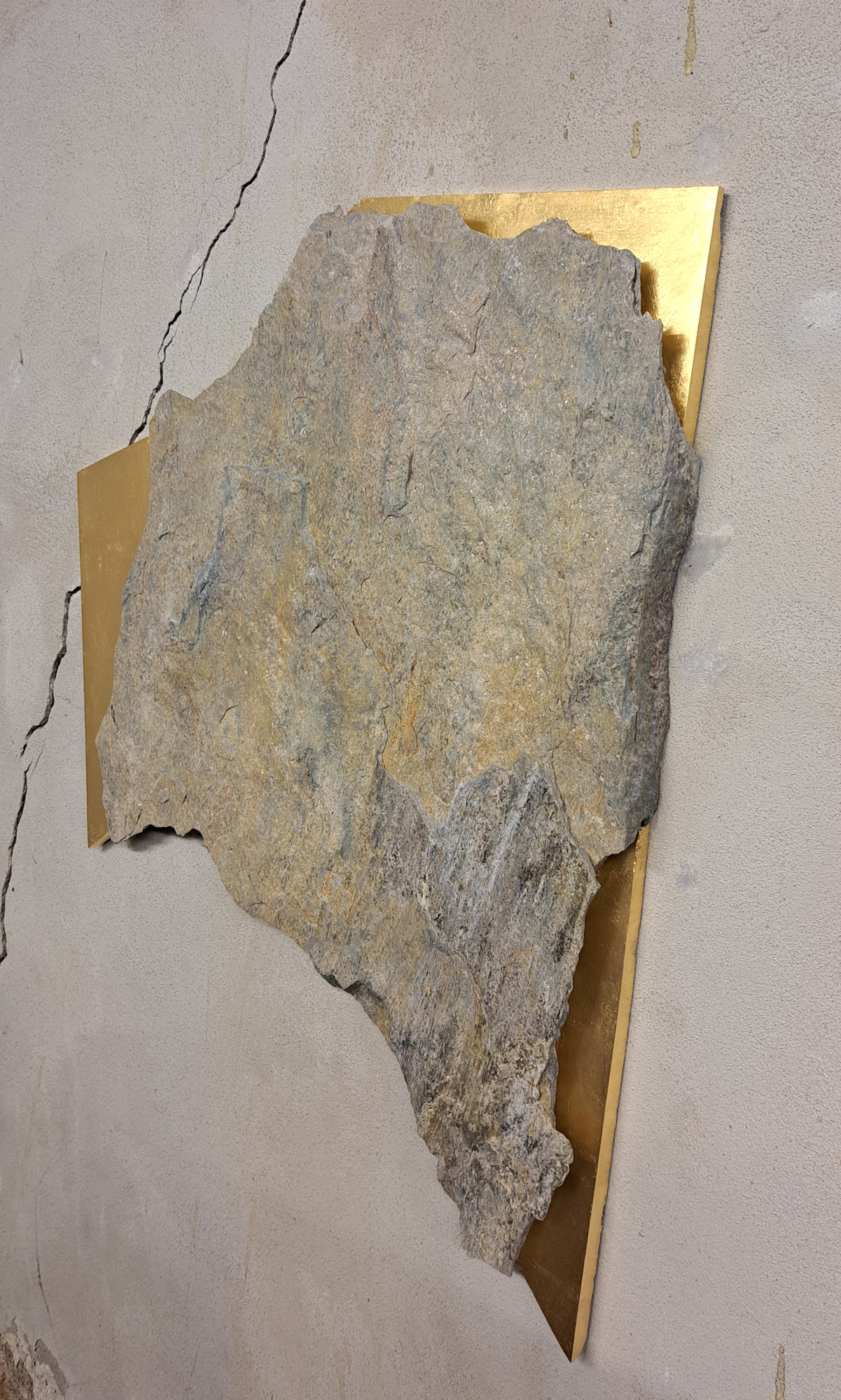 Afin d’accentuer encore davantage certaines formes et lignes de la pierre, l’artiste y applique de la feuille d’argent. Le choix de l’argent provient du scintillement argenté naturel de la pierre ; l’artiste a alors décidé de cristalliser cette présence brillante avec de la feuille d’argent. Par rapport à l’or, également utilisé par l’artiste, l’argent offre une possibilité esthétique supplémentaire : celle conférée par l’oxydation, qui peut apporter à la feuille des effets différents avec le temps.