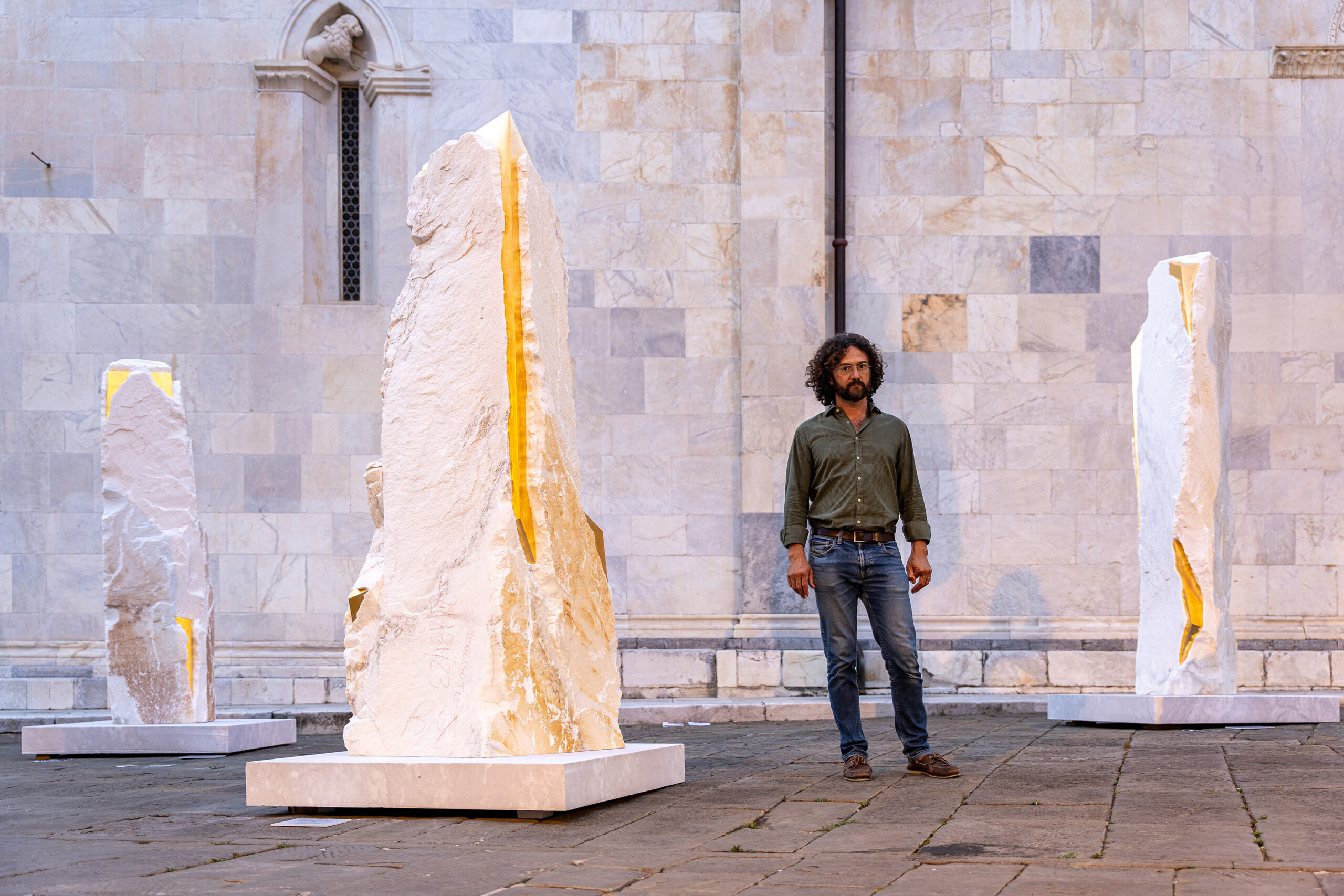 Ce groupe de trois sculptures a été spécialement conçu pour l’édition 2023 du festival White Carrara. Mattia Bosco commente ce projet : « Il était important pour moi de choisir un lieu où les sculptures que j’avais imaginées dans ma tête trouveraient les meilleures conditions pour prendre vie. Je me suis souvenu de la cathédrale de Carrare, avec son emplacement inhabituel, en retrait, avec une façade presque cachée par les maisons. Son long flanc en marbre, dépourvu de fenêtres – à l’exception d’une petite porte latérale – constituait la toile de fond parfaite pour une vue imprenable sur les sculptures. »