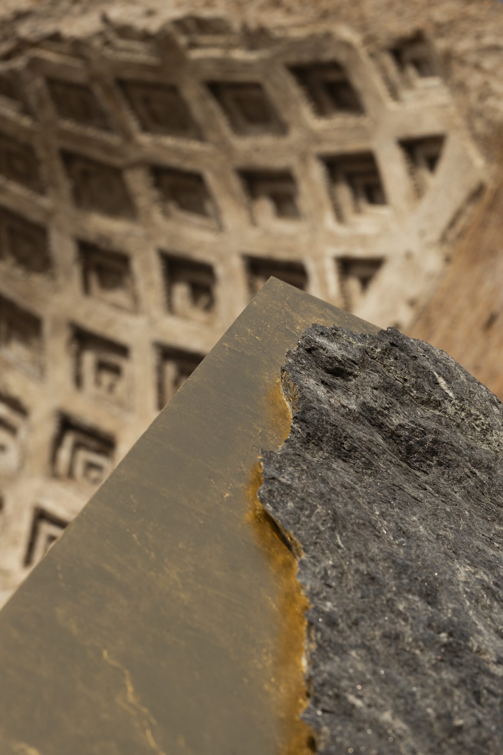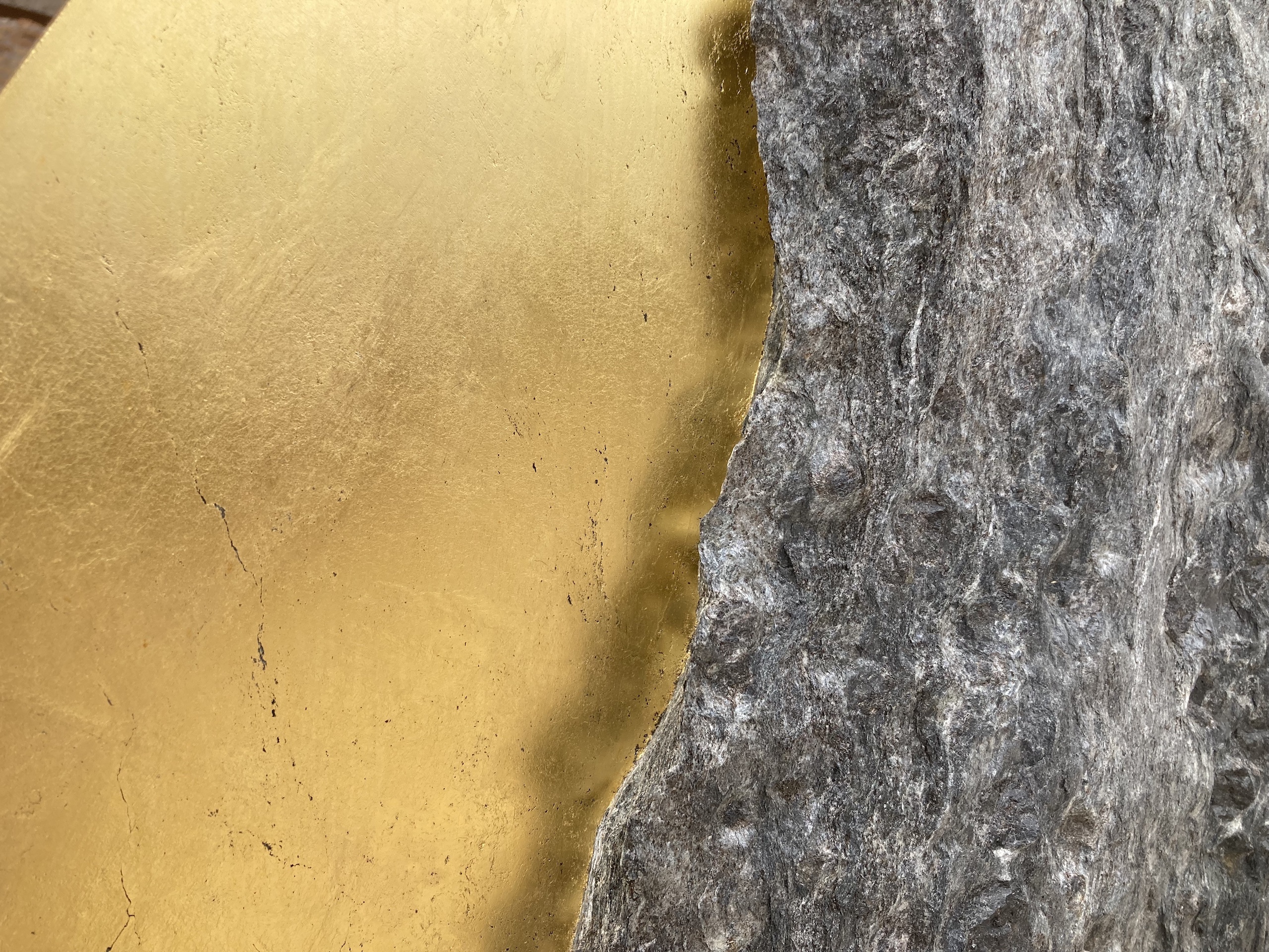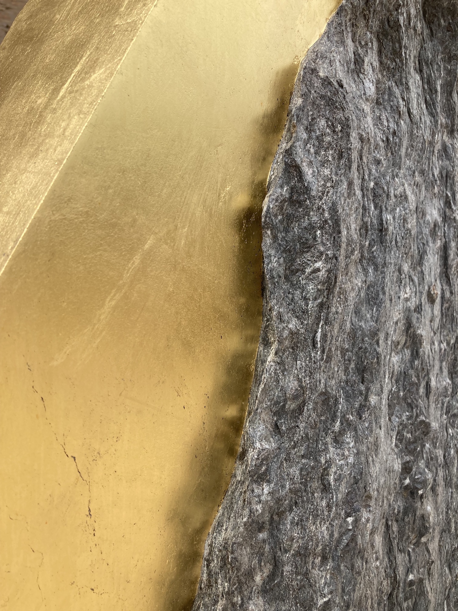 Afin d’accentuer certaines formes et lignes de la pierre, l’artiste applique de la feuille d’or. Cette série d’œuvres d’art, appelée « Sezione Aurea », est née de l’observation des pierres contenant du mica. Grâce à ce minéral faisant scintiller la pierre, l’artiste a décidé de cristalliser cette présence aurifère avec de la feuille d’or. Pour Mattia Bosco, si la pierre est une incarnation solide du temps, l’or s’apparente à de la lumière à l’état solide.