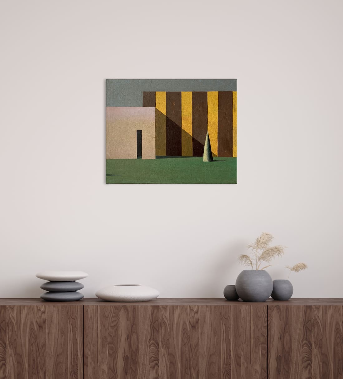 Dans ses peintures, l’artiste établit un dialogue entre l’architecture et le paysage, dans une figuration soumise à la géométrie et une atmosphère toujours énigmatique. La conception de ces espaces et la simplification des formes (poussée jusqu’aux limites de l’abstraction) traduisent une conception théâtrale de l’architecture.