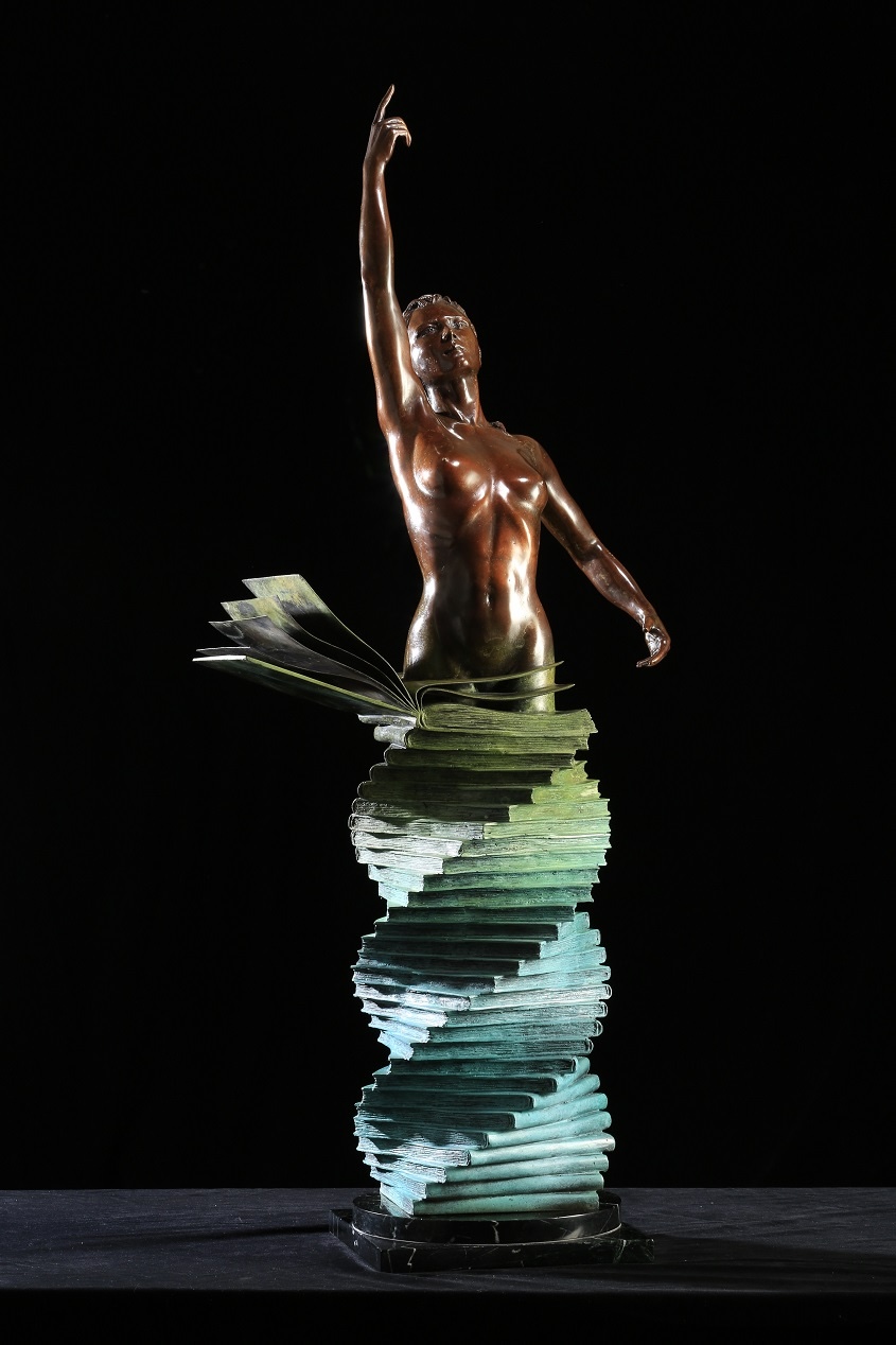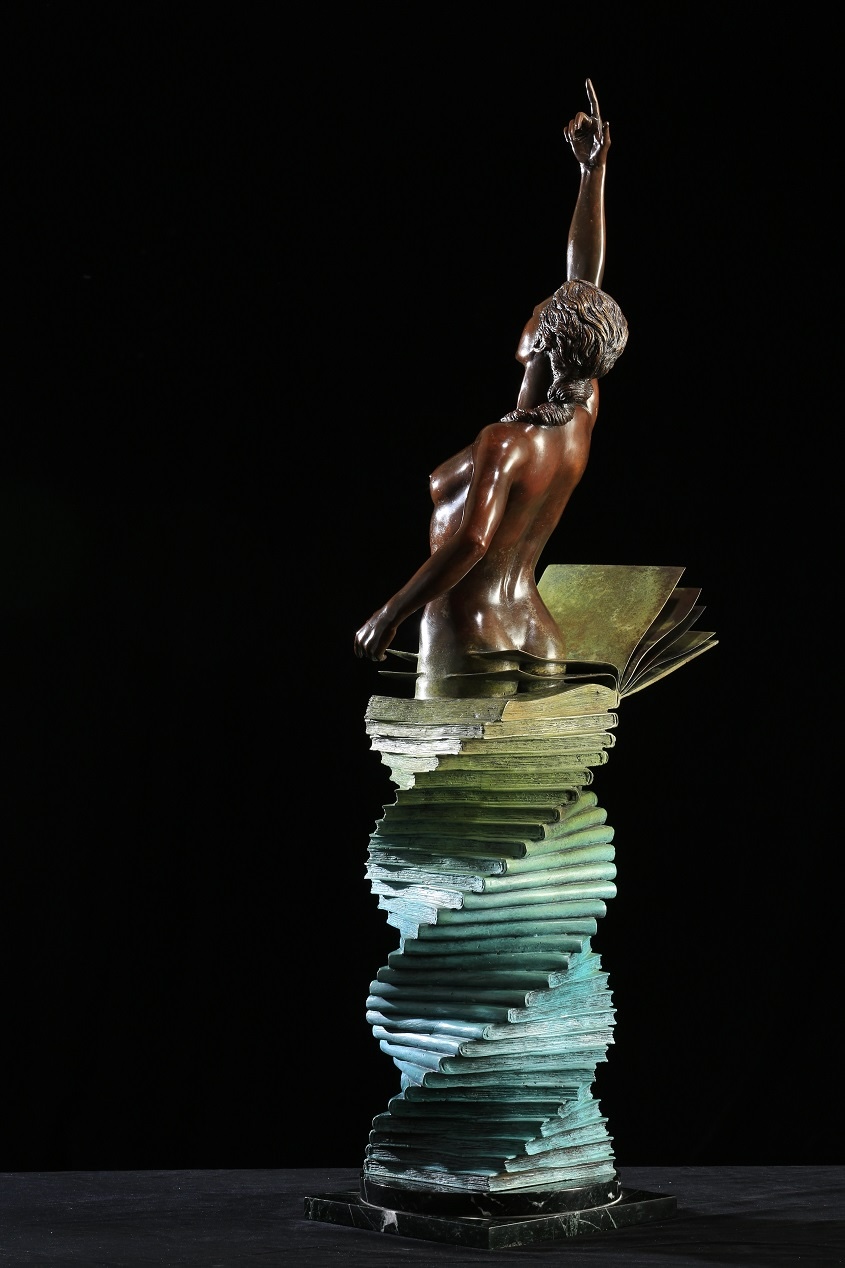 Description: Sculpture en bronze. Patine verte sur socle en marbre fait de livres.