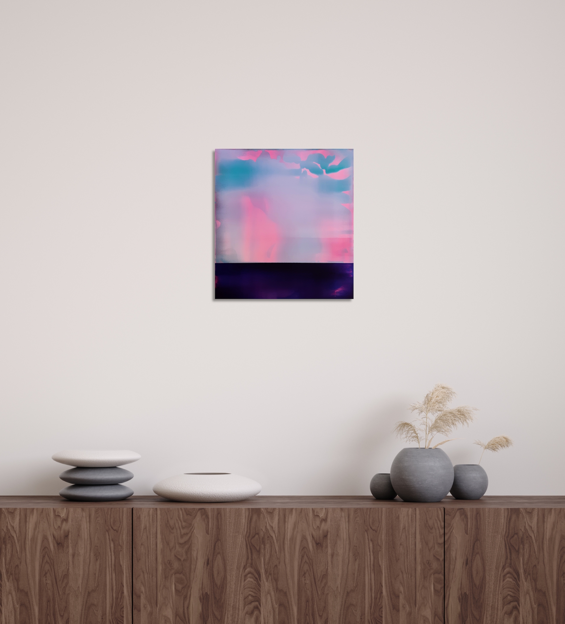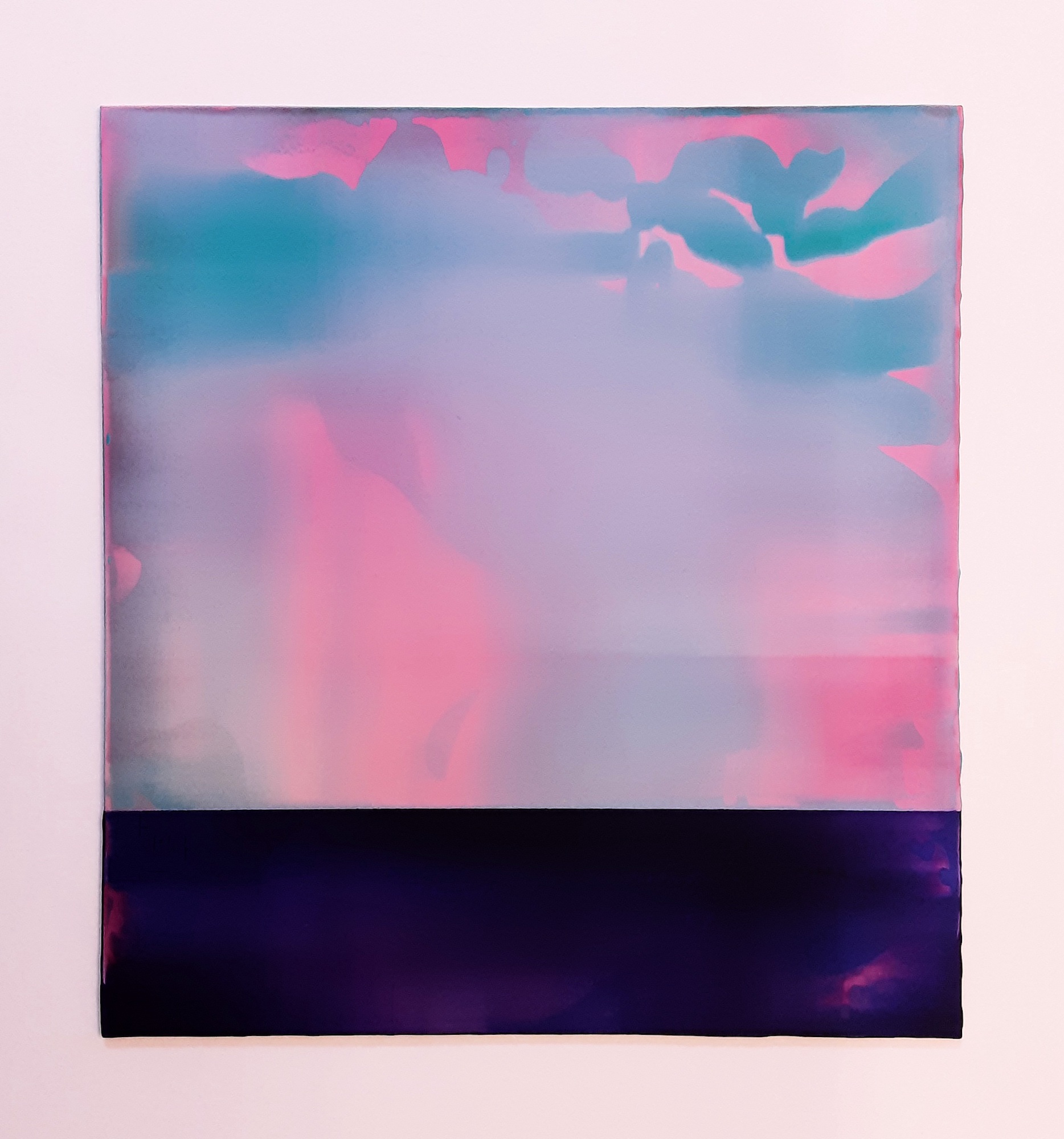 Les peintures abstraites de James Lumsden explorent les thèmes de la lumière, de la couleur et de la profondeur. Son processus créatif consiste à superposer sur la toile, ou sur le papier comme pour cette œuvre, des dizaines de couches fines de peinture acrylique. La peinture est travaillé avec des outils spécifiques afin de dissimuler ou faire émerger des traces et des marques. Couche après couche, l’artiste parvient à créer une illusion de profondeur et de lumière intérieure au tableau qui plonge l’observateur dans un univers mystérieux et séduisant.