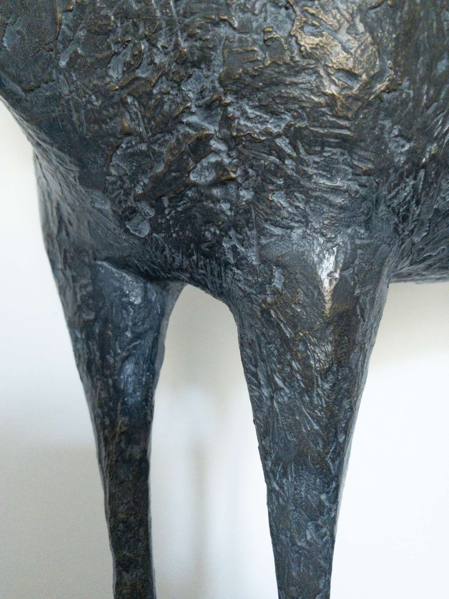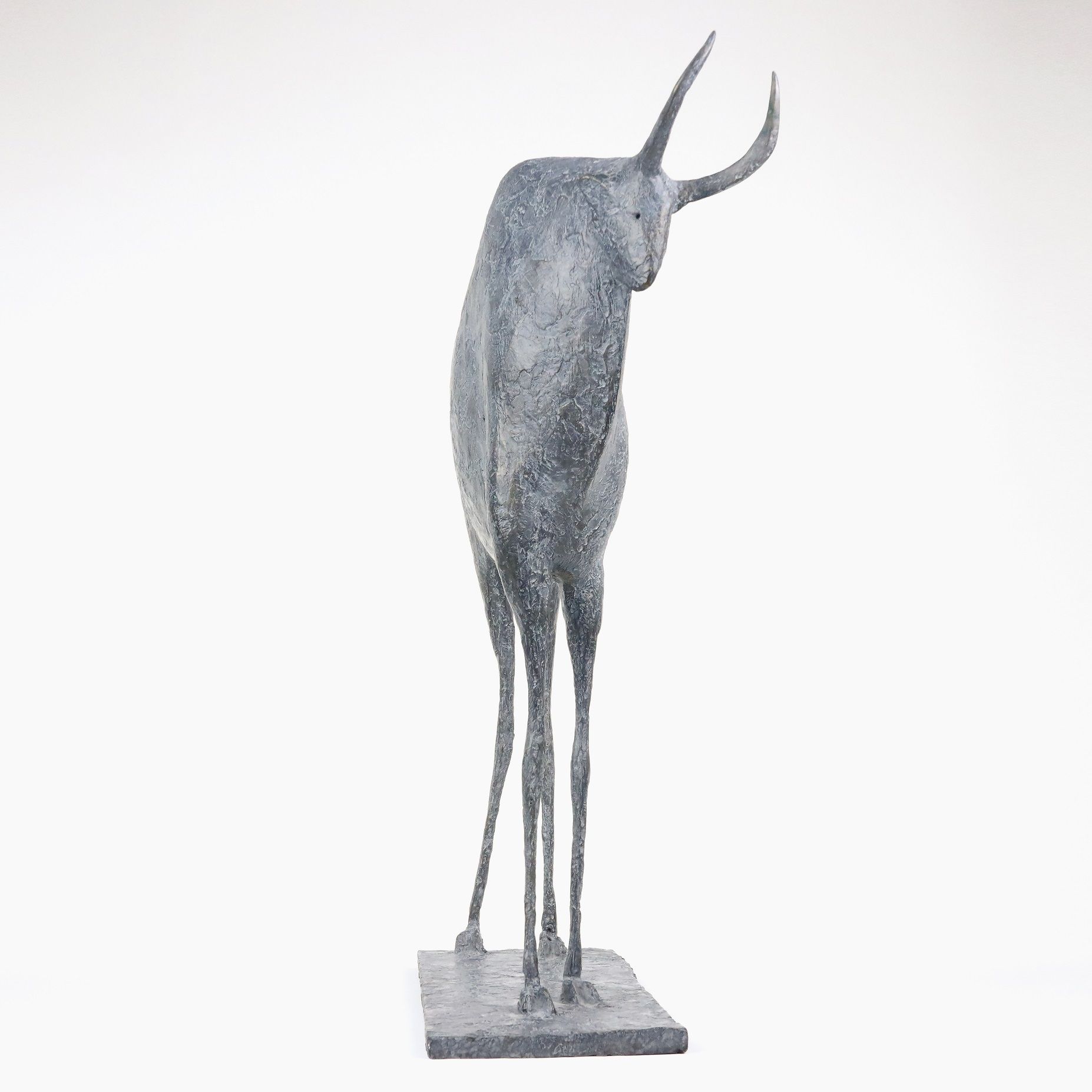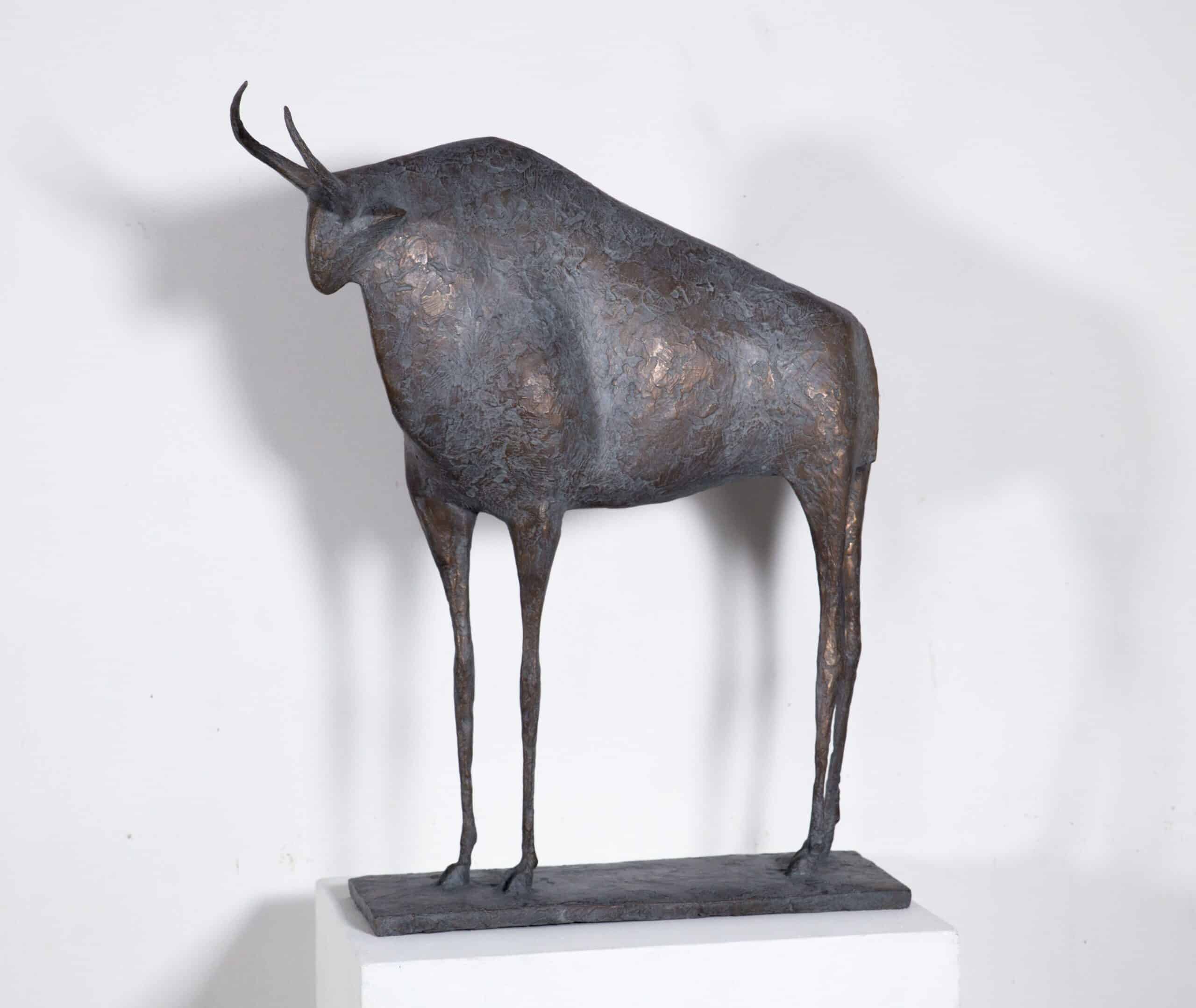 « Le Taureau est le seul animal masculin de mon bestiaire. Sa présence silencieuse et sereine s’impose par son torse massif, supporté par de longues pattes qui accentuent la fragilité de son équilibre. Sa petite tête est couronnée de longues cornes qui n’évoquent ici ni violence ni agressivité. Toute l’énergie de l’animal est contenue dans la tension des volumes. Il symbolise à mes yeux la force protectrice de la nature. »