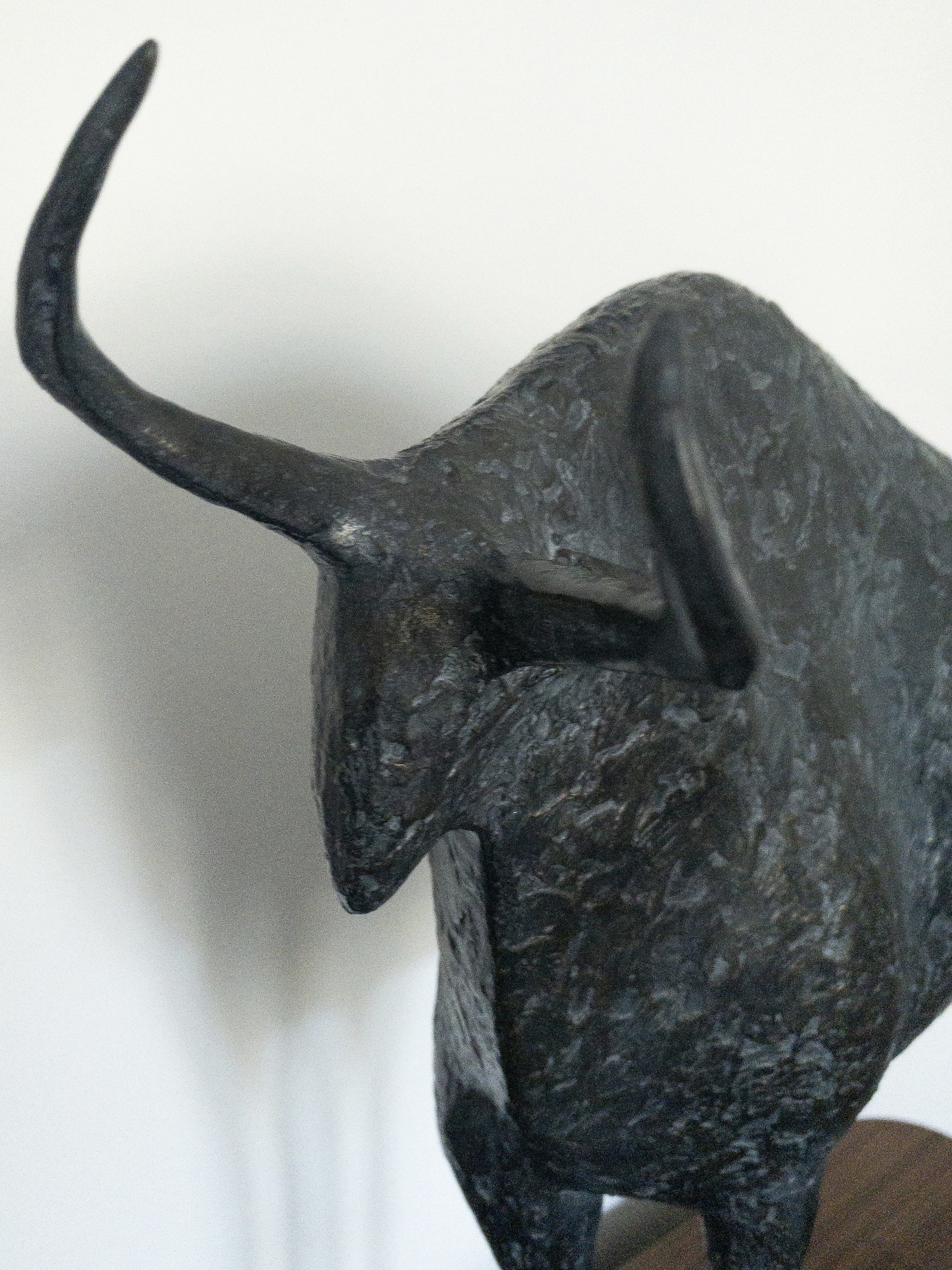 Cette sculpture en bronze représente un taureau, symbole de la puissance animale. Il est ici montré avec beaucoup d’élégance, son dos formant une courbe que prolongent ses longues cornes. La généreuse musculature de son poitrail contraste avec la finesse de ses jambes, qui semblent fragiliser son équilibre.