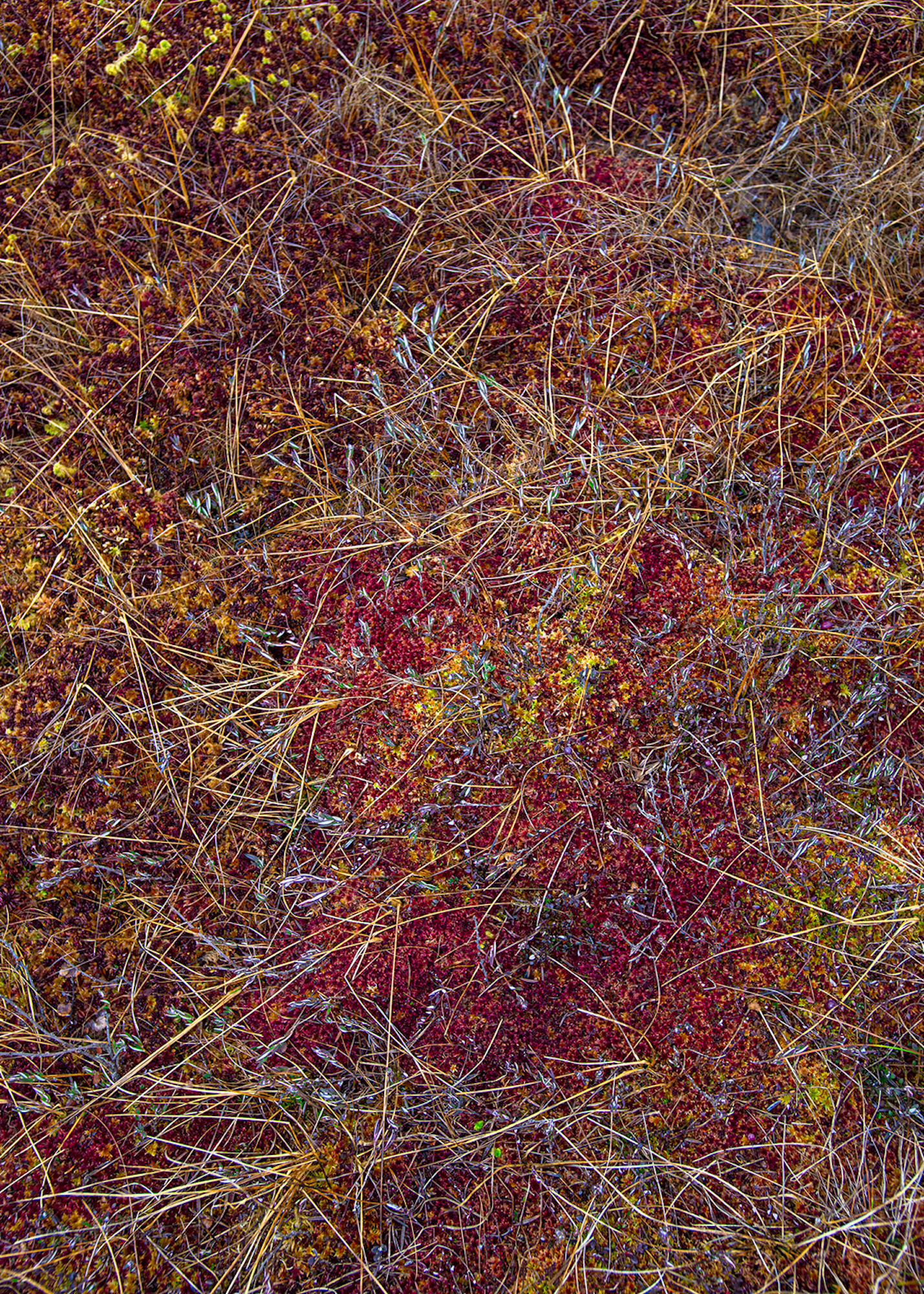 Cette photographie aérienne fait partie de la série « The Bog Plants », qui présente des images en gros plan de plantes et de feuilles dans les marais estoniens. Les marais d’Estonie sont énigmatiques, vastes et vierges, et offrent des surprises inattendues. Vus d’en haut, ces paysages sont psychédéliques et poétiques. Ces marais sont souvent protégés par des parcs nationaux tels que le parc national de Lahemaa. Les anciennes zones d’extraction de la tourbe sont reconverties en marais, mais l’extraction de la tourbe à grande échelle en Estonie détruit les tourbières naturelles. Les tourbières sont très importantes pour le stockage du dioxyde de carbone, car elles ont la capacité de stocker six fois plus de CO2 que les forêts.
