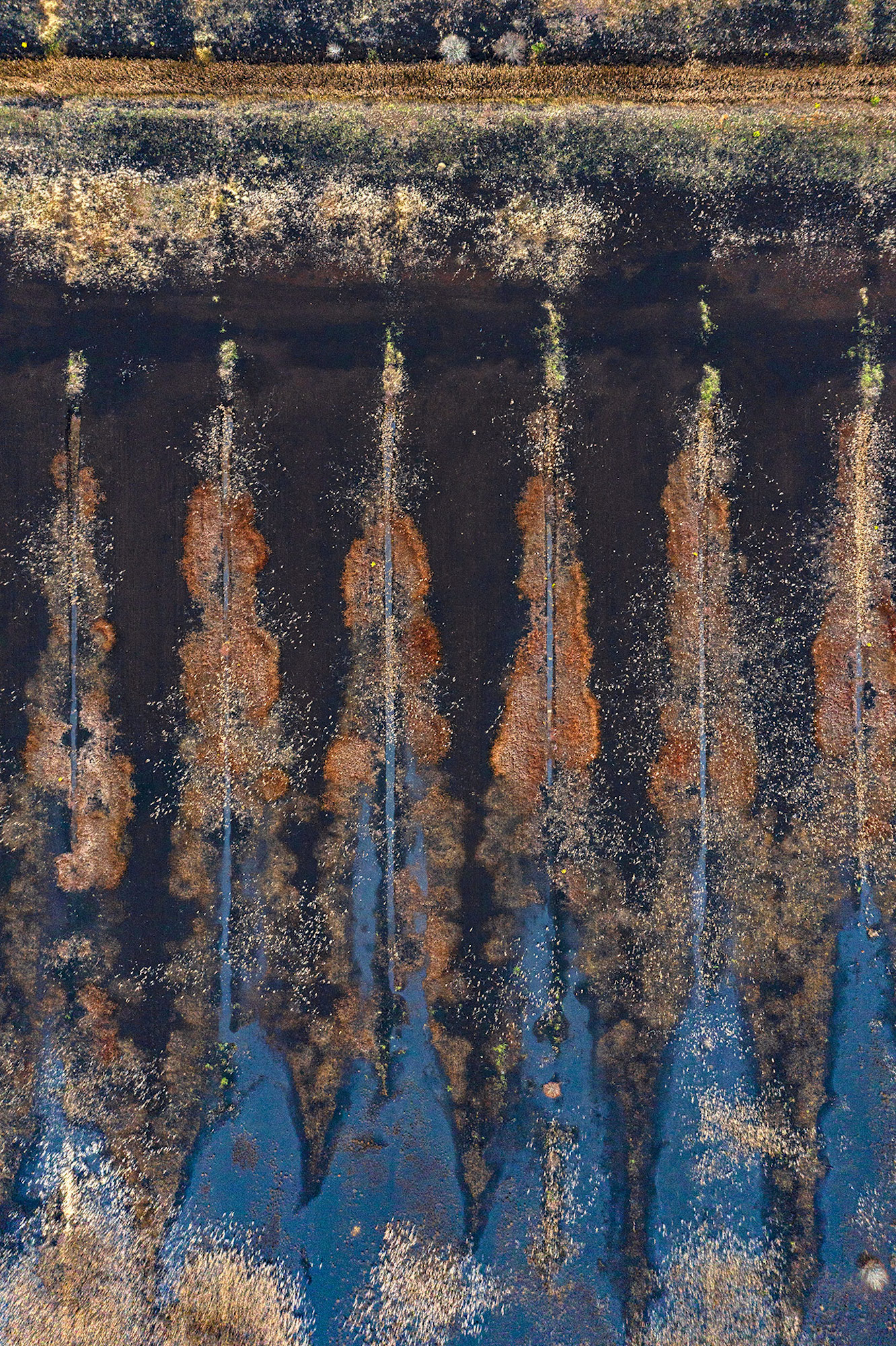 Cette photographie aérienne fait partie de la série « The Bog », présentant des paysages de tourbière en Estonie. Les marais d’Estonie sont énigmatiques, vastes et vierges, et offrent des surprises inattendues. Vus d’en haut, ces paysages sont psychédéliques et poétiques. Ces marais sont souvent protégés par des parcs nationaux tels que le parc national de Lahemaa. Les anciennes zones d’extraction de la tourbe sont reconverties en marais, mais l’extraction de la tourbe à grande échelle en Estonie détruit les tourbières naturelles. Les tourbières sont très importantes pour le stockage du dioxyde de carbone, car elles ont la capacité de stocker six fois plus de CO2 que les forêts.
