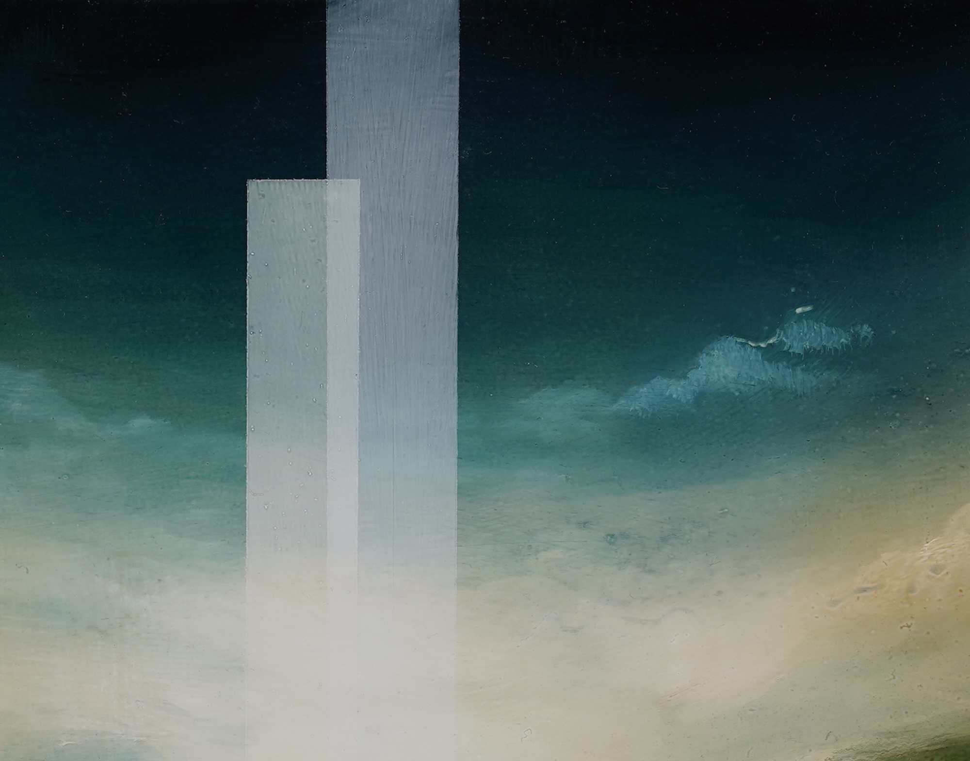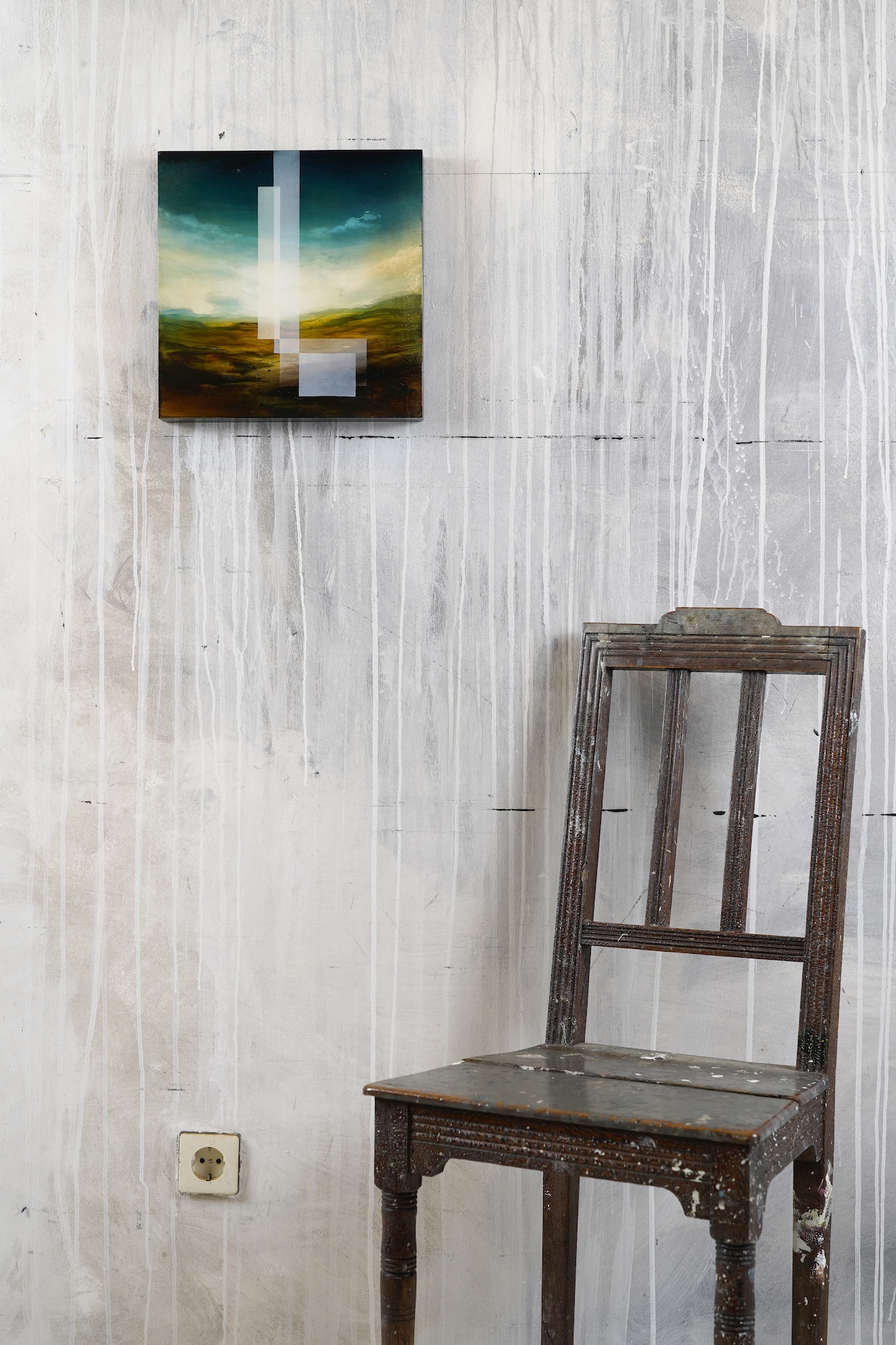 Situées entre abstraction et figuration, les œuvres de Joachim Van der Vlugt sont composées autour d’un travail de la lumière. Tandis que les motifs peints laissent au spectateur la possibilité d’identifier un lieu onirique, le travail de la lumière structure l’œuvre et en fait émerger un sentiment captivant en créant une atmosphère de réalité. Les formes géométriques qui se superposent au milieu du tableau, comme autant indices d’une réalité altérée, incarnent cet accord tacite d’illusion picturale que le peintre entretient avec ses spectateurs de ses peintures. Le travail de Joachim van der Vlugt est définitivement inspiré des grands maîtres néerlandais classiques. A l’aide d’une palette de couleurs volontairement réduite et sombre, du noir et du blanc, du brun, du beige et du bleu, l’artiste travaille la peinture en multipliant les couches.