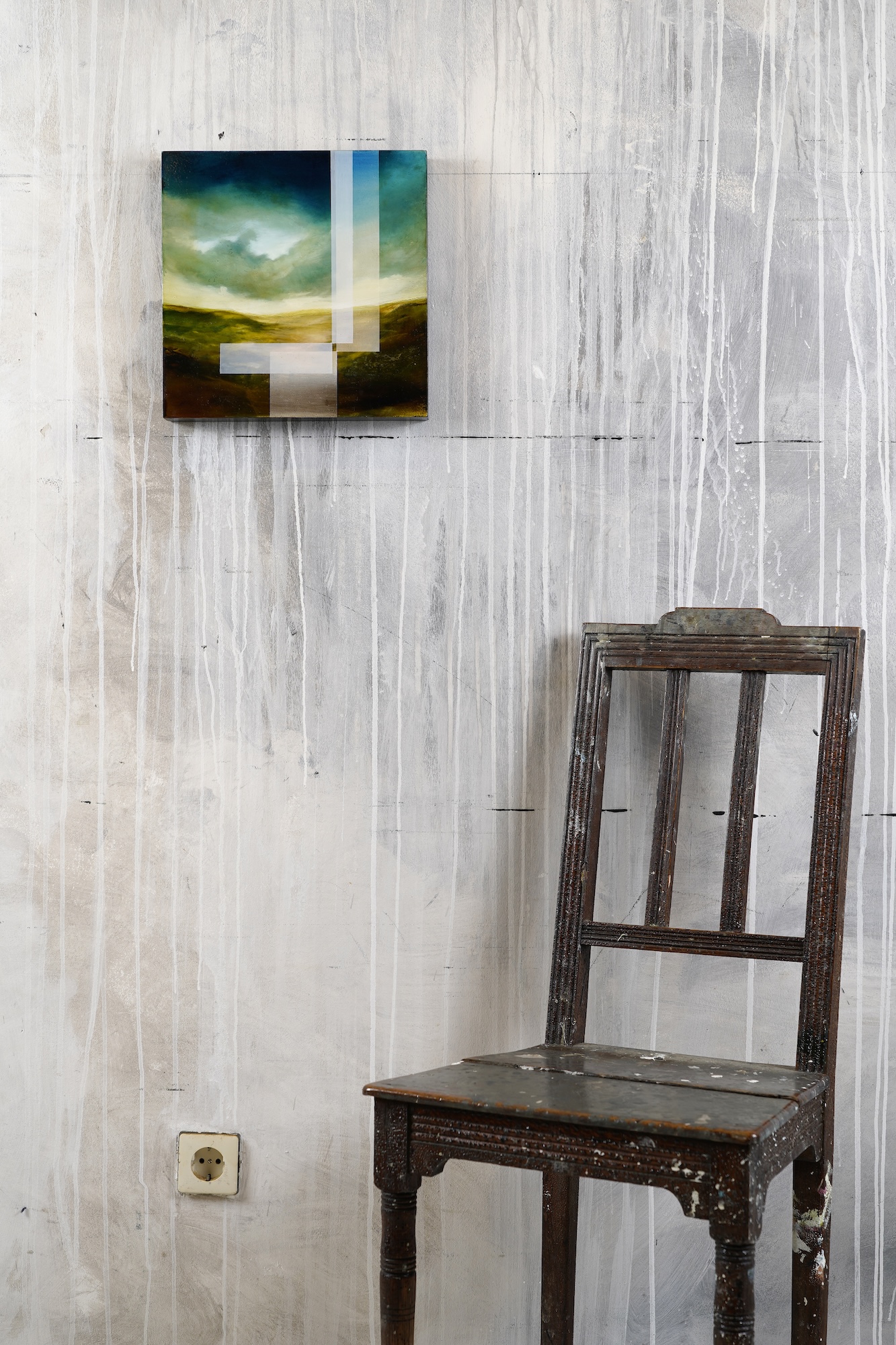 Situées entre abstraction et figuration, les œuvres de Joachim Van der Vlugt sont composées autour d’un travail de la lumière. Tandis que les motifs peints laissent au spectateur la possibilité d’identifier un lieu onirique, le travail de la lumière structure l’œuvre et en fait émerger un sentiment captivant en créant une atmosphère de réalité. Les formes géométriques qui se superposent au milieu du tableau, comme autant indices d’une réalité altérée, incarnent cet accord tacite d’illusion picturale que le peintre entretient avec ses spectateurs de ses peintures. Le travail de Joachim van der Vlugt est définitivement inspiré des grands maîtres néerlandais classiques. A l’aide d’une palette de couleurs volontairement réduite et sombre, du noir et du blanc, du brun, du beige et du bleu, l’artiste travaille la peinture en multipliant les couches.