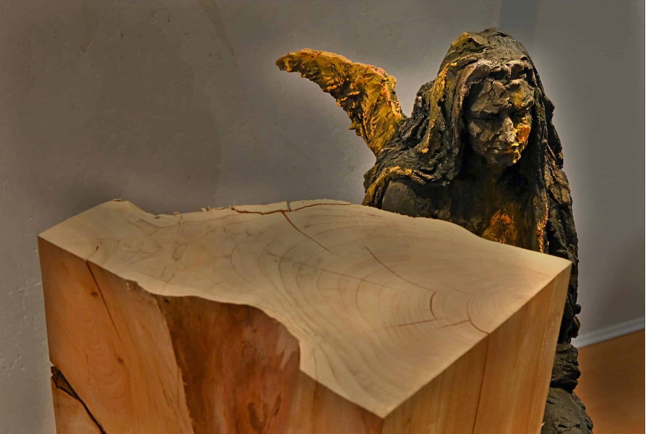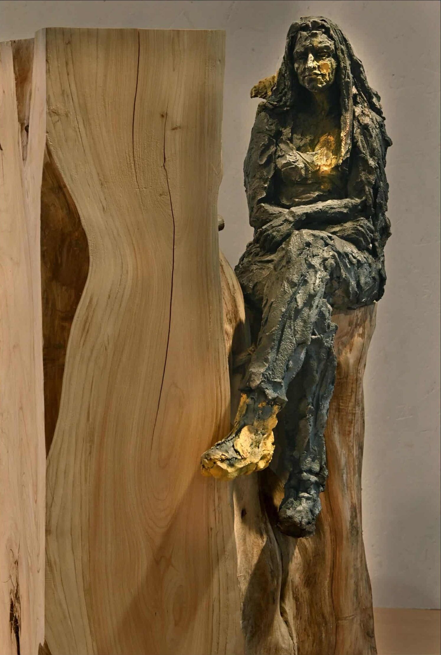 | Description | Sculpture en grès enfumé, socle en cyprès, pigment |
