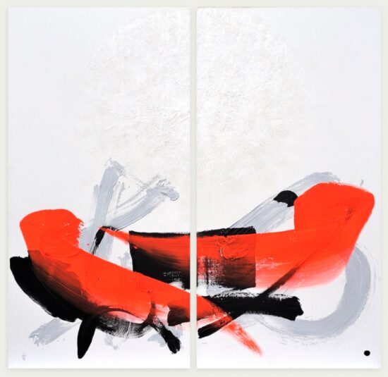 Cette œuvre d’art abstraite s’inspire de la calligraphie japonaise, mêlant l’esthétique traditionnelle à l’expression contemporaine. Réalisée à l’acrylique, elle présente une palette sobre de tons gris contrastés par d’audacieux accents de rouge. Les coups de pinceau – à la fois vigoureux et gracieux – restent nettement visibles, capturant l’immédiateté du geste de l’artiste. La toile de fond, rendue dans des gris dilués, sert de scène silencieuse, permettant au rouge dense et vibrant de rayonner avec intensité. Ce jeu d’opacité et de transparence semble dégager une énergie vitale, insufflant une tension dynamique à la composition.