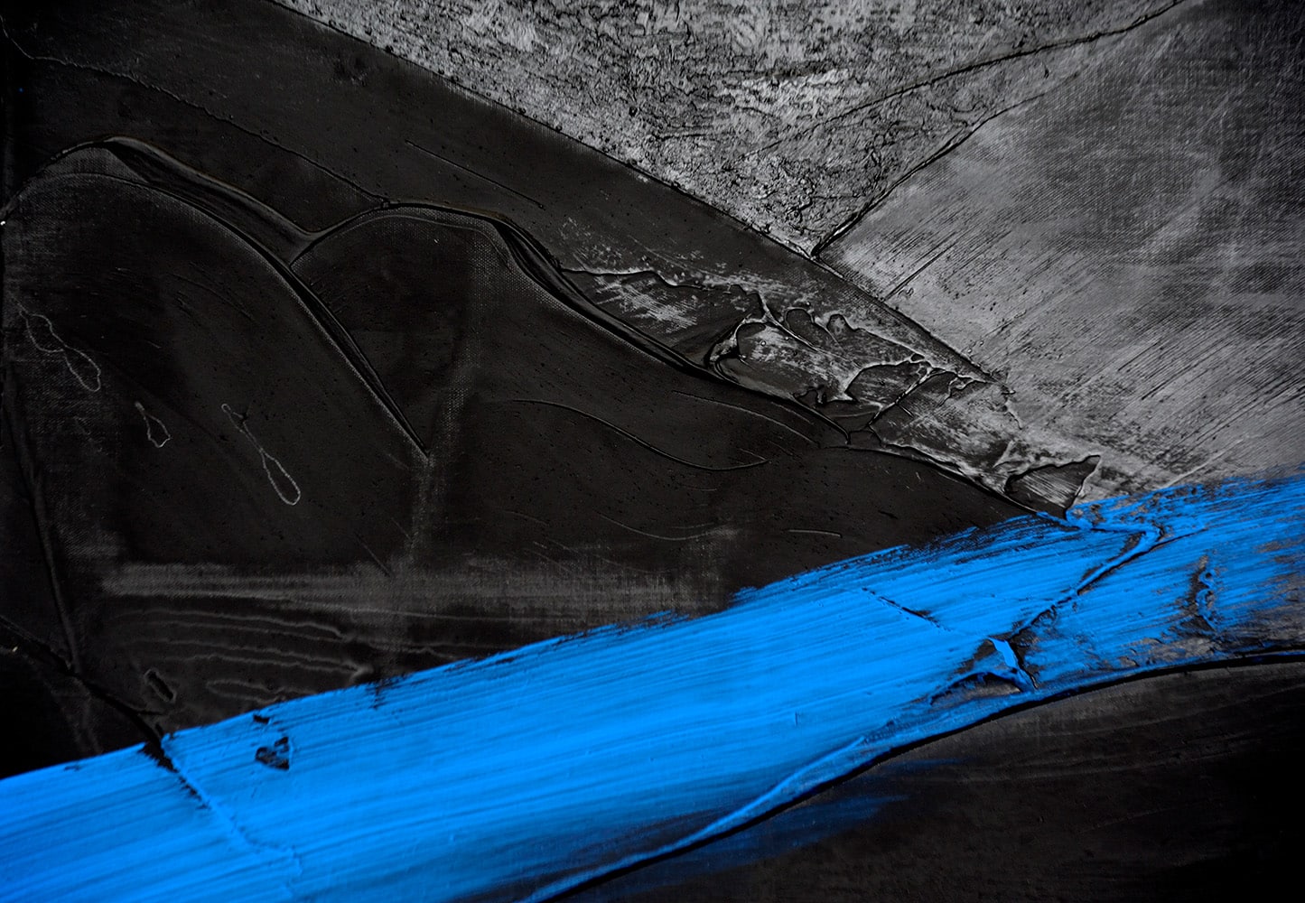 Cette œuvre d’art appartient à un registre abstrait et puise ses ressources dans la calligraphie japonaise. Le noir et le bleu sont les uniques teintes de cette peinture réalisée à l’encre et à l’acrylique. Les coups de pinceau, vigoureux et en même temps élégants, sont bien visibles et suggèrent la gestuelle du peintre. Une énergie se propage du contraste entre le noir sur le fond et le bleu, dont l’artiste a choisi une tonalité particulièrement brillante et vibrante.