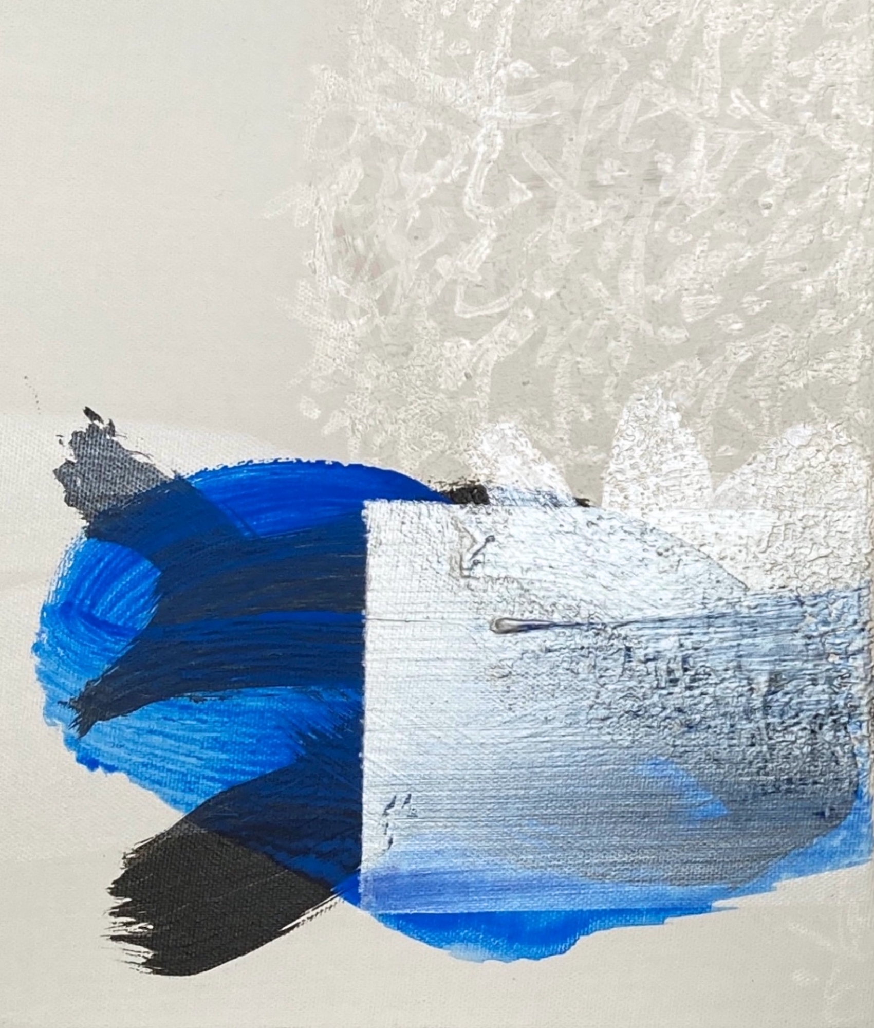Cette œuvre d’art appartient à un registre abstrait et puise ses ressources dans la calligraphie japonaise. Les coups de pinceau, vigoureux et en même temps élégants, sont bien visibles et suggèrent la gestuelle du peintre. Les couleurs noir, blanc et bleu se croisent sur la toile en créant des superpositions et des transparences. Cette peinture, réalisée à l’encre et à l’acrylique, semble diffuser une sorte d’énergie et en même temps inviter à la méditation.