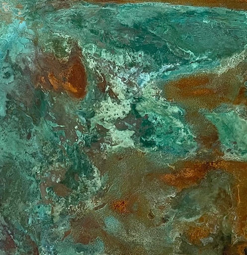Description: Feuilles de zinc et de bronze oxydées sur aluminium, patine fixée à la cire d'abeille