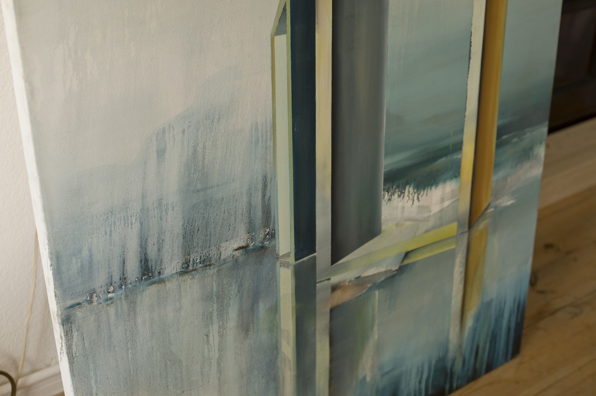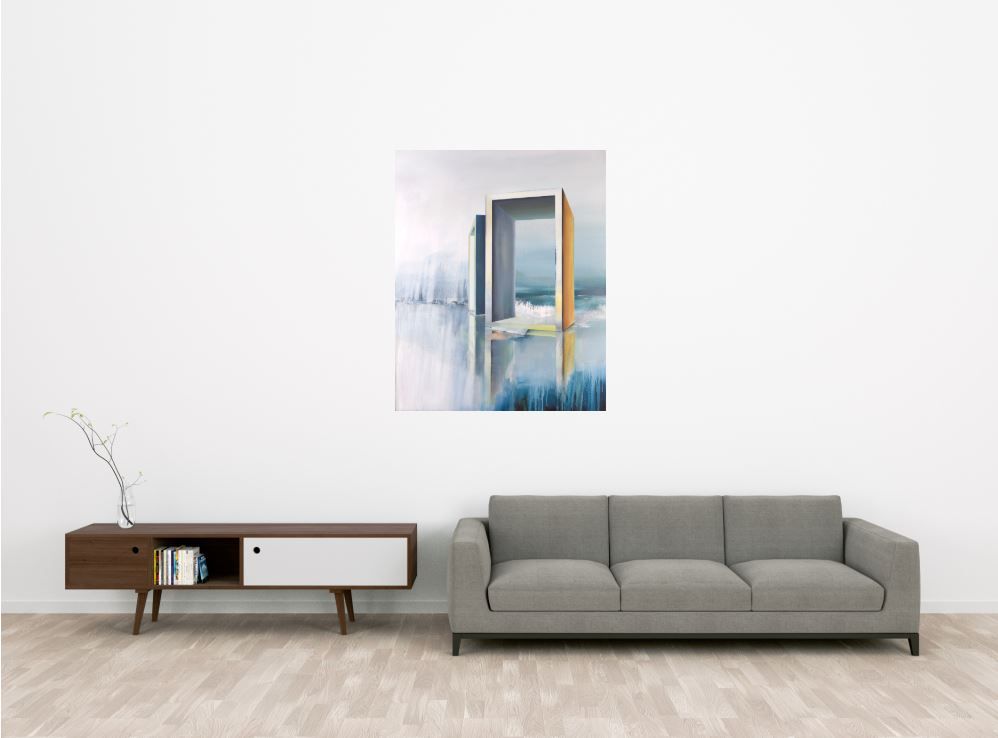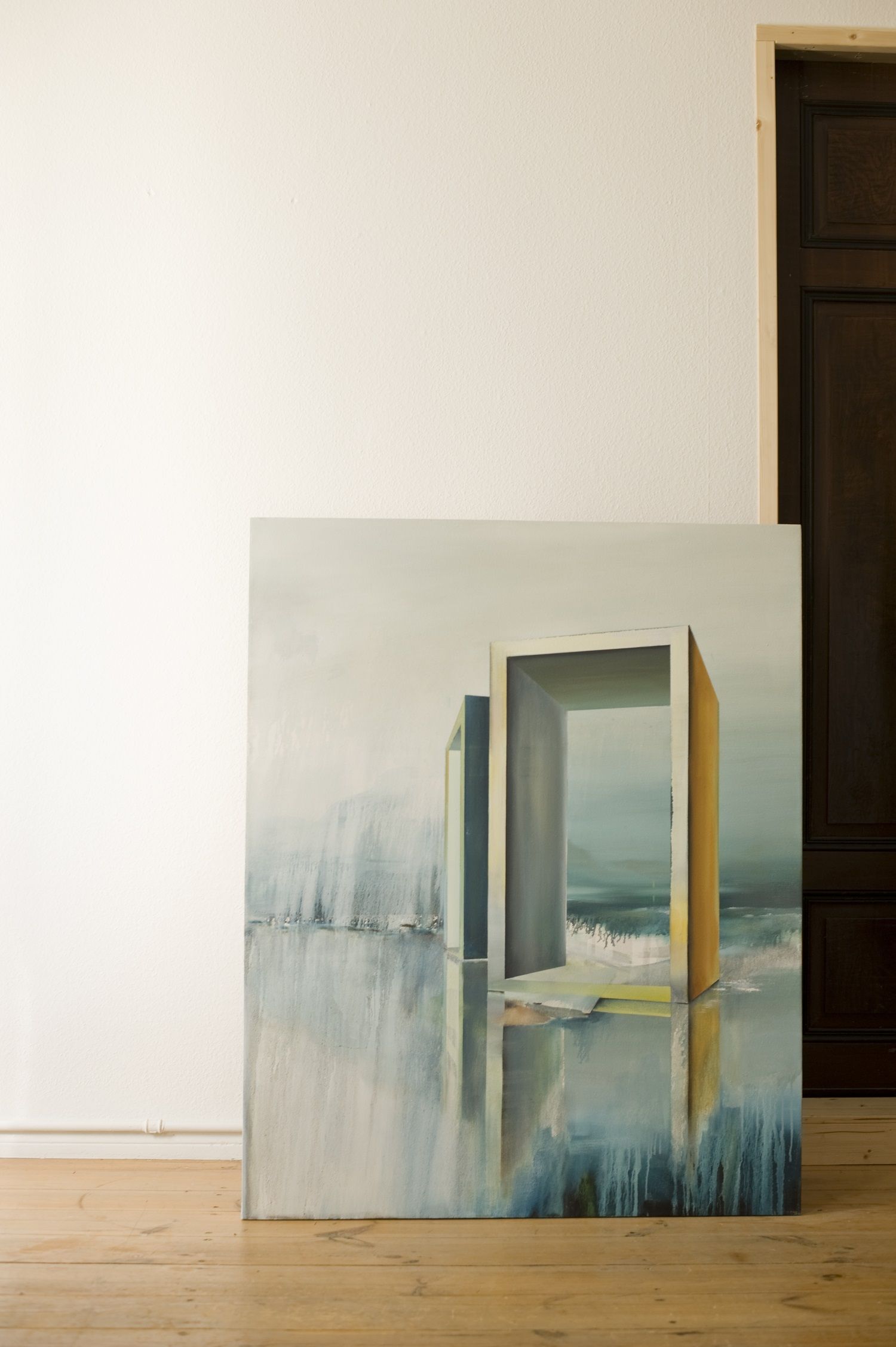Oscillant entre figuration et abstraction, cette œuvre d’art représente des éléments architecturaux qui se dressent au sein d’un paysage énigmatique aux couleurs froids et hivernaux. Ce tableau plonge le spectateur dans un univers onirique dénué de toute présence humaine. Pour donner de la profondeur à cette peinture, l’artiste joue sur les reflets. Les structures géométriques se réfléchissent dans une étendue d’eau ou de glace et s’ancrent dans la toile au point de devenir, selon l’artiste, des « îlots du paysage ». L’artiste opte aussi pour l’écoulement aléatoire de la peinture, technique qui lui est chère et bien identifiable sur ce tableau.