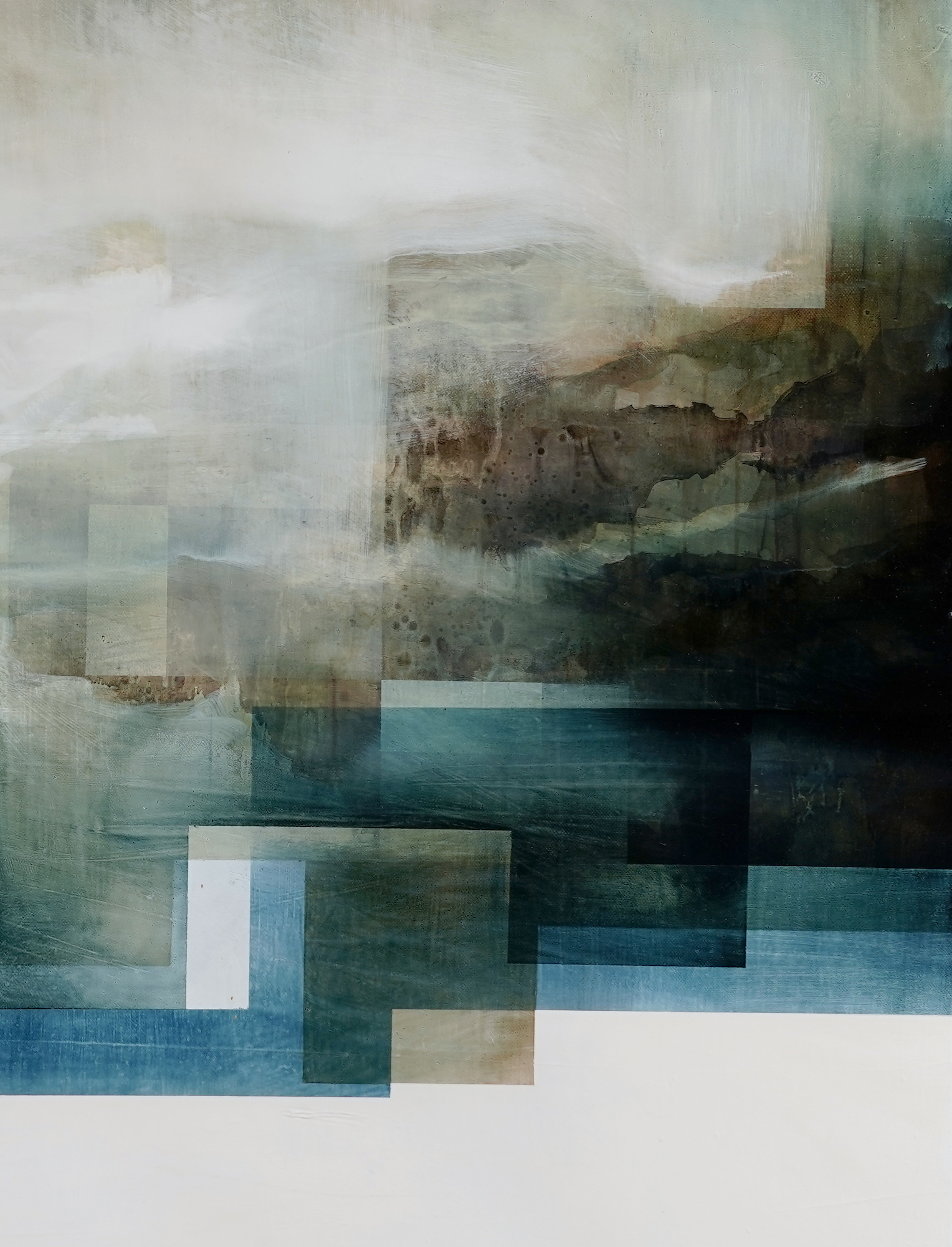 Situées entre abstraction et figuration, les œuvres de Joachim Van der Vlugt sont composées autour d’un travail de la lumière. Tandis que les motifs peints laissent au spectateur la possibilité d’identifier un lieu onirique, le travail de la lumière structure l’œuvre et en fait émerger un sentiment particulier et captivant en créant une atmosphère de réalité. Les formes géométriques qui se superposent au milieu du tableau, comme autant indices d’une réalité altérée, incarnent cet accord tacite d’illusion picturale que le peintre entretient avec ses spectateurs de ses peintures. Ici, couleurs sombres et couleurs plus claires se combinent et participent à créer un paysage qui rappelle les vagues de la mer.